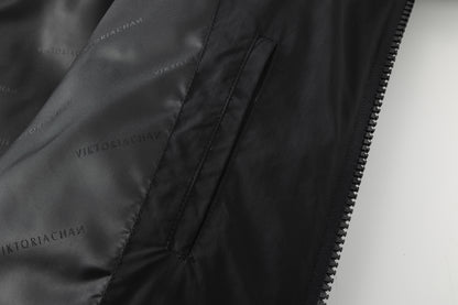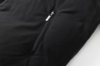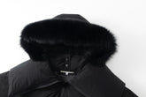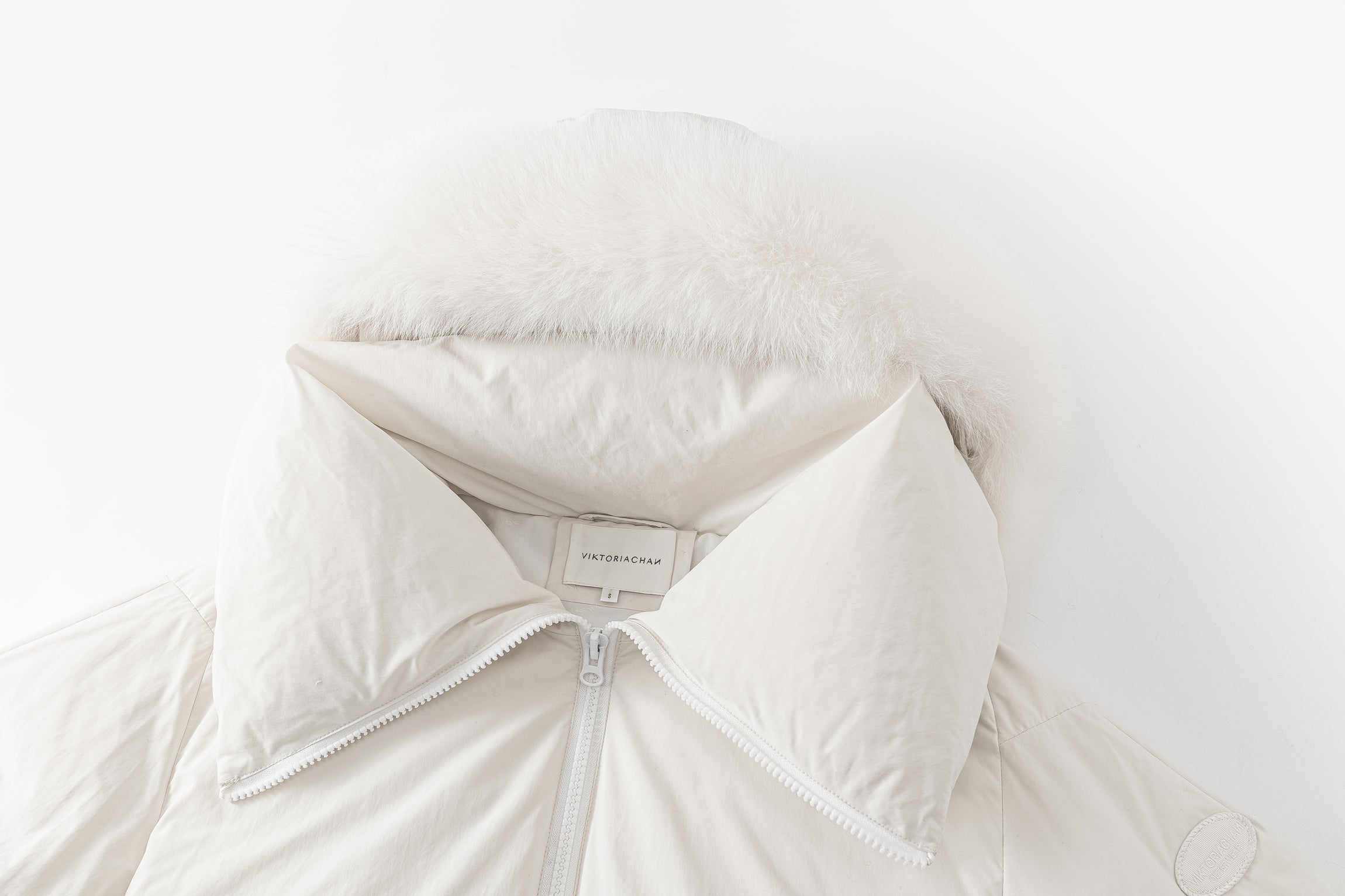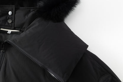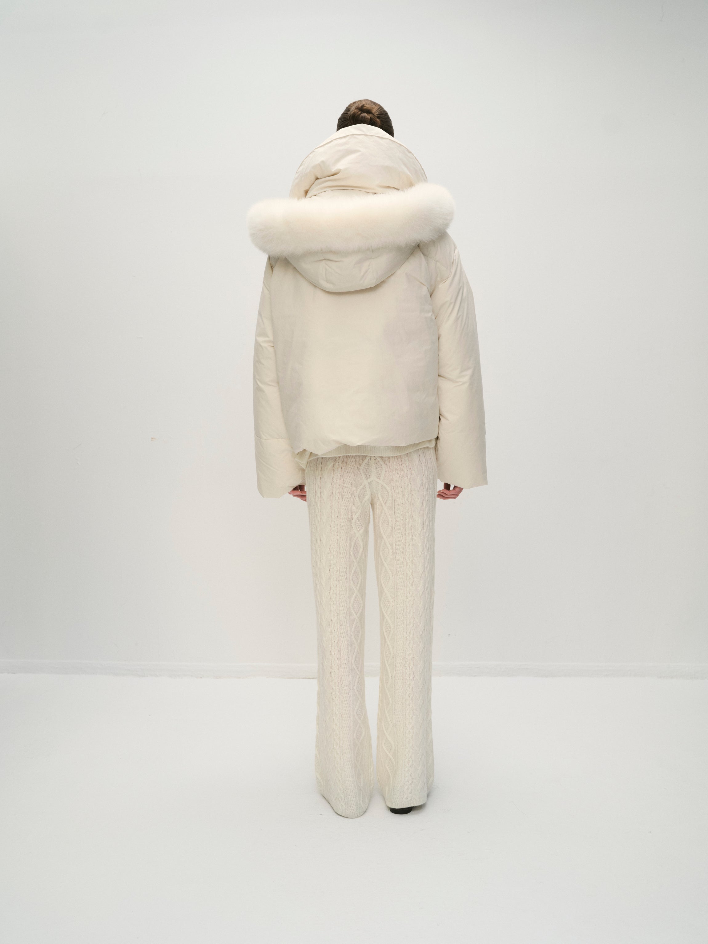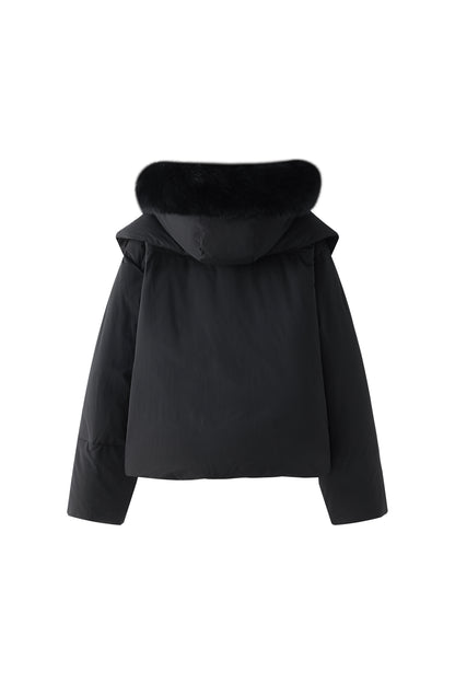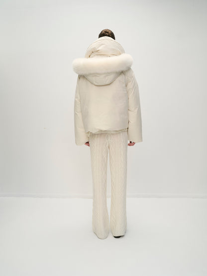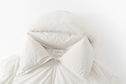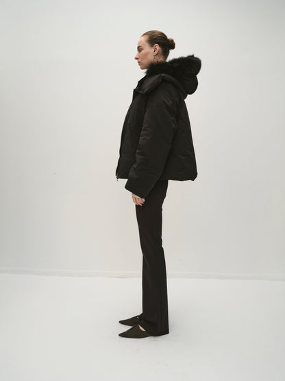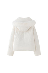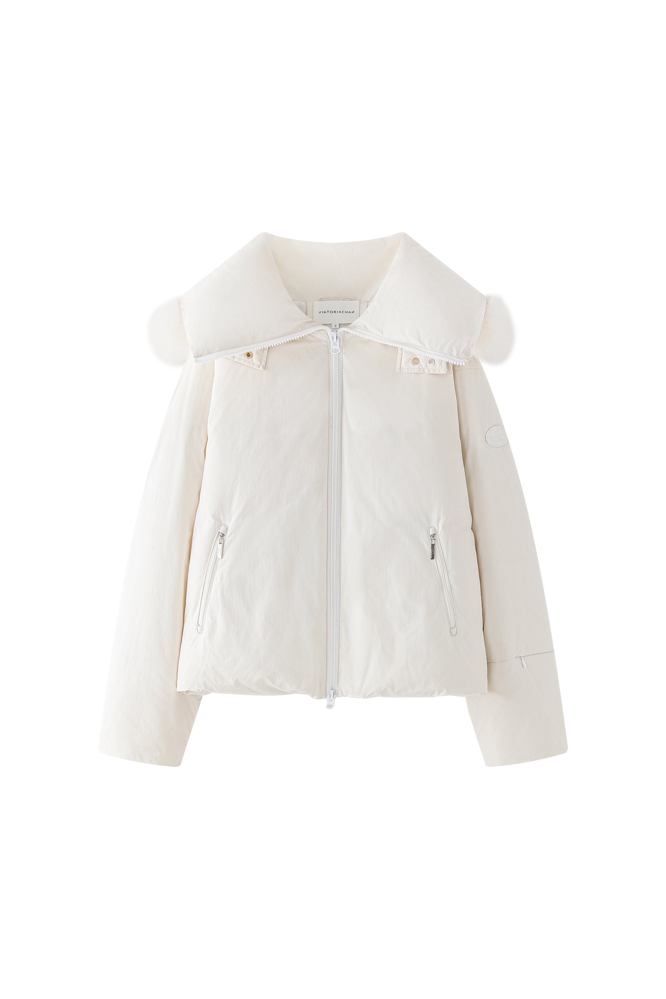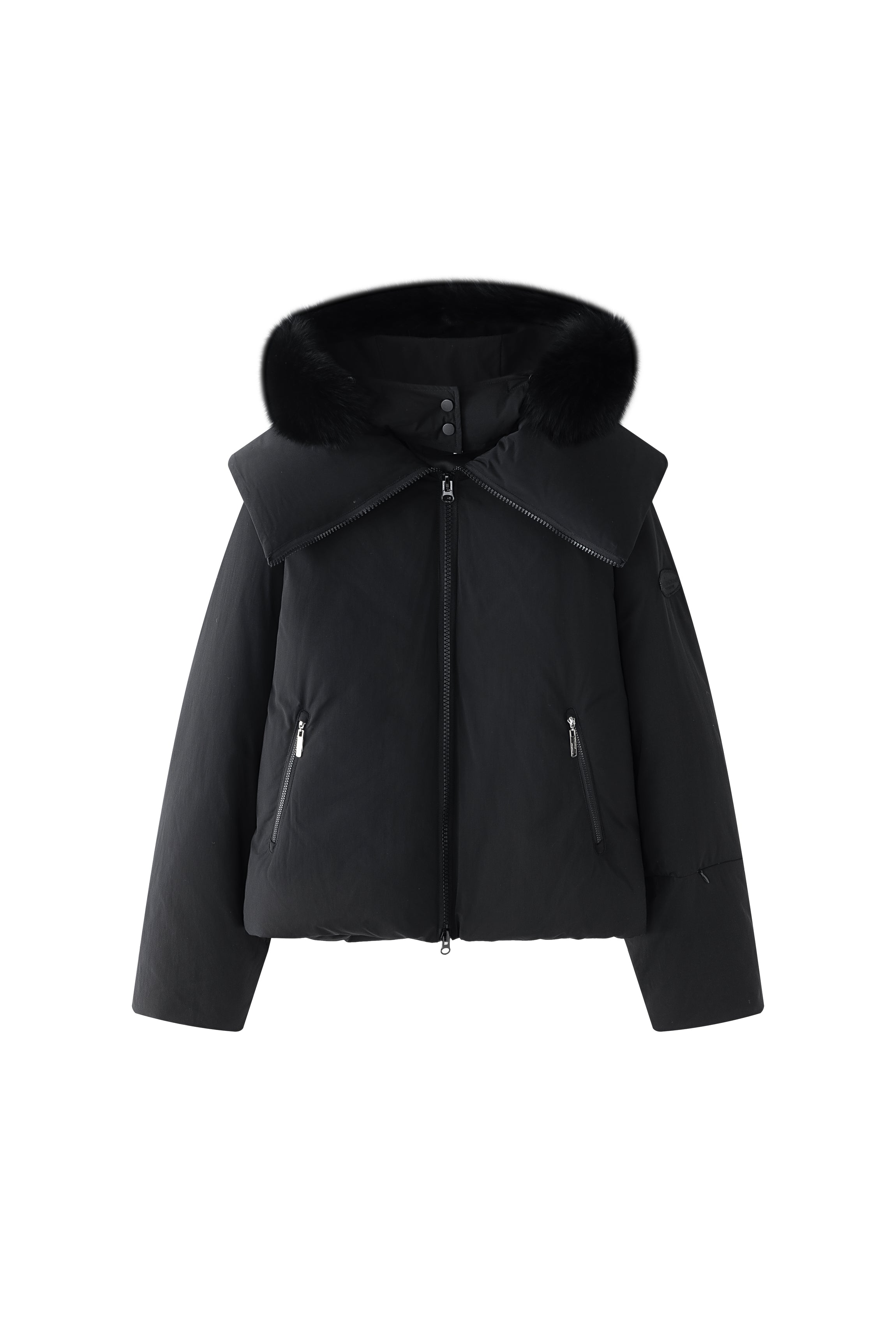 Short puffer jacket with a large zip collar for a cozy fit. Hood with fur. Logo patch on the upper part of the sleeves and side pockets