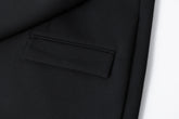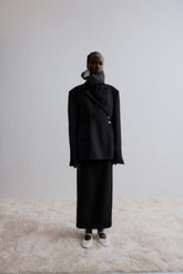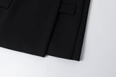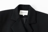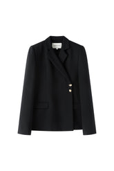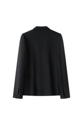 Elevate your wardrobe with this sophisticated black wool blend blazer featuring an asymmetrical side closure for a modern twist on a classic design. The front is adorned with two elegant...