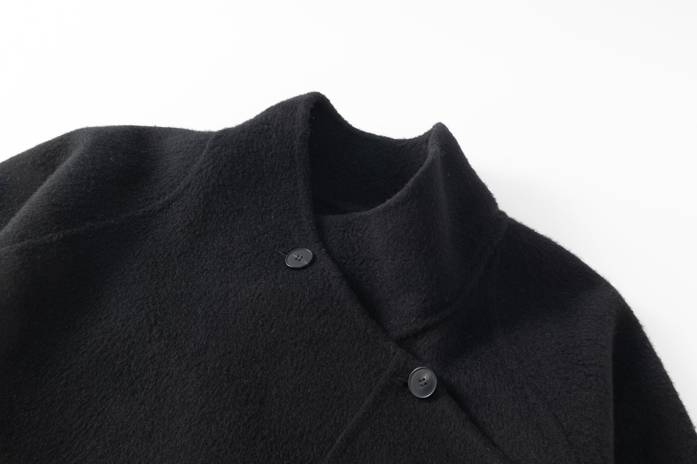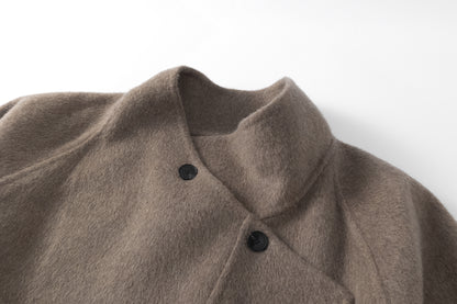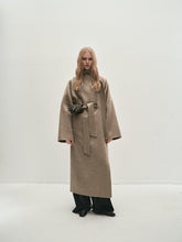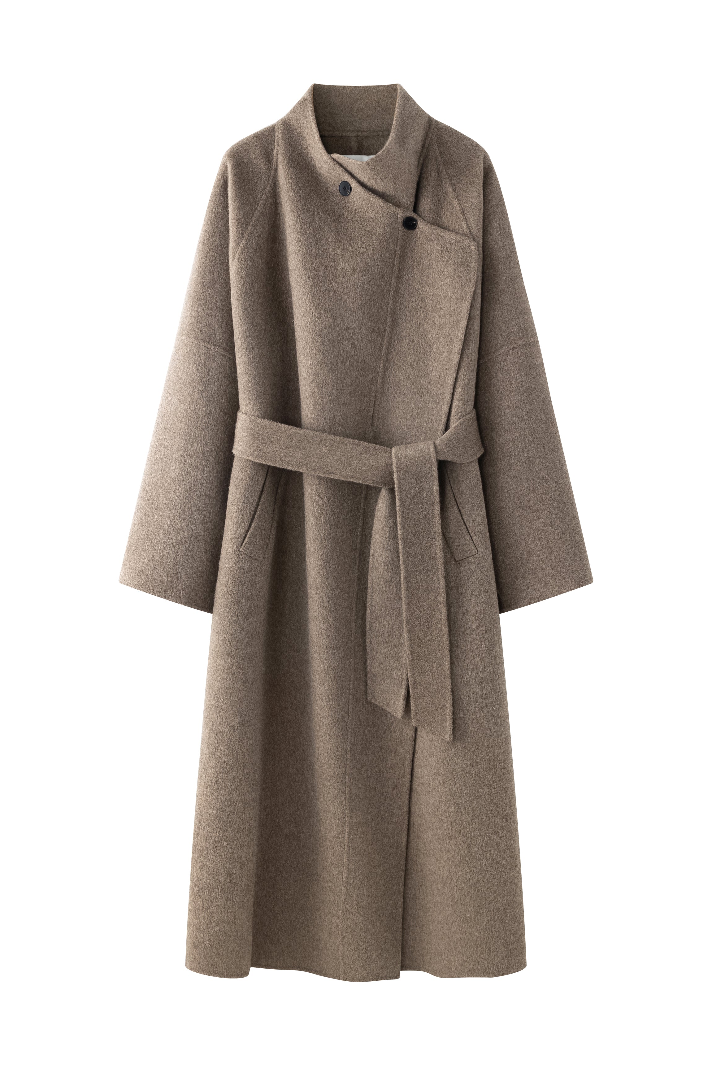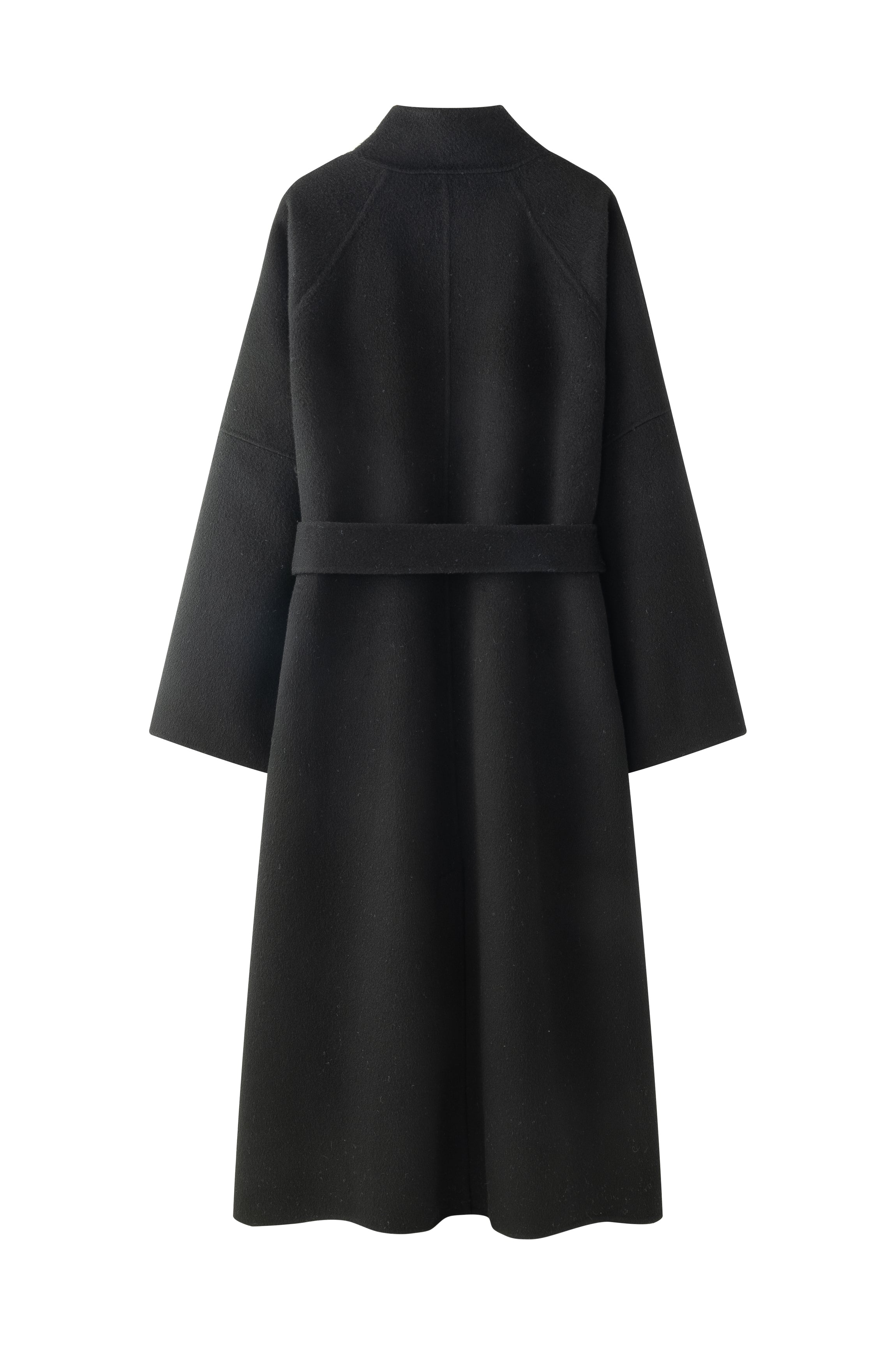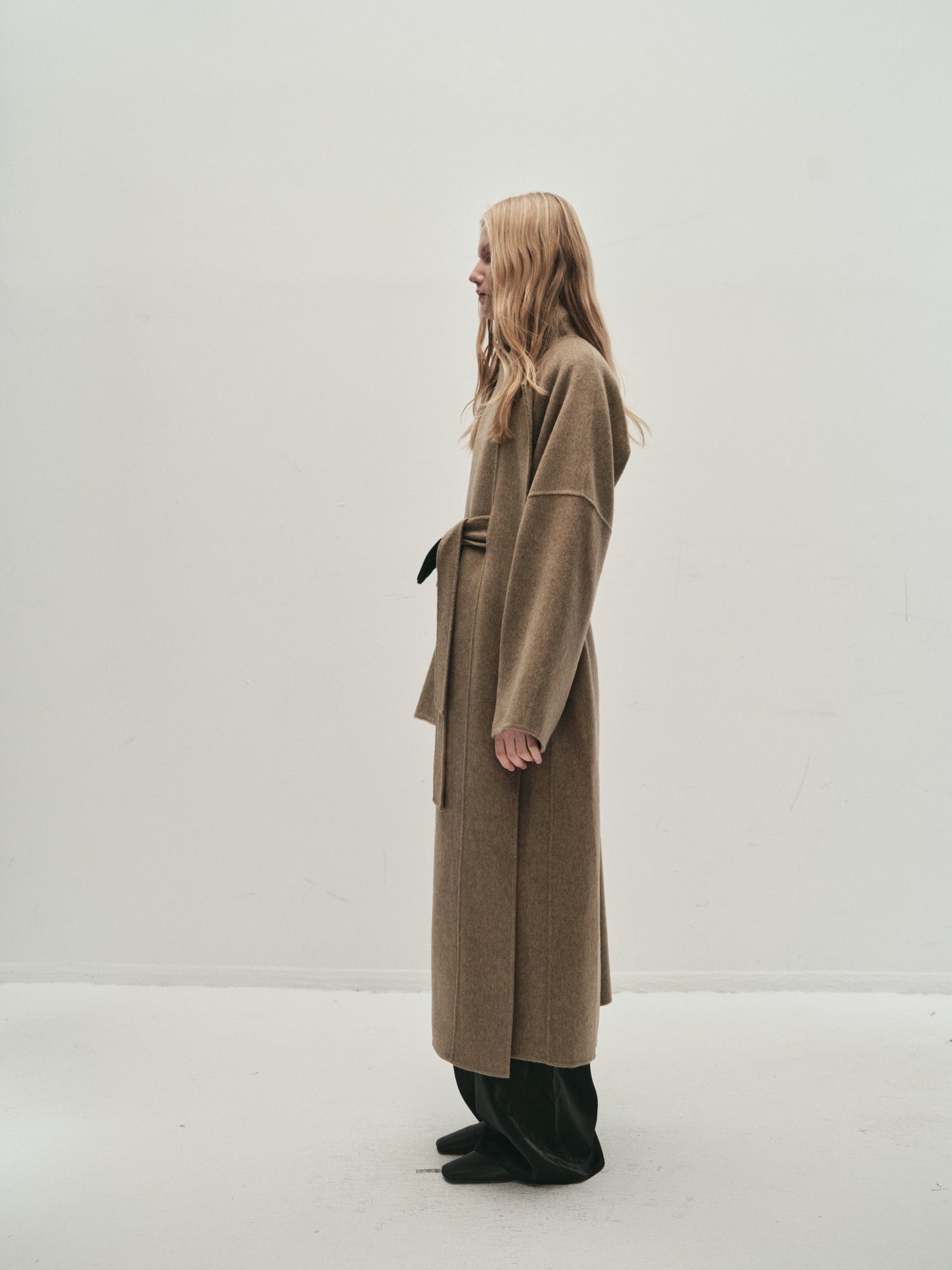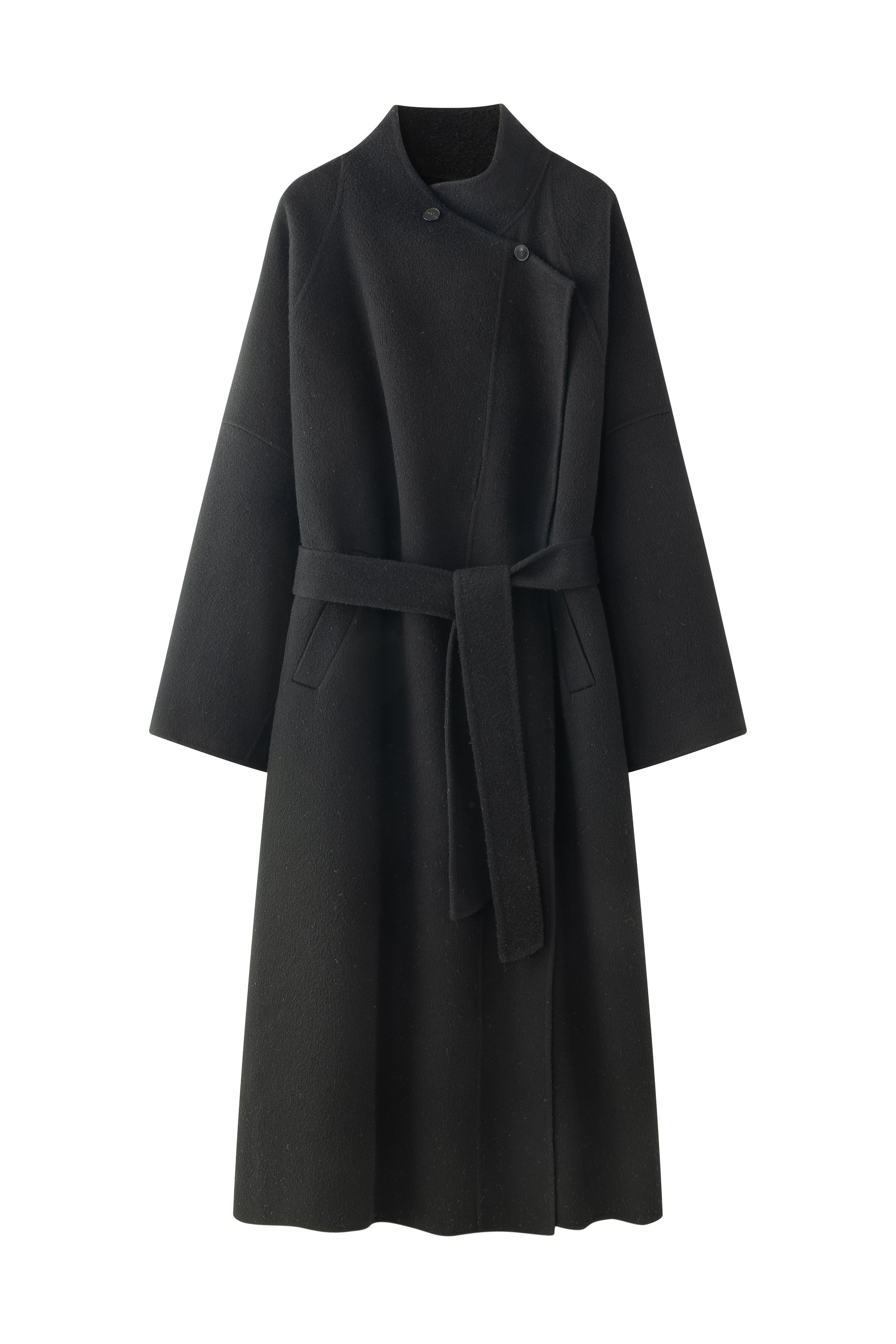 Doubled sided long coat in super fine silk, cashmere and wool blend. Folded asymmetric neckline to be worn buttoned or folded. Waist belt going through the hole in the waist.