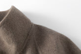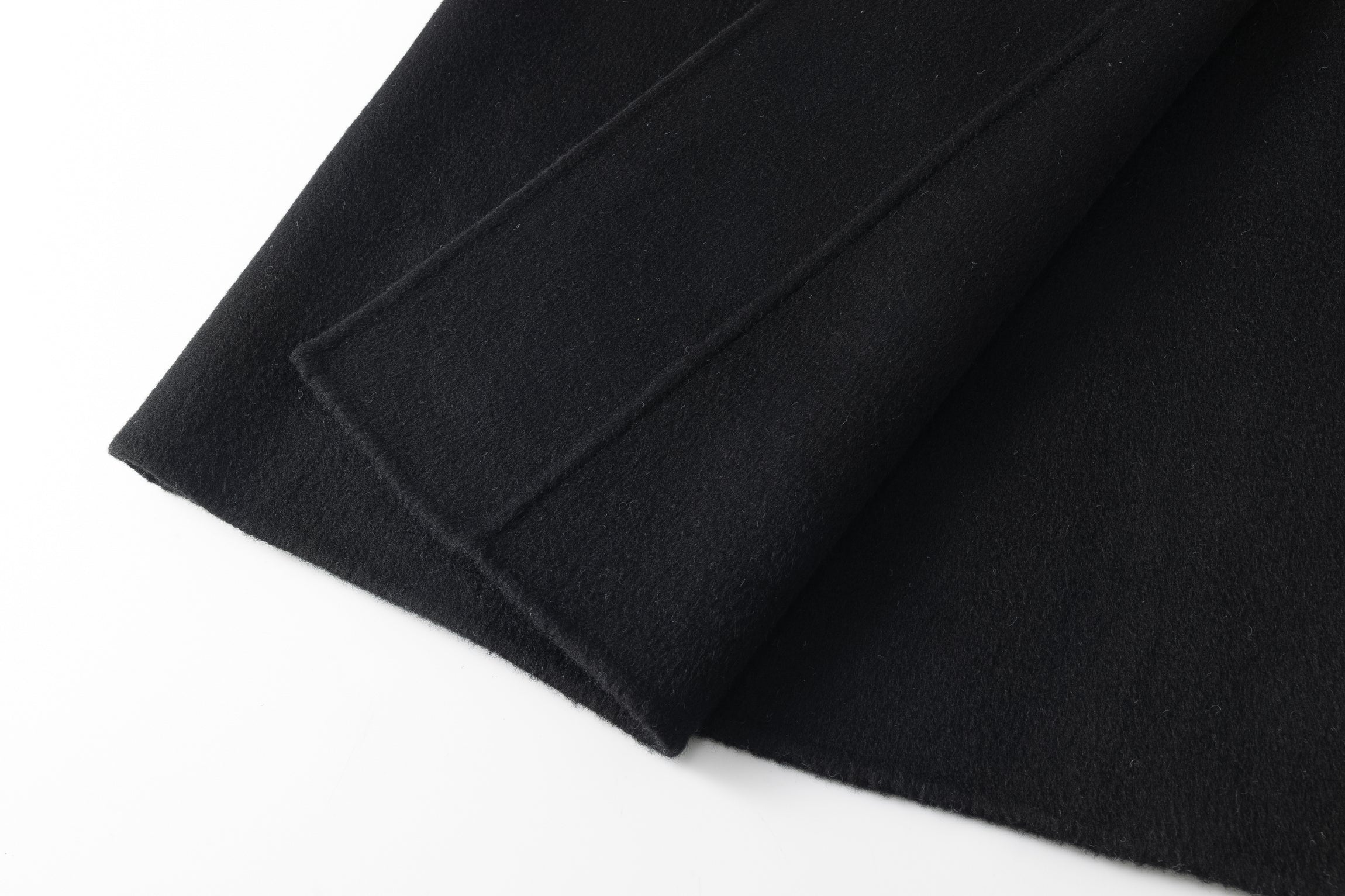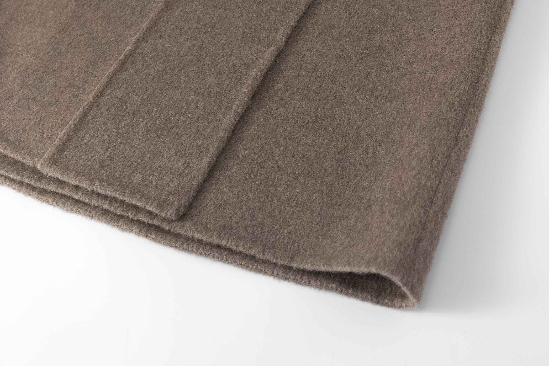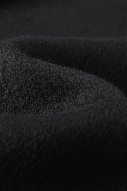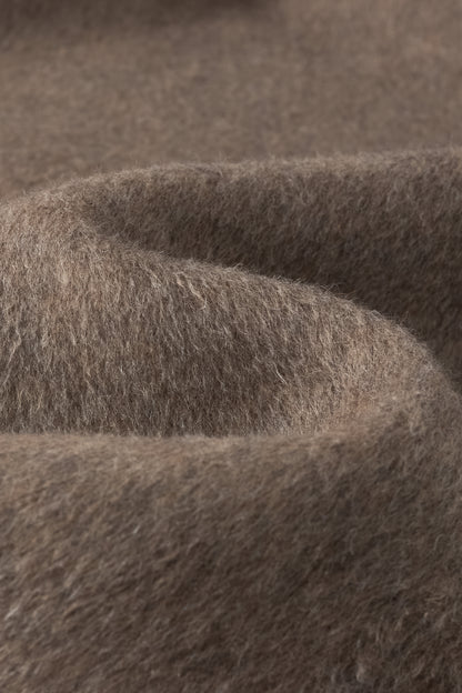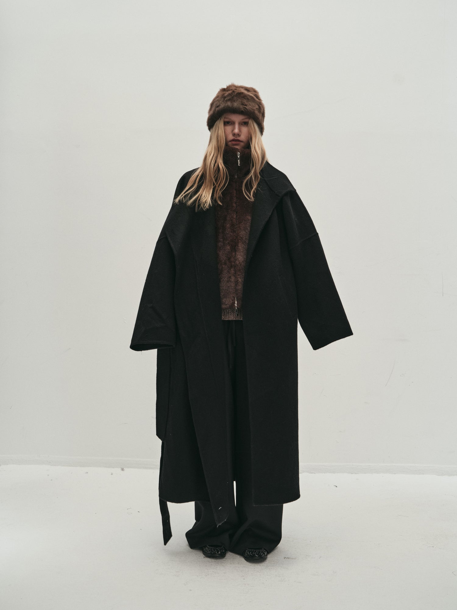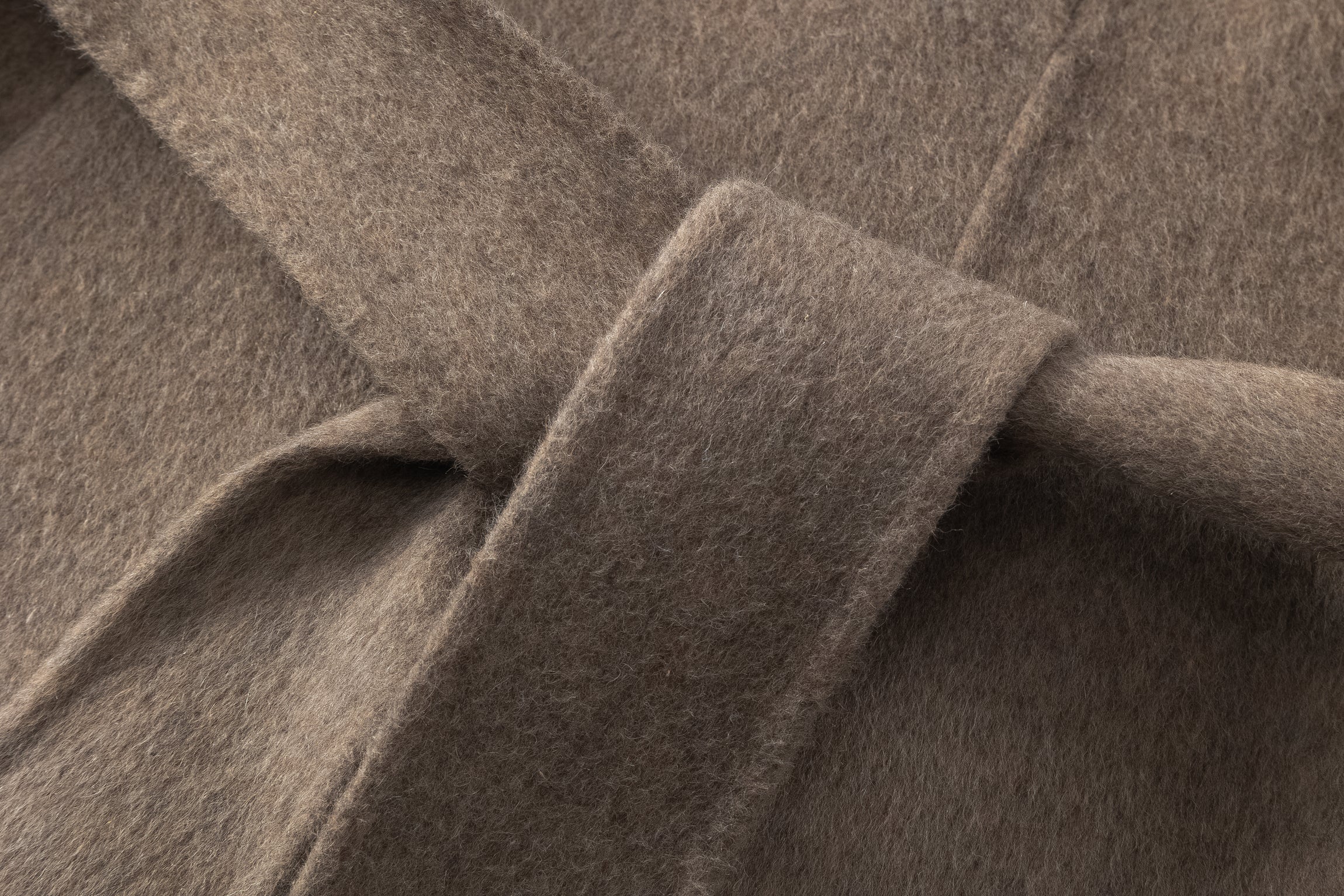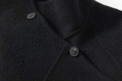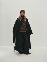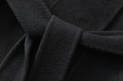 Doubled sided long coat in super fine silk, cashmere and wool blend. Folded asymmetric neckline to be worn buttoned or folded. Waist belt going through the hole in the waist.