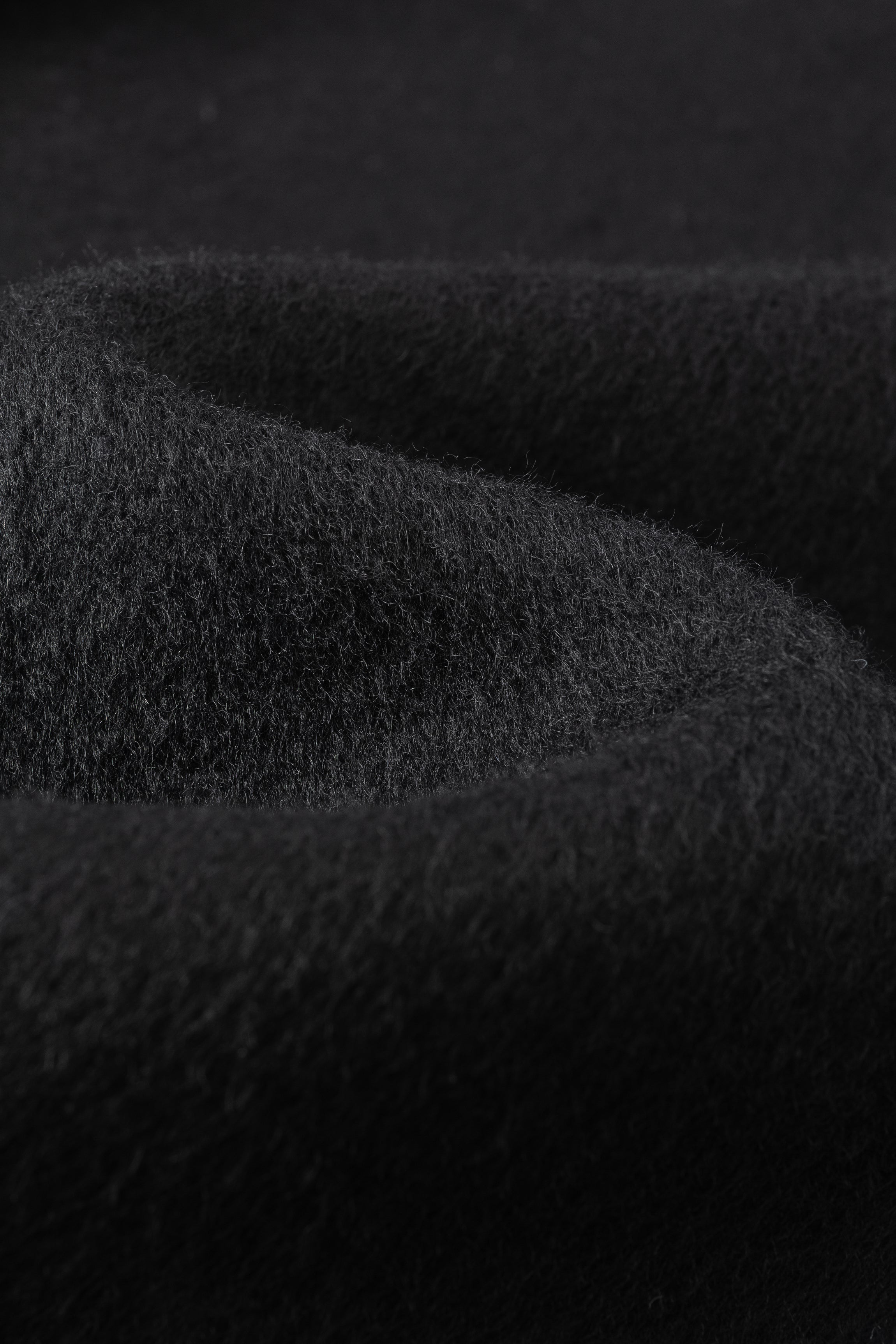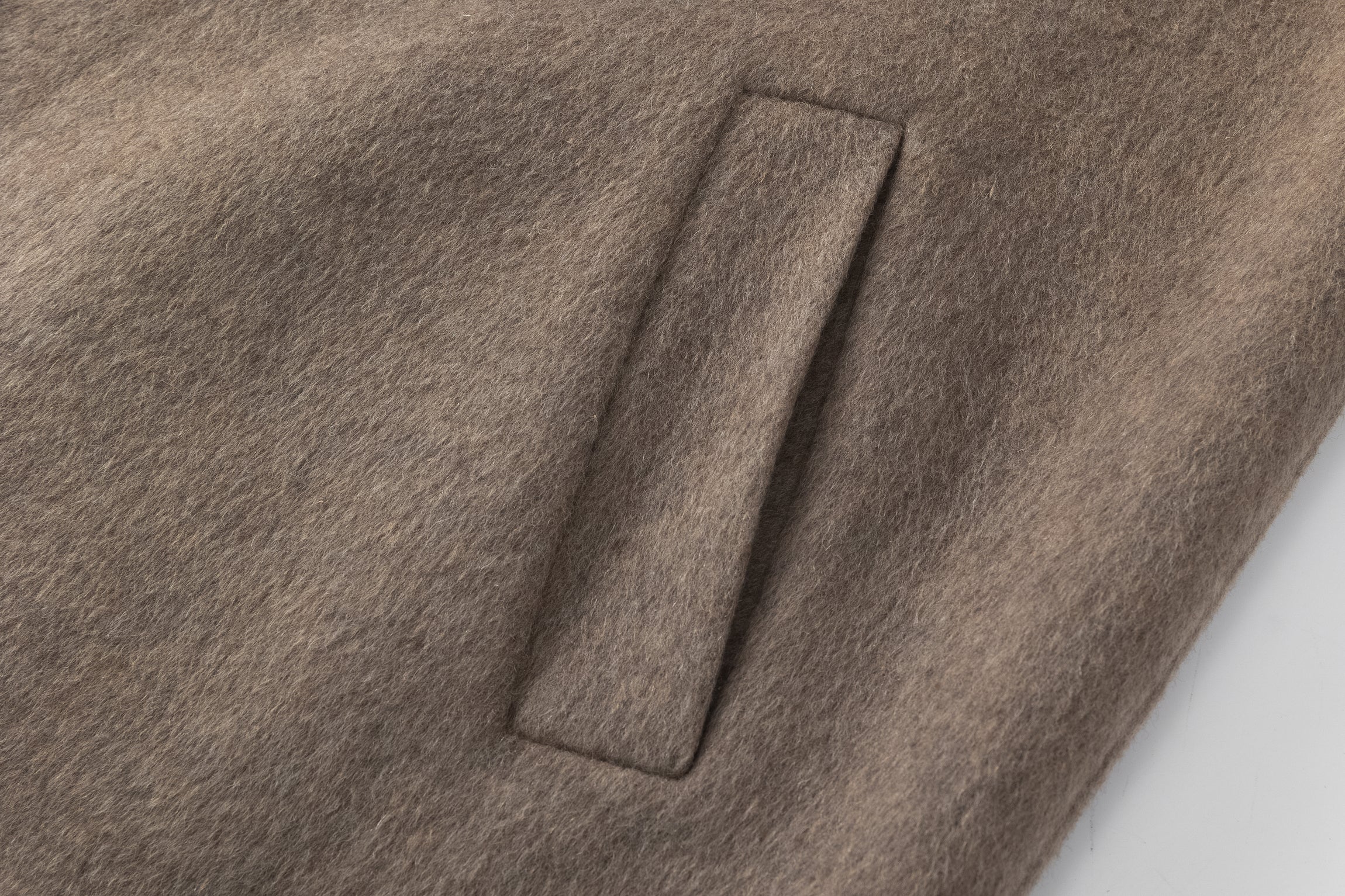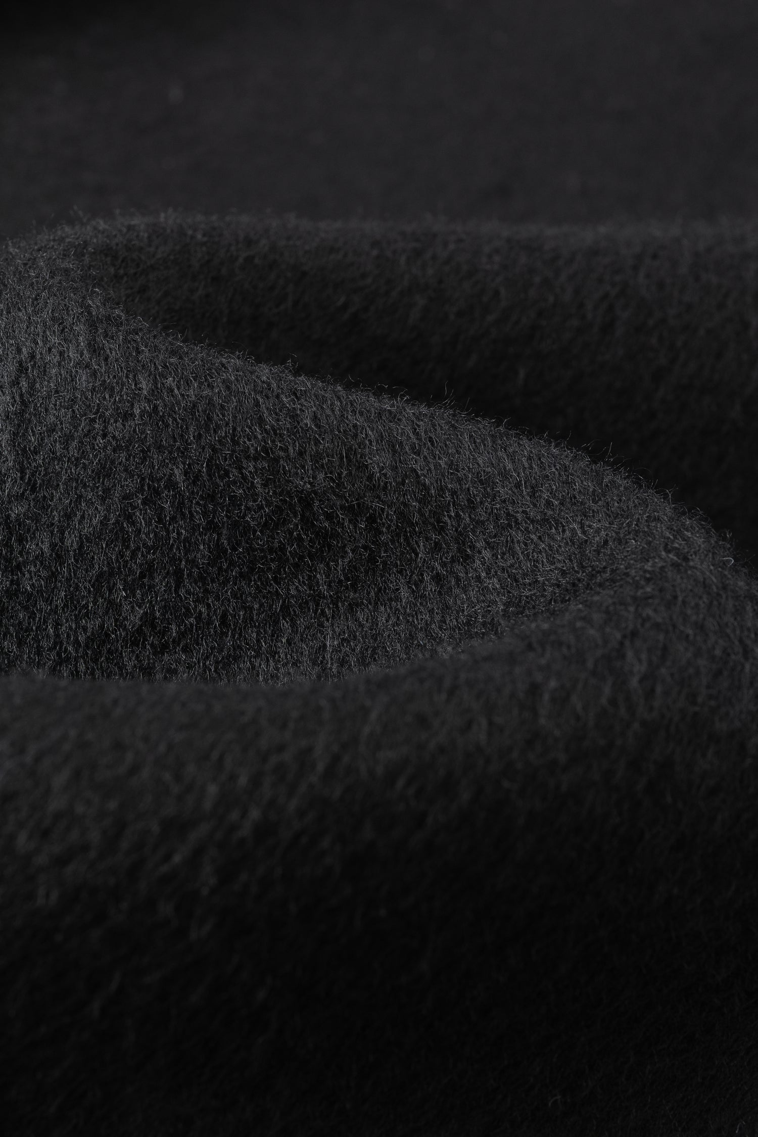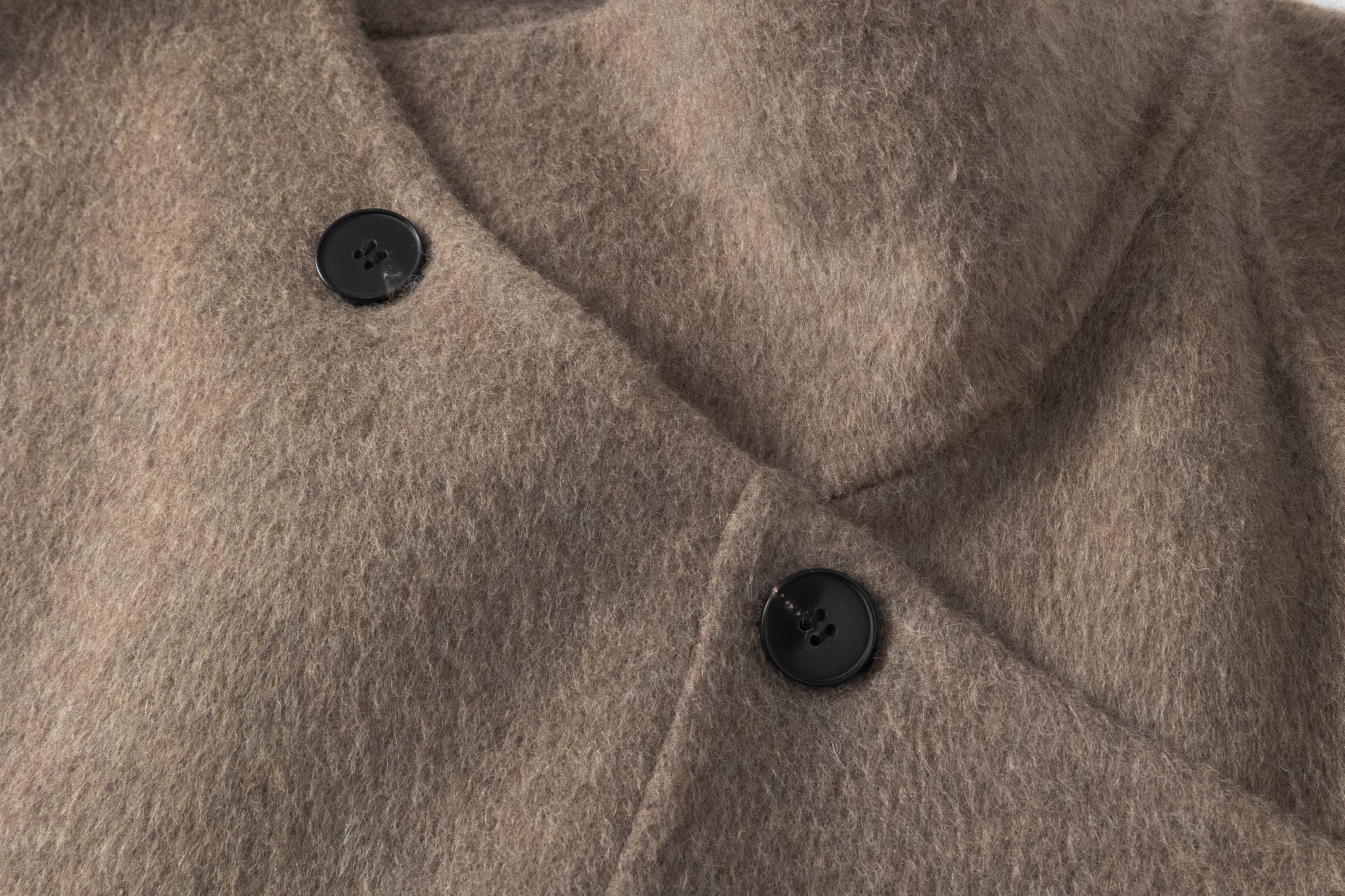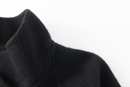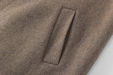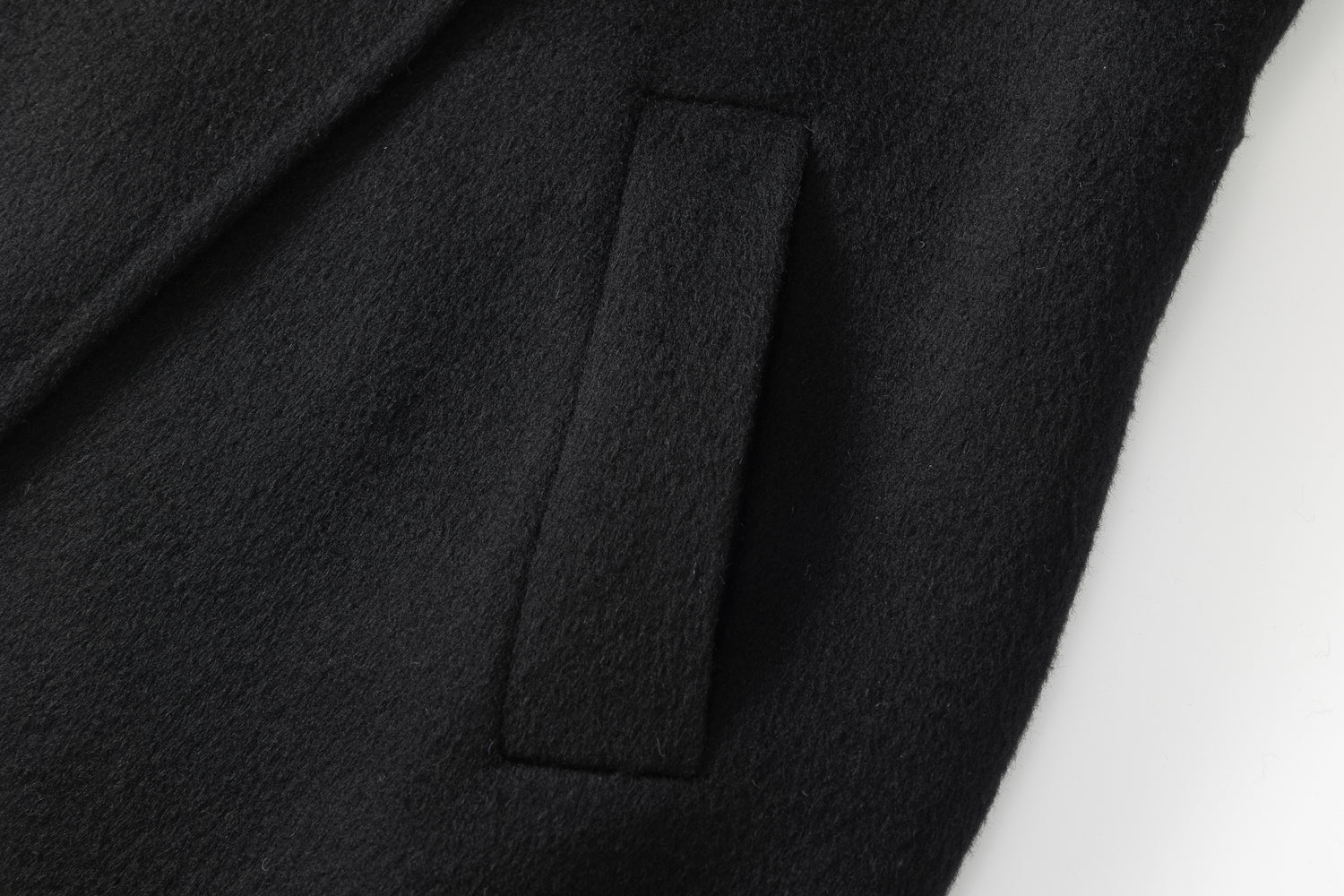 Doubled sided long coat in super fine silk, cashmere and wool blend. Folded asymmetric neckline to be worn buttoned or folded. Waist belt going through the hole in the waist.