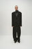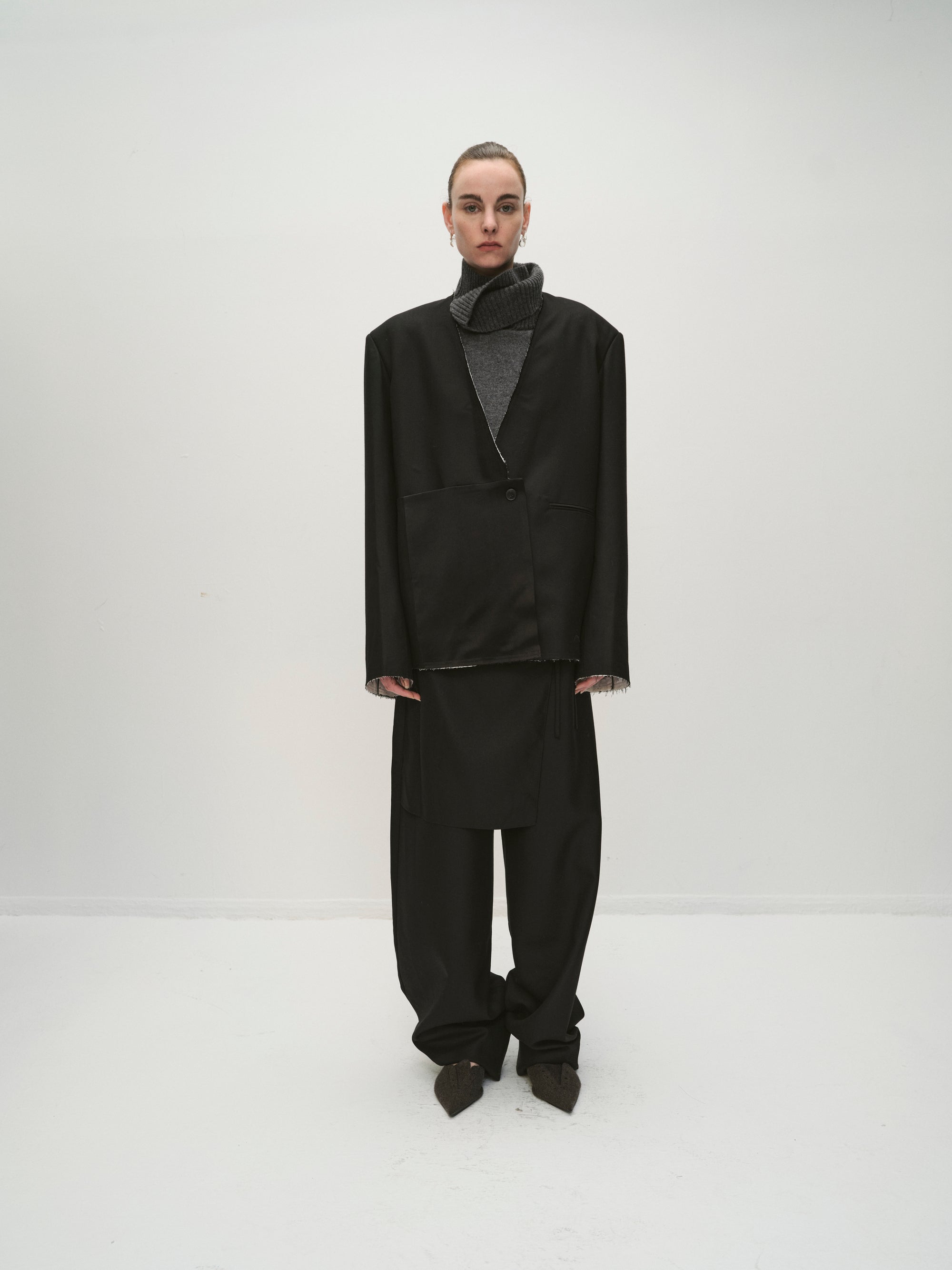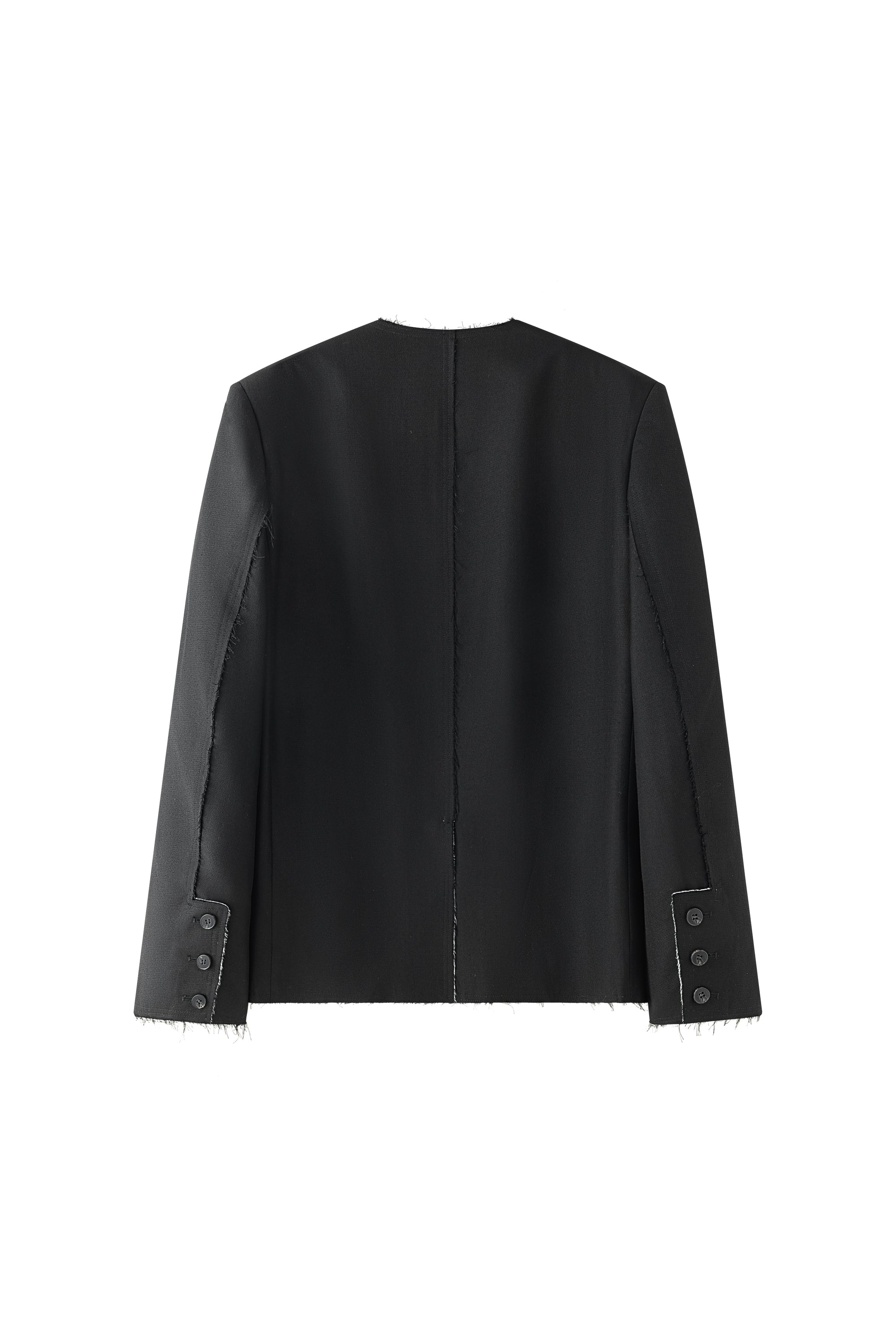 Blazer with wide shoulder and white inner lining. Raw edges. Shiny front patch with pockets on the top and side.
