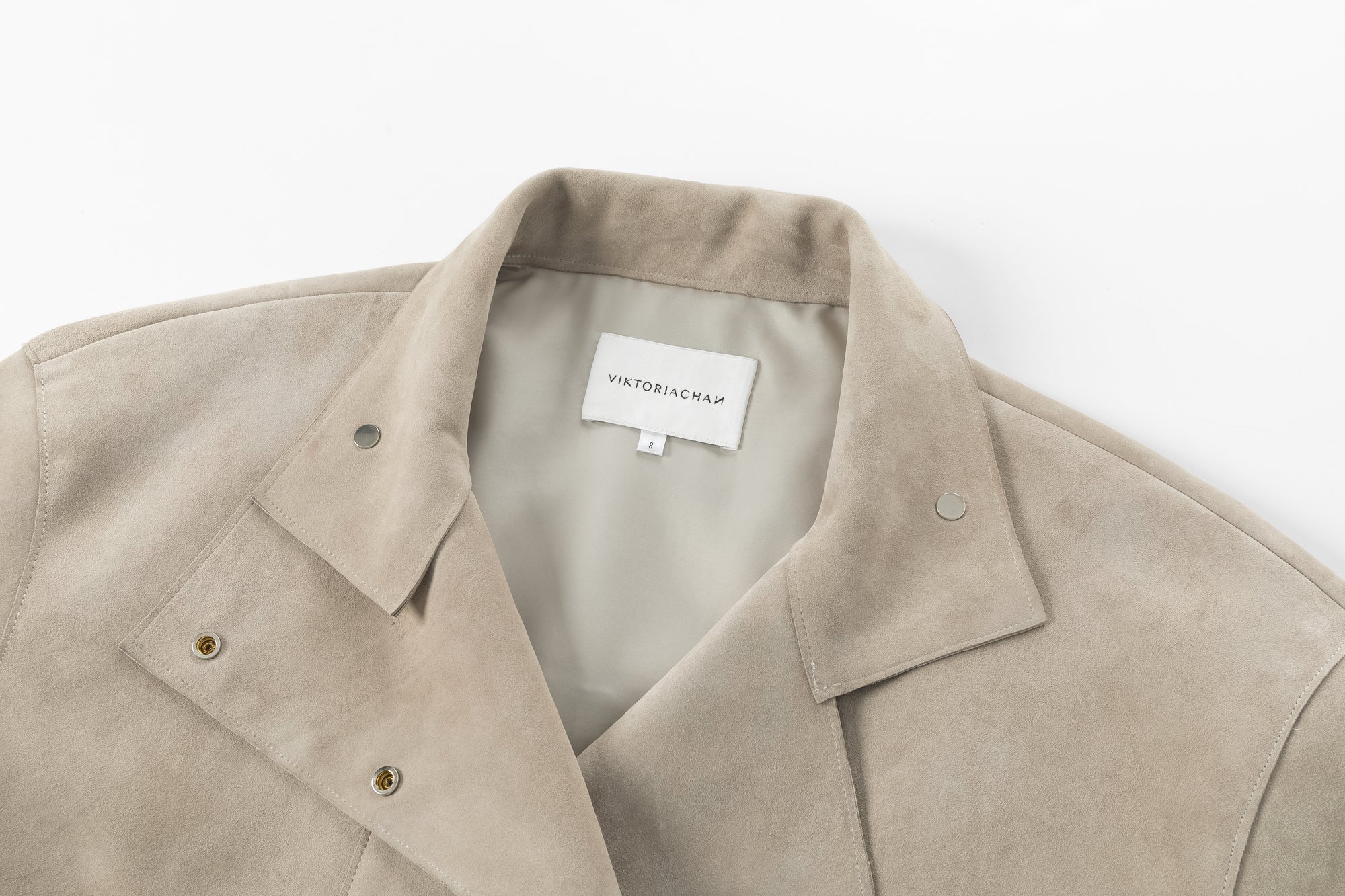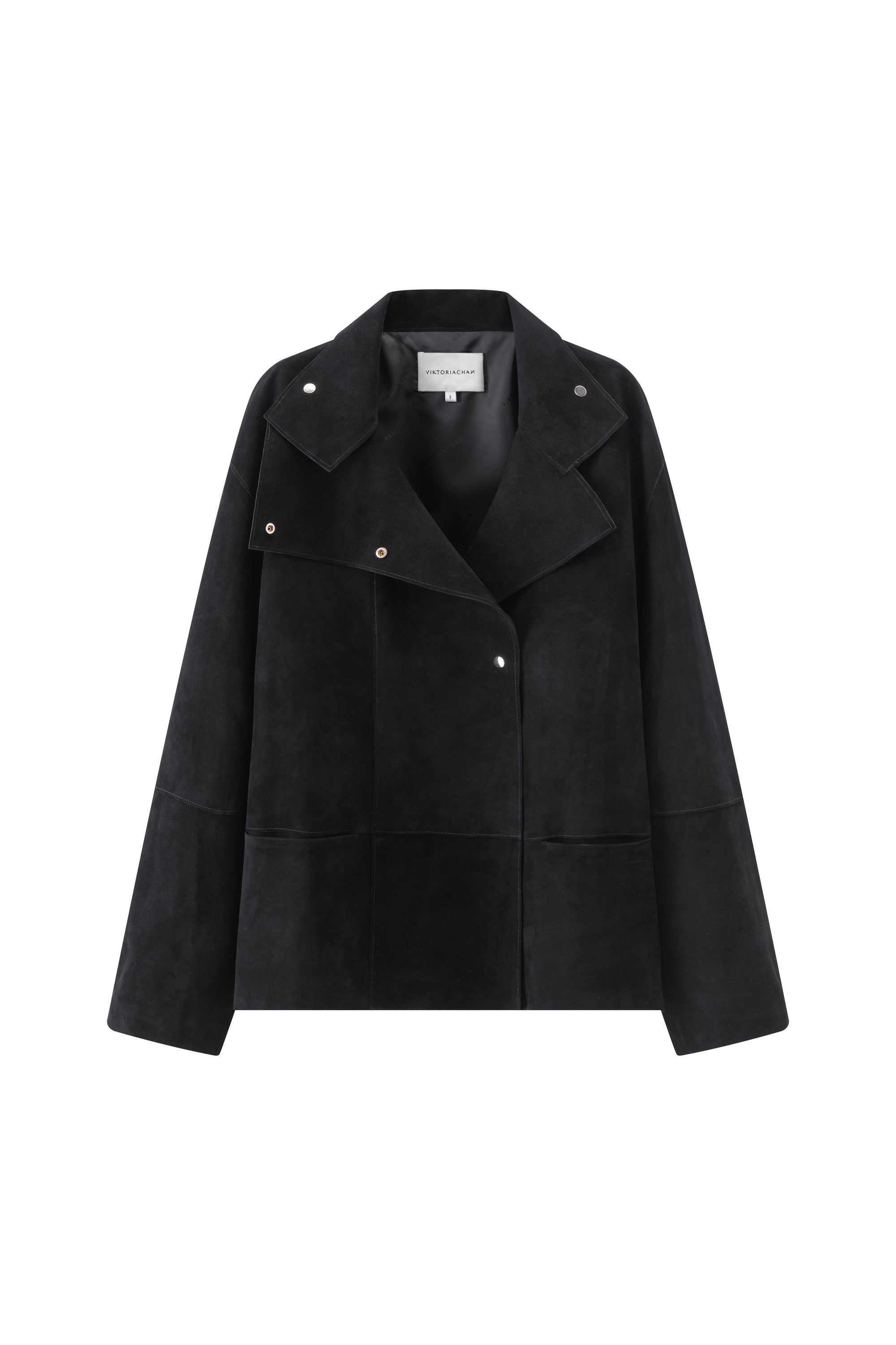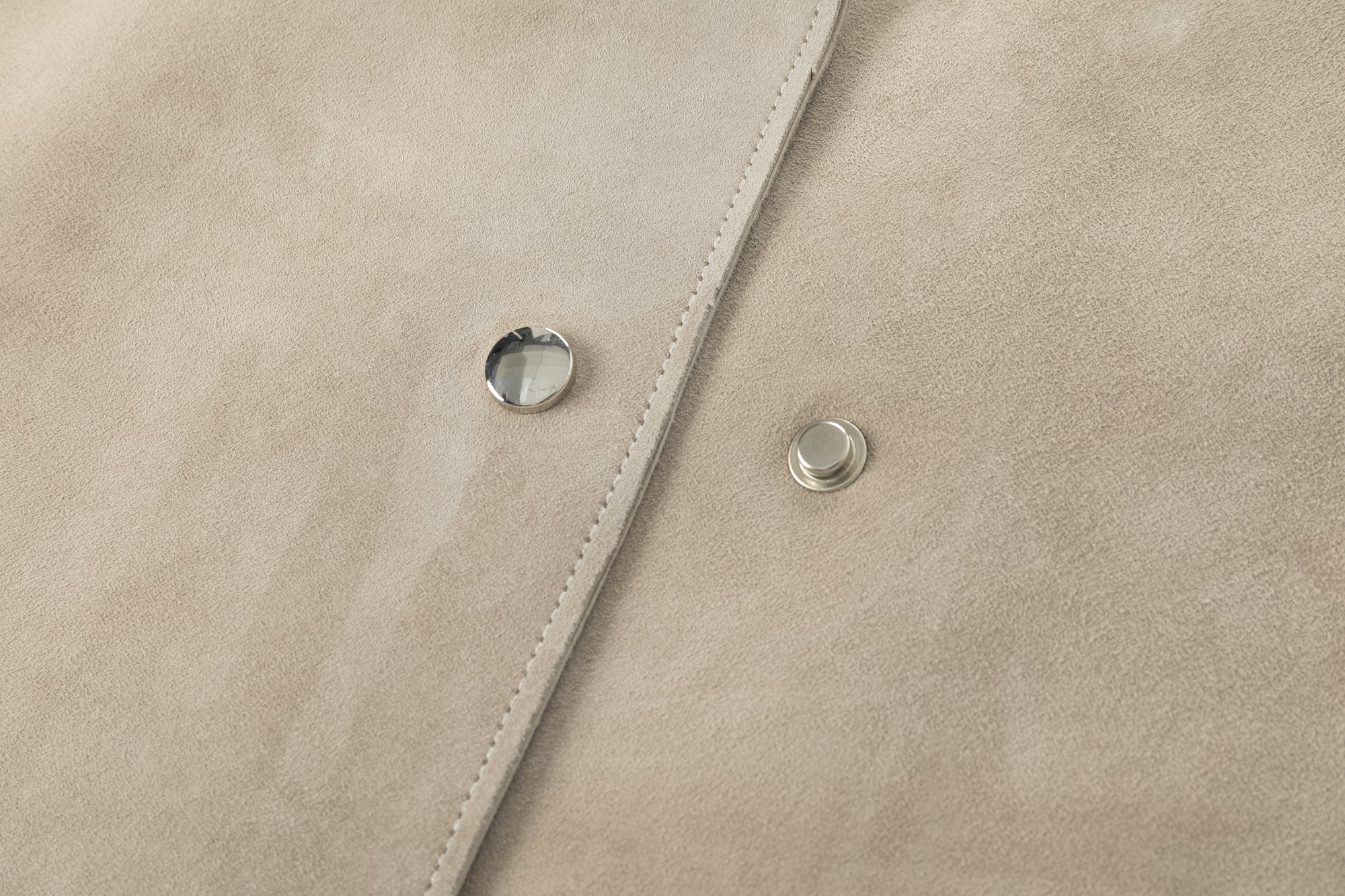 Soft suede jacket with a versatile collar featuring press-metal buttons that can be worn high-neck or opened into two lapels for a relaxed look. Designed with clean seam lines and practi...