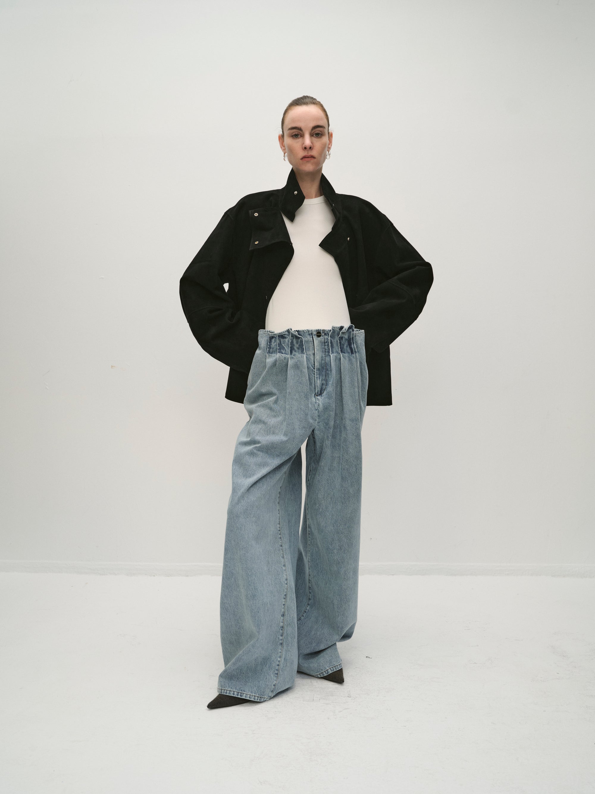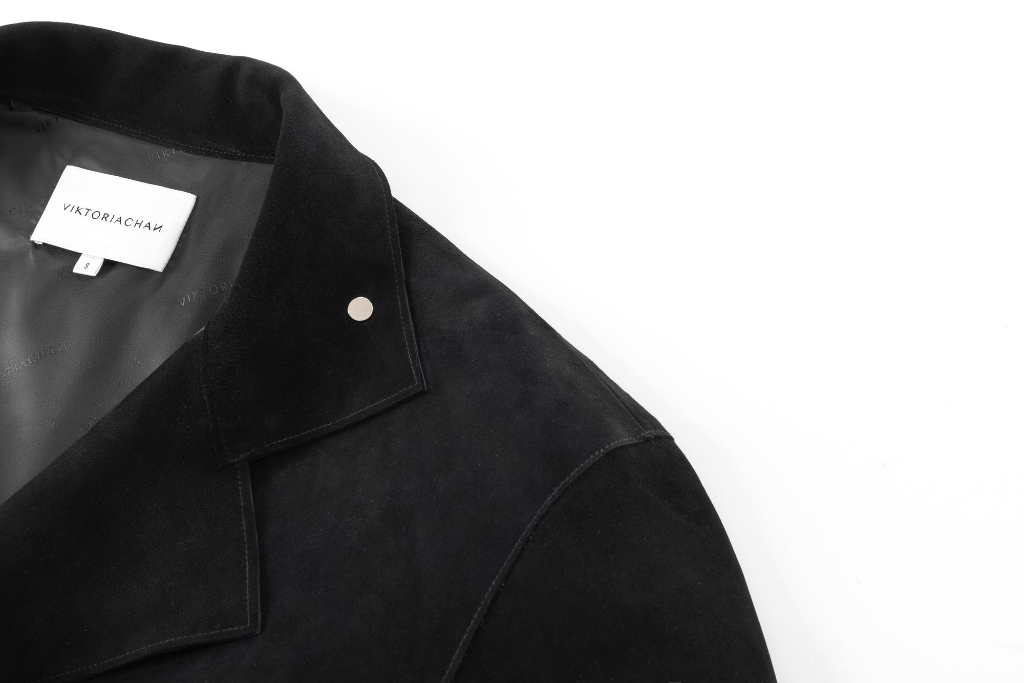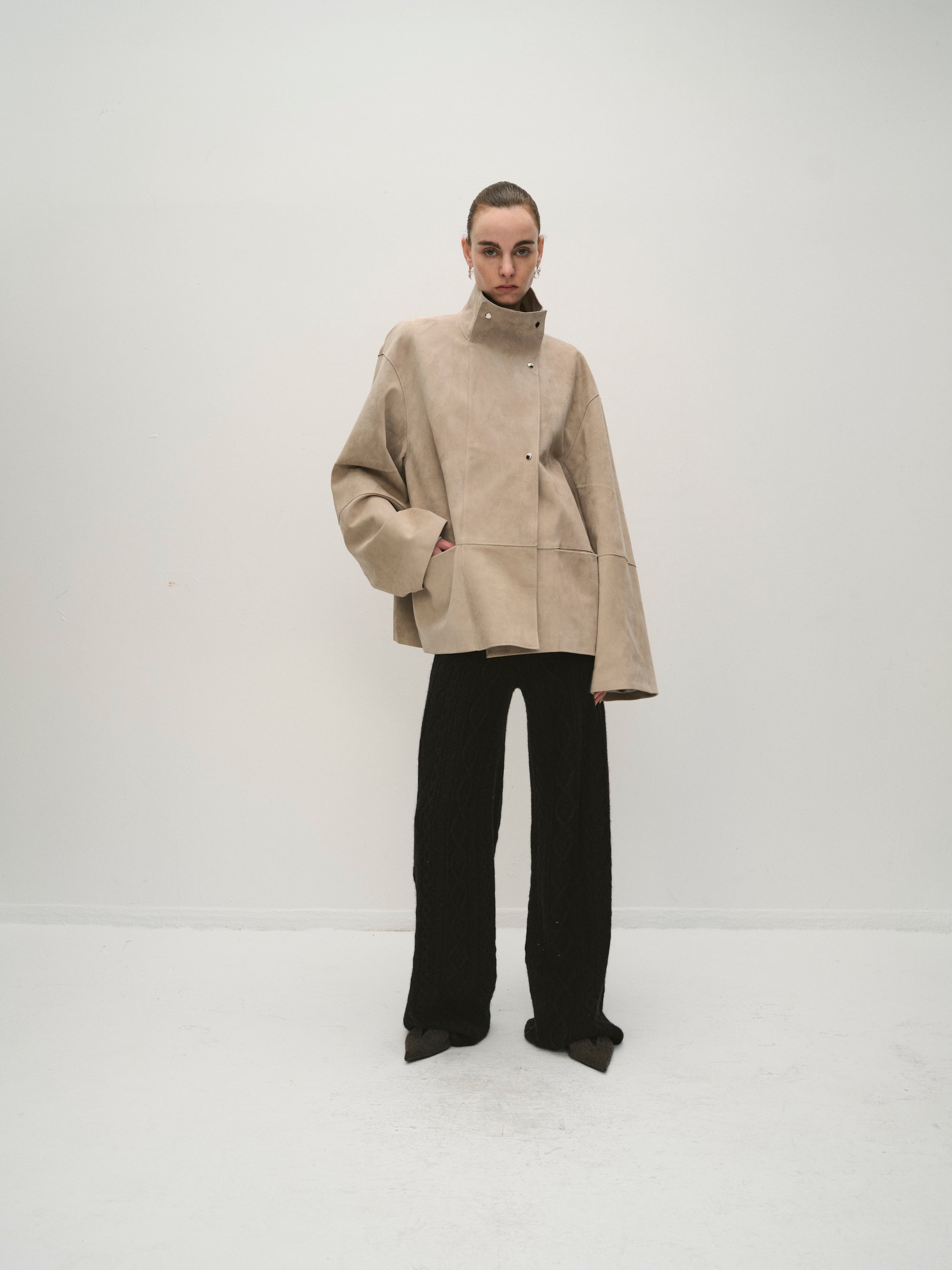 Soft suede jacket with a versatile collar featuring press-metal buttons that can be worn high-neck or opened into two lapels for a relaxed look. Designed with clean seam lines and practi...
