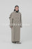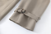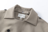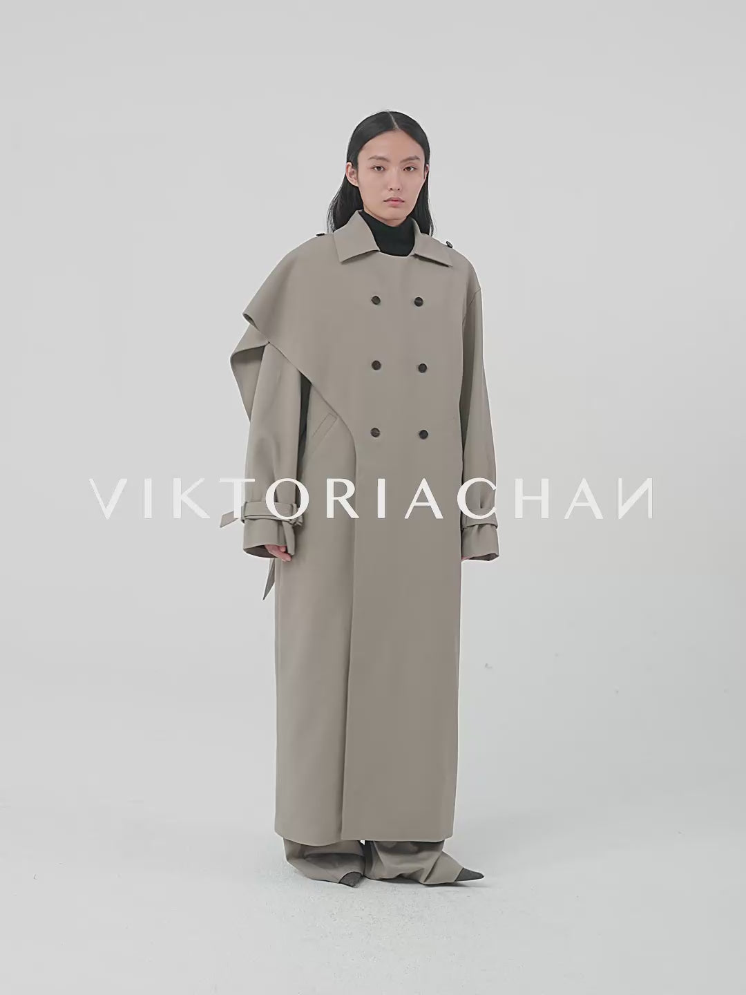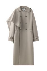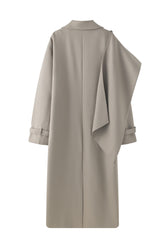 Oversized trenchcoat with wide, folded front draped on one shoulder. Double-breasted design with large black buttons. Buckle cuff detail at the sleeves.