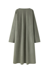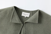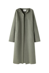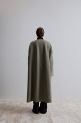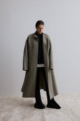 This olive green wool blend coat is designed with a minimalist aesthetic, featuring clean and uninterrupted lines at the front and back that highlight its sophisticated construction, add...