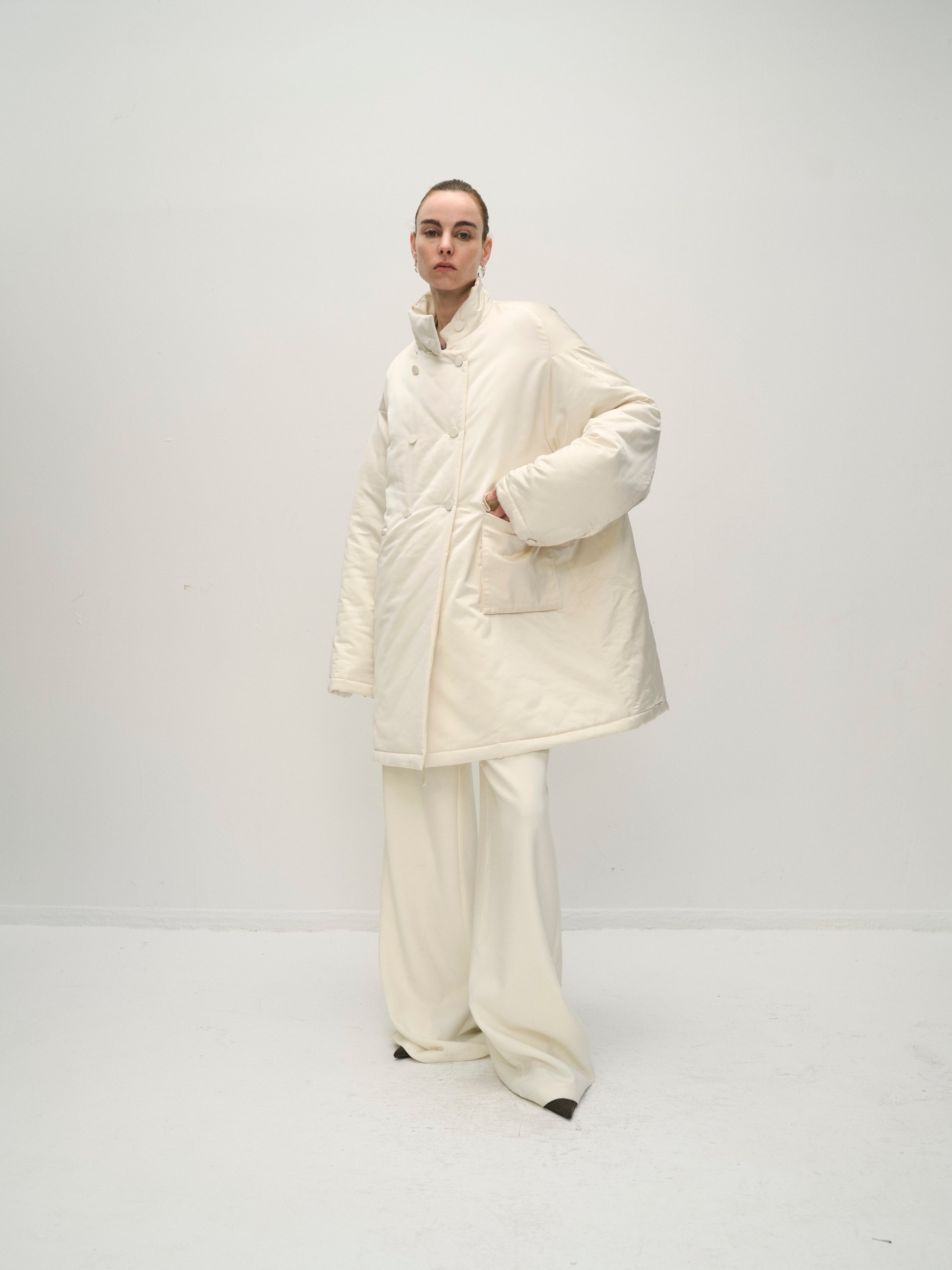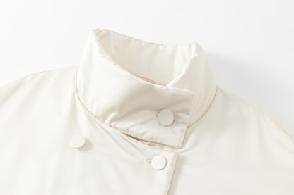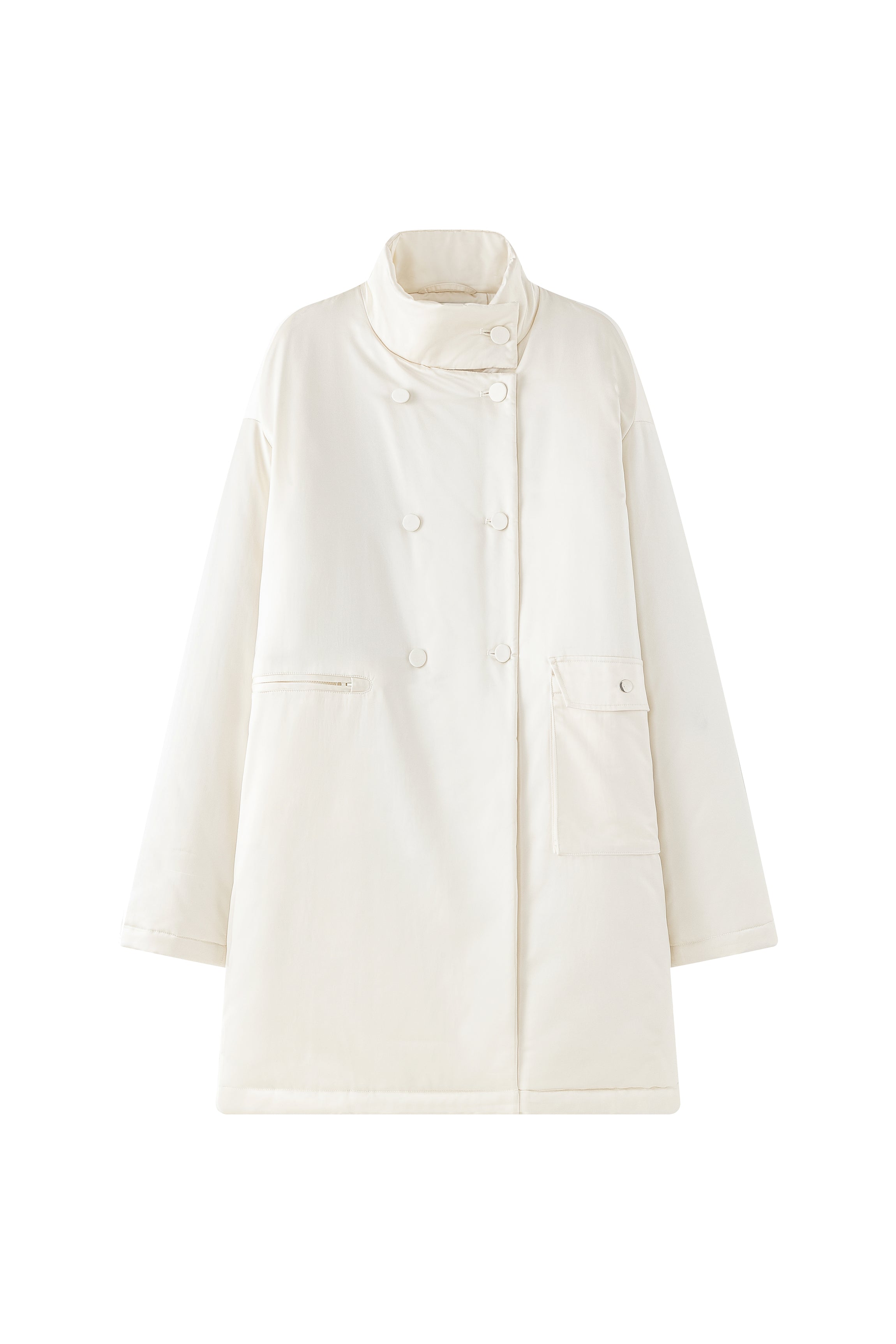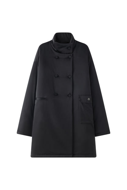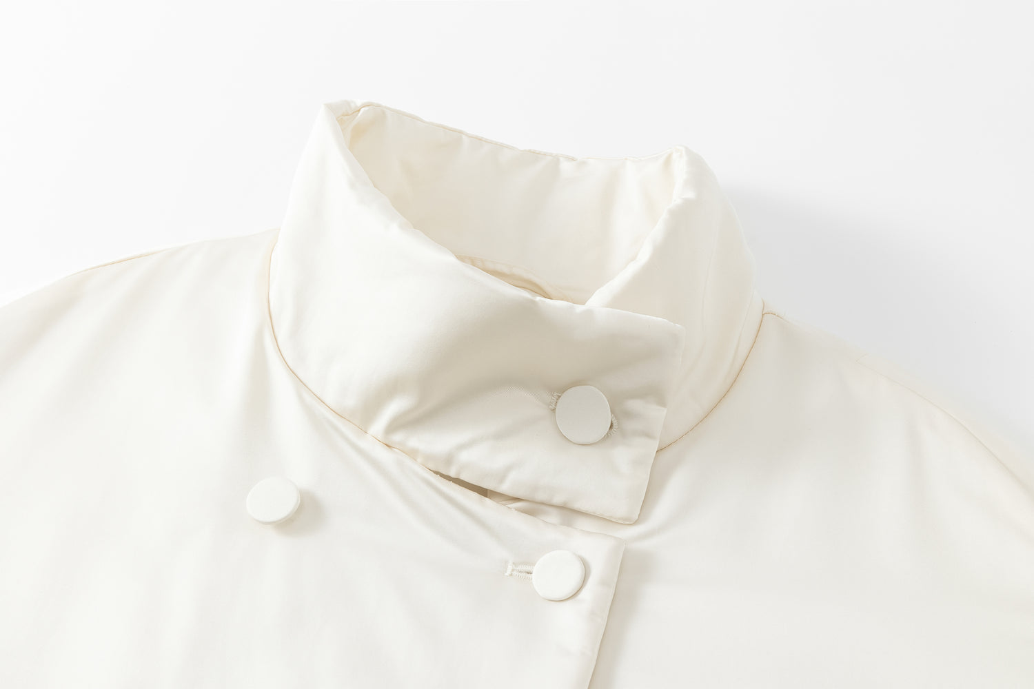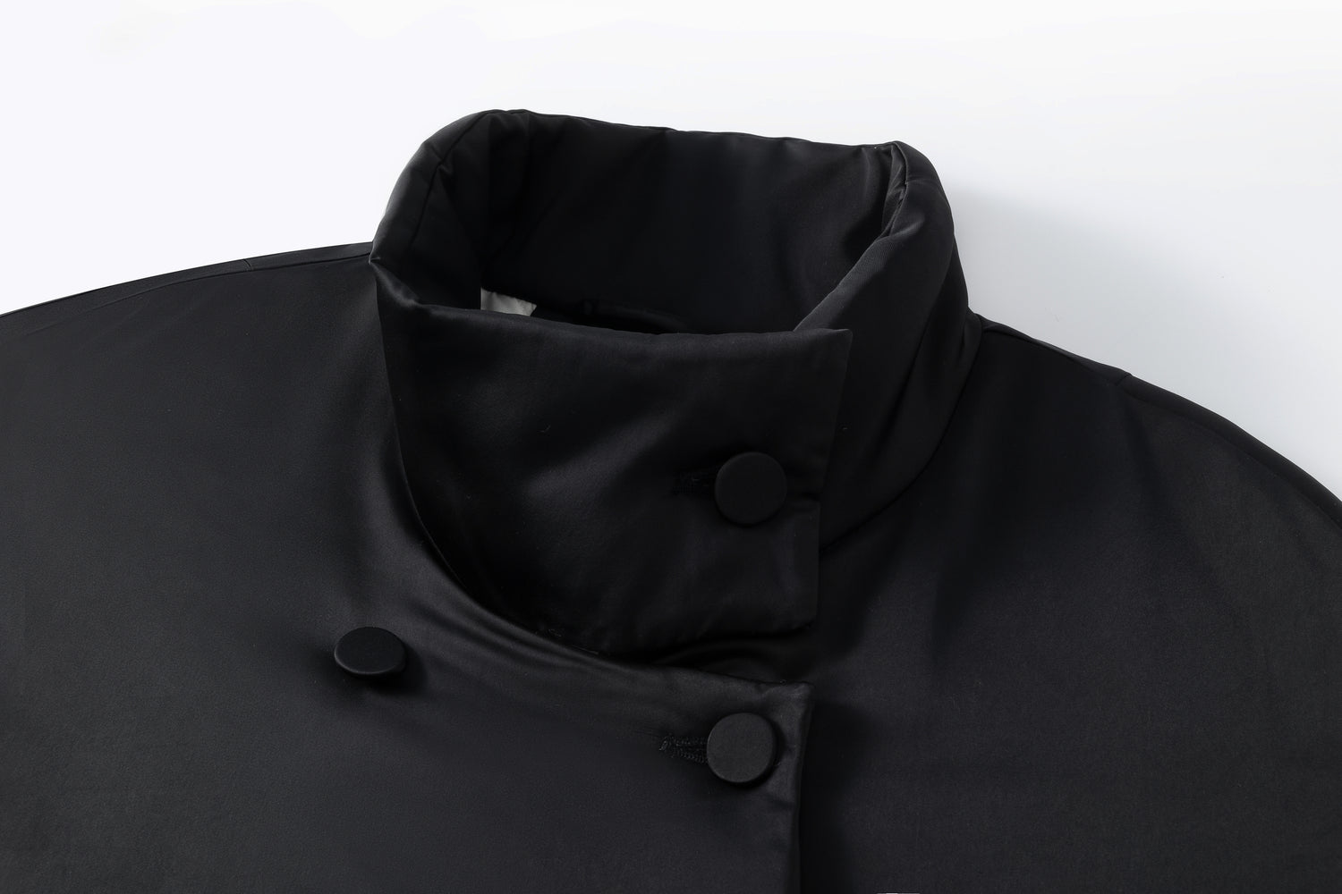 Puffer-like design with a satin finish. Double-breasted closure with fabric-covered buttons. High neck collar with button detailing. Side flap pockets with button closure and additional zip.