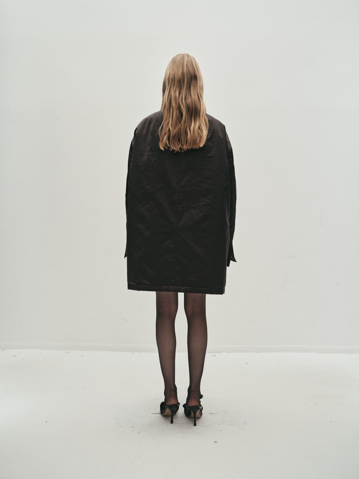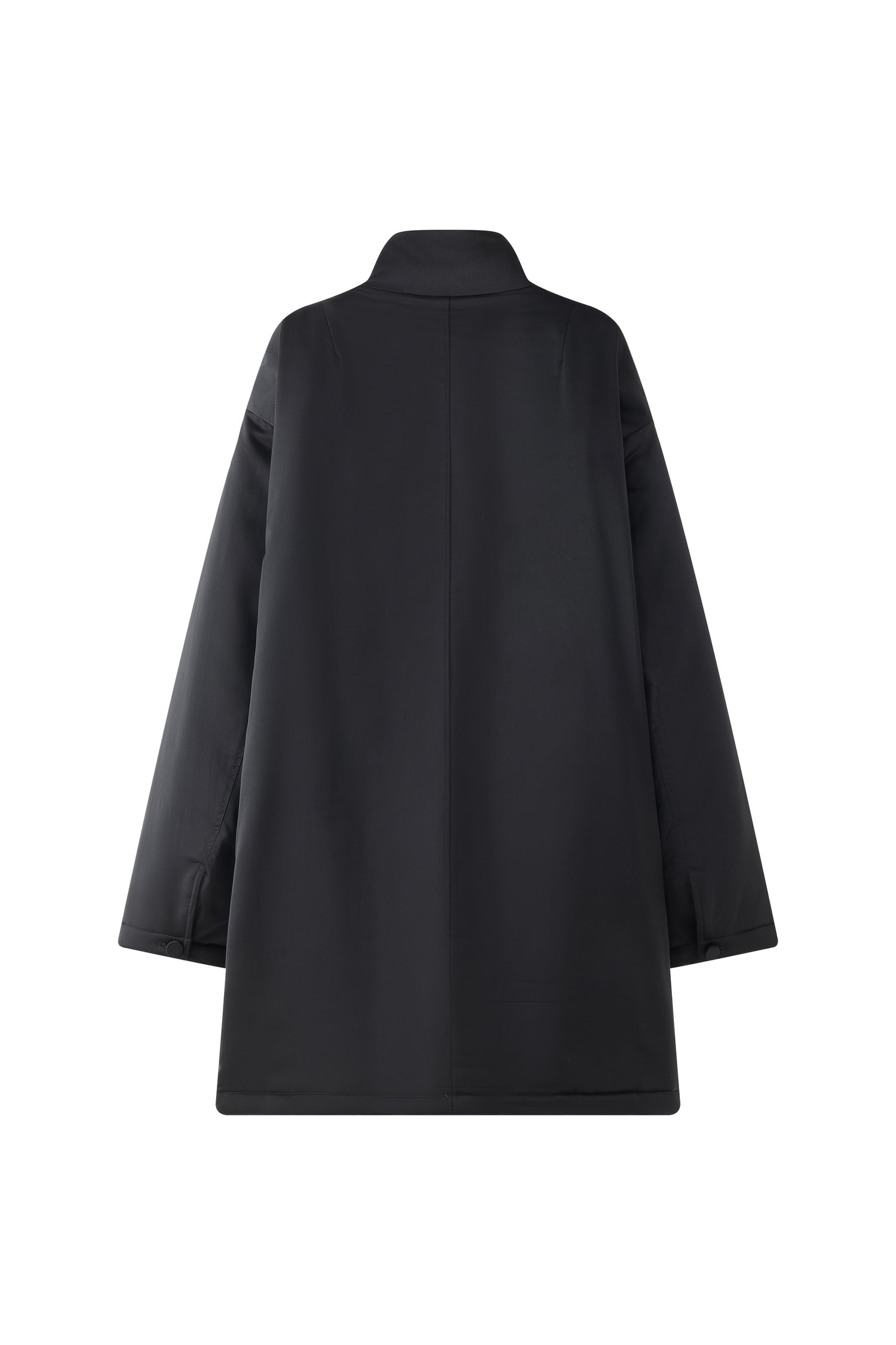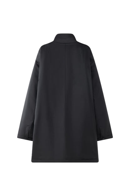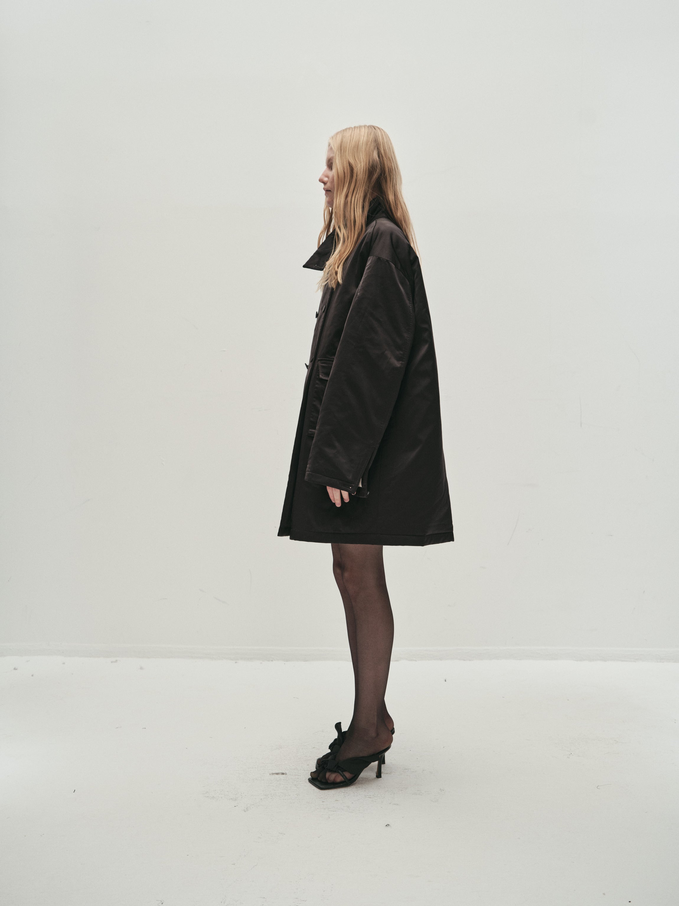 Puffer-like design with a satin finish. Double-breasted closure with fabric-covered buttons. High neck collar with button detailing. Side flap pockets with button closure and additional zip.