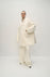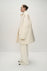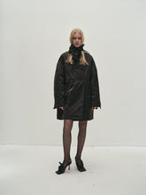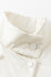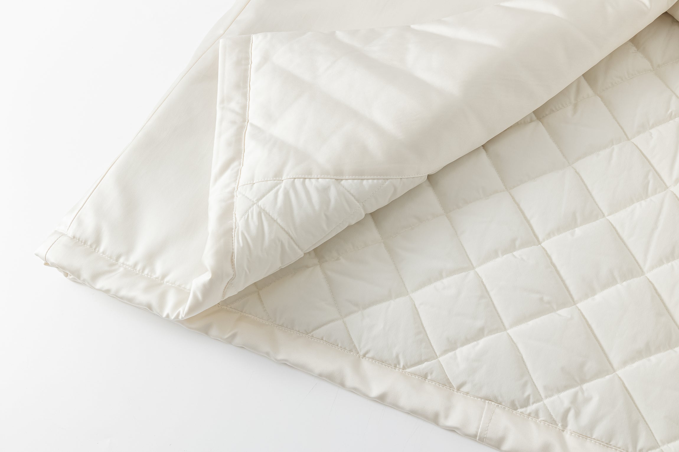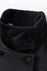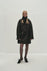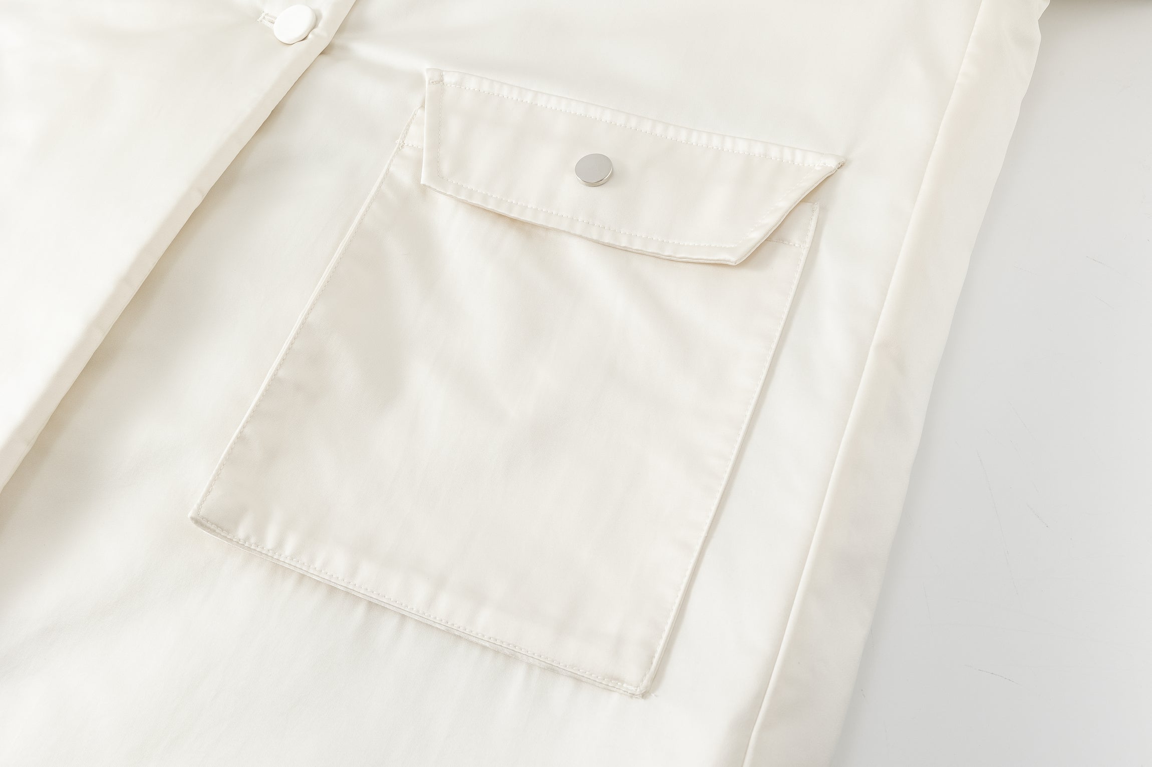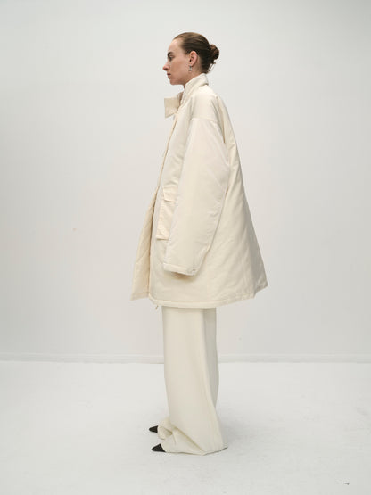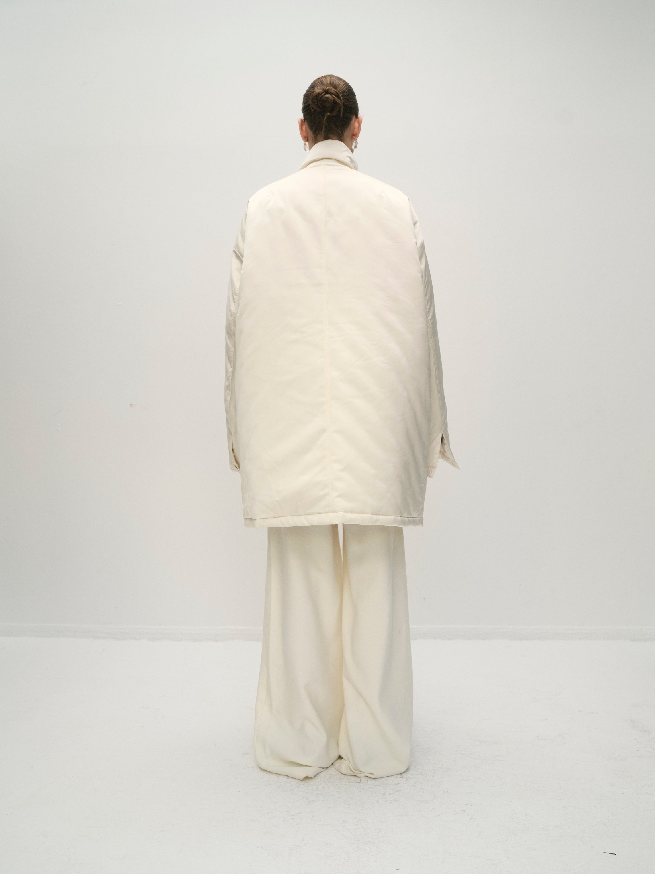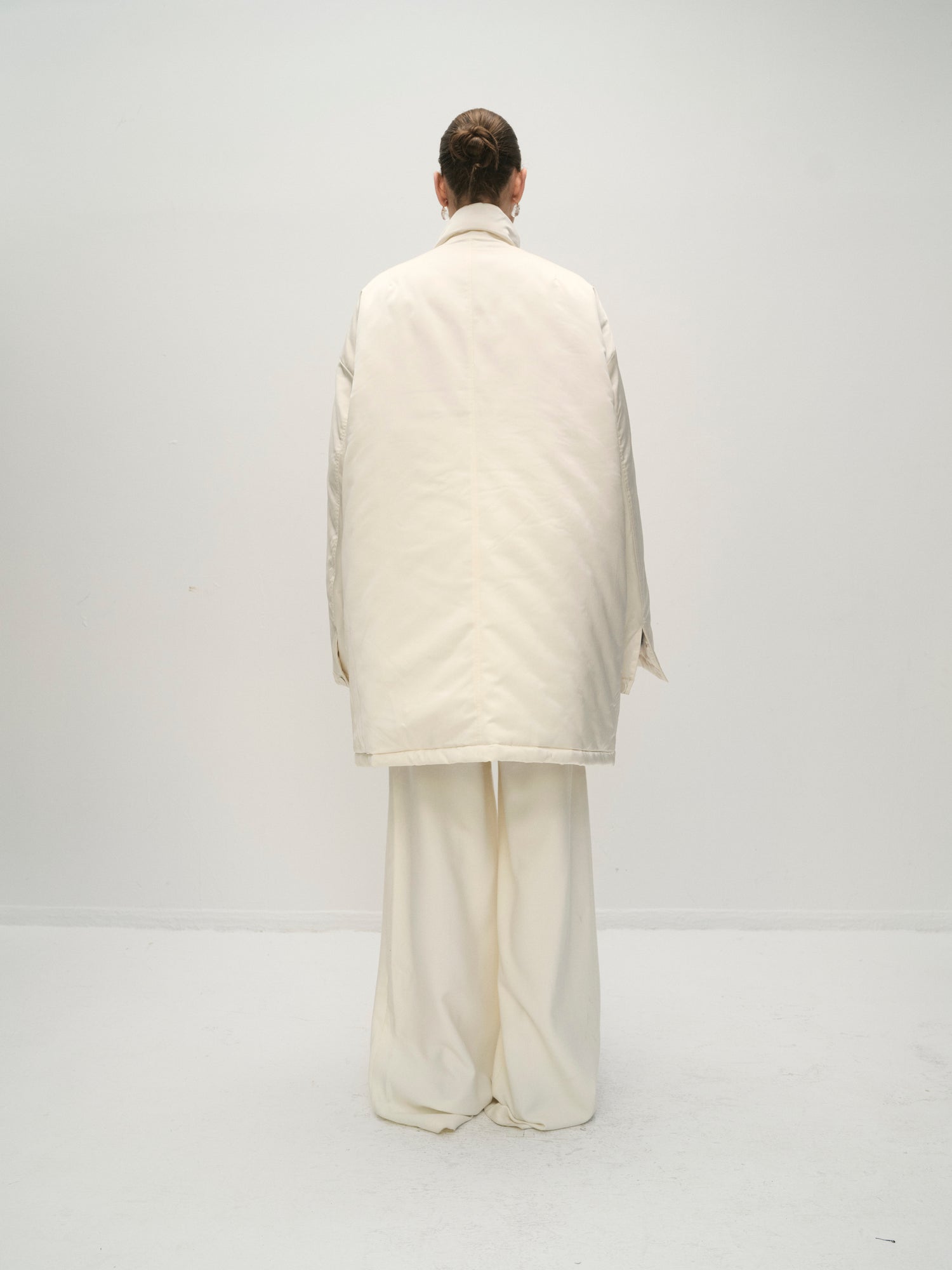 Puffer-like design with a satin finish. Double-breasted closure with fabric-covered buttons. High neck collar with button detailing. Side flap pockets with button closure and additional zip.