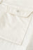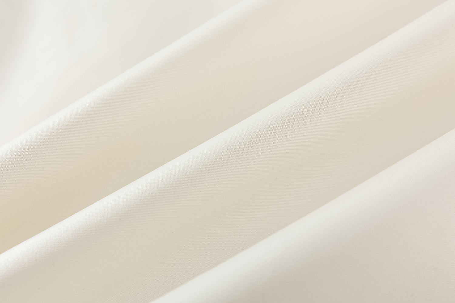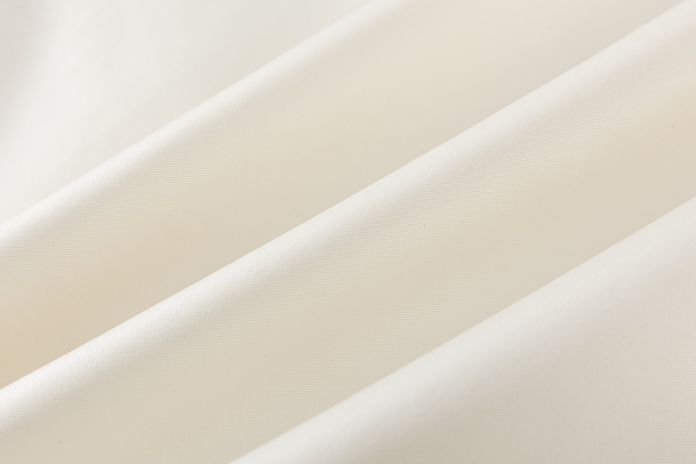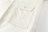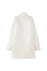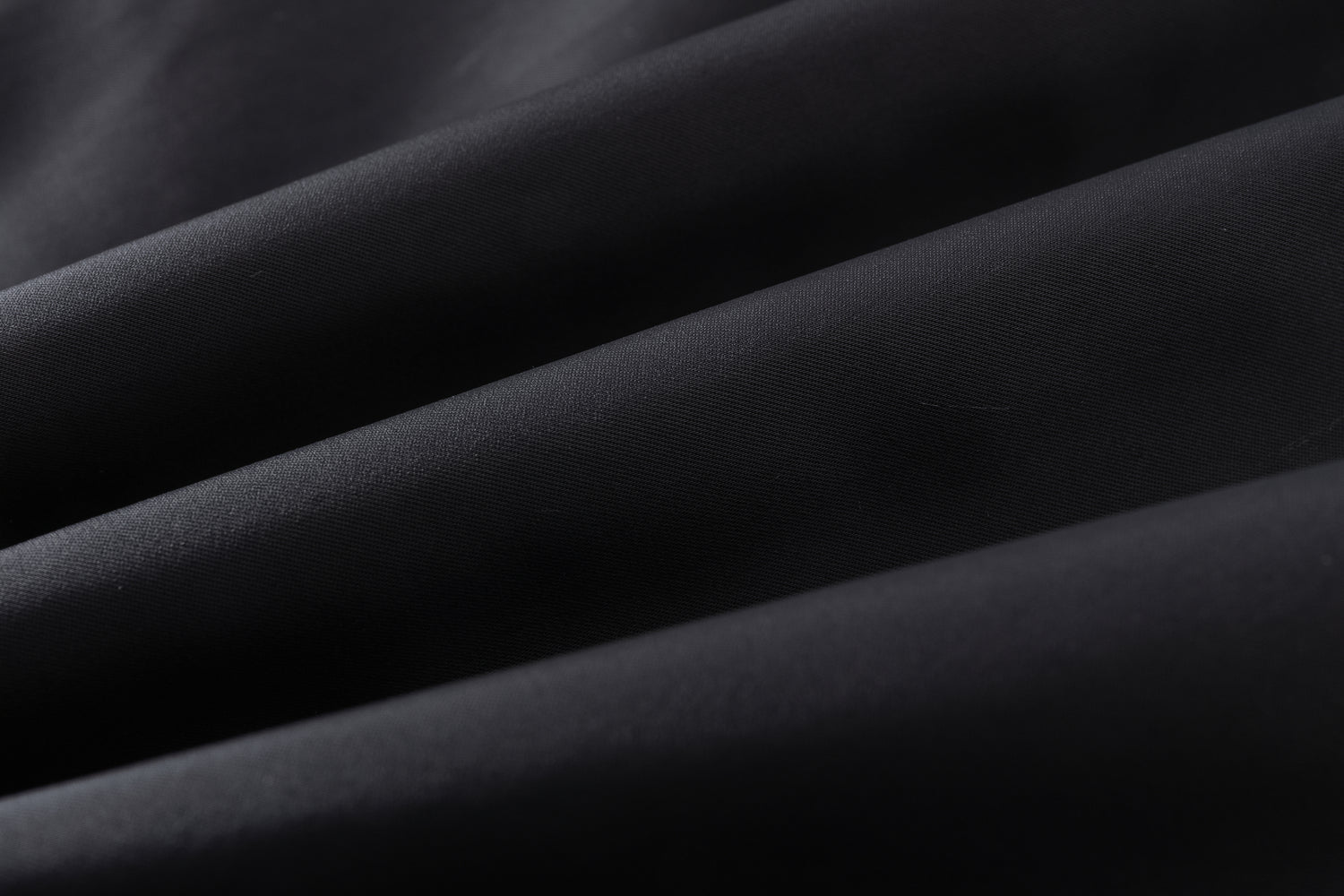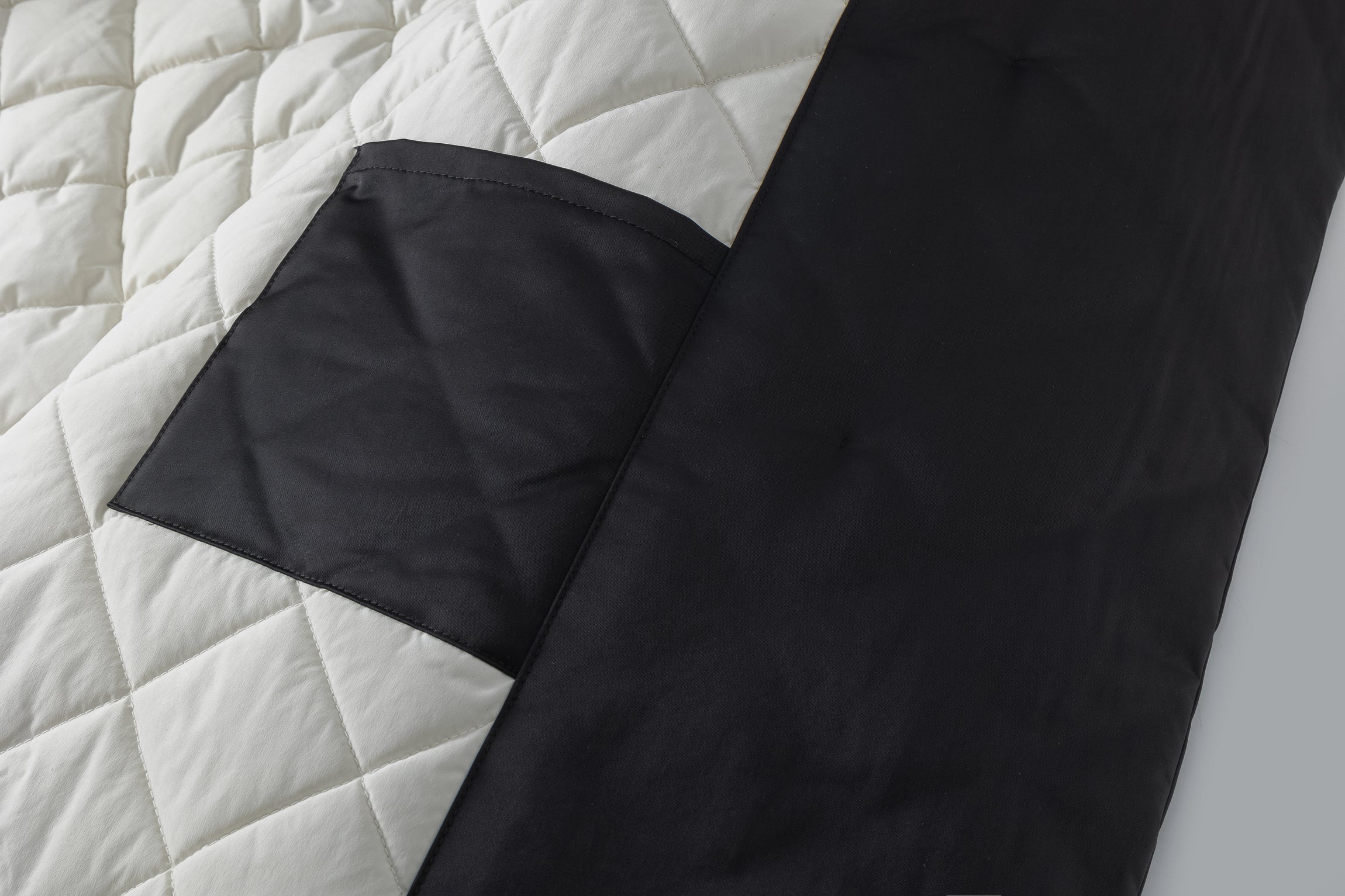 Puffer-like design with a satin finish. Double-breasted closure with fabric-covered buttons. High neck collar with button detailing. Side flap pockets with button closure and additional zip.
