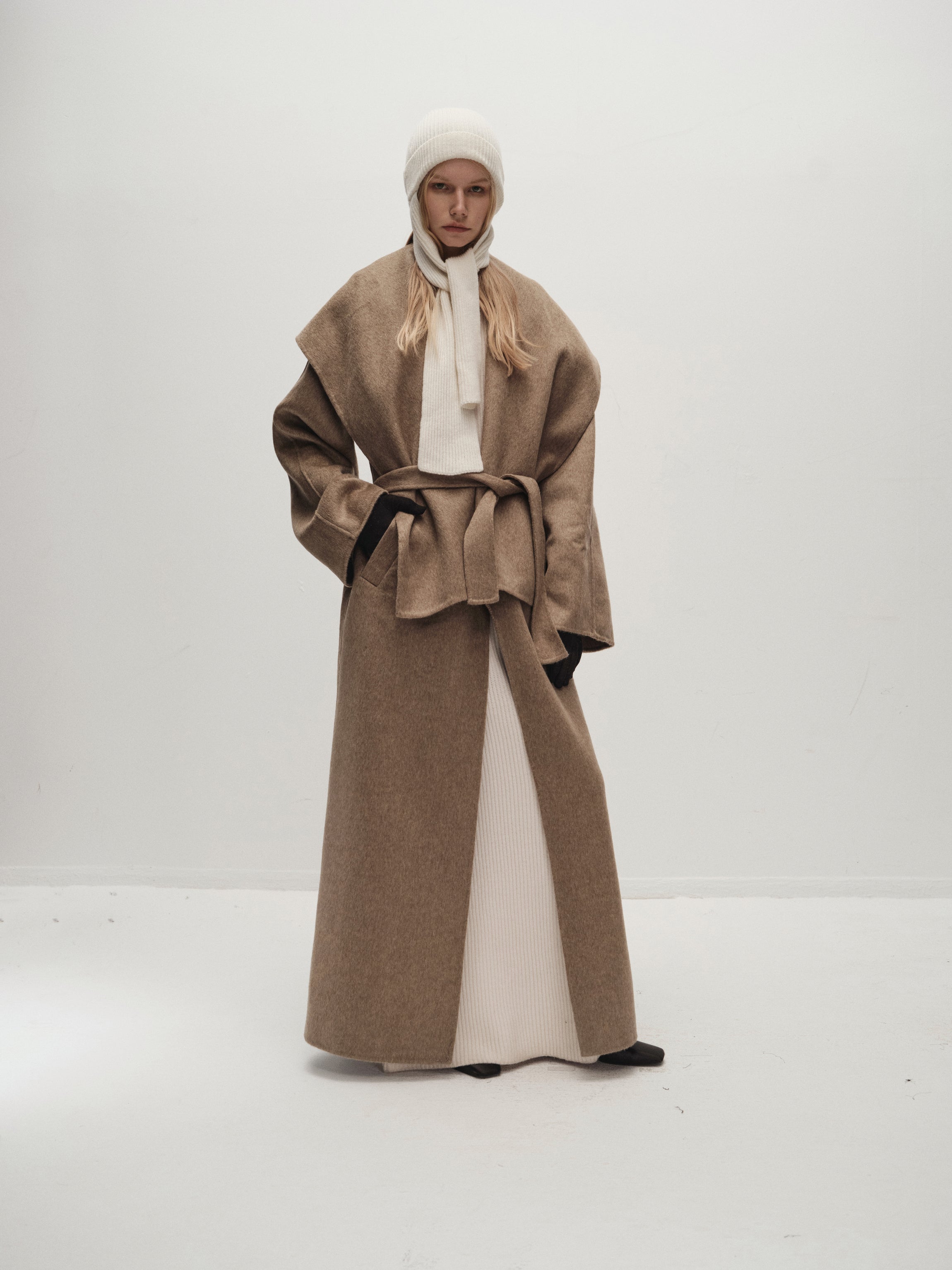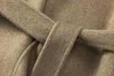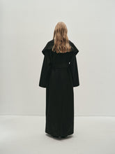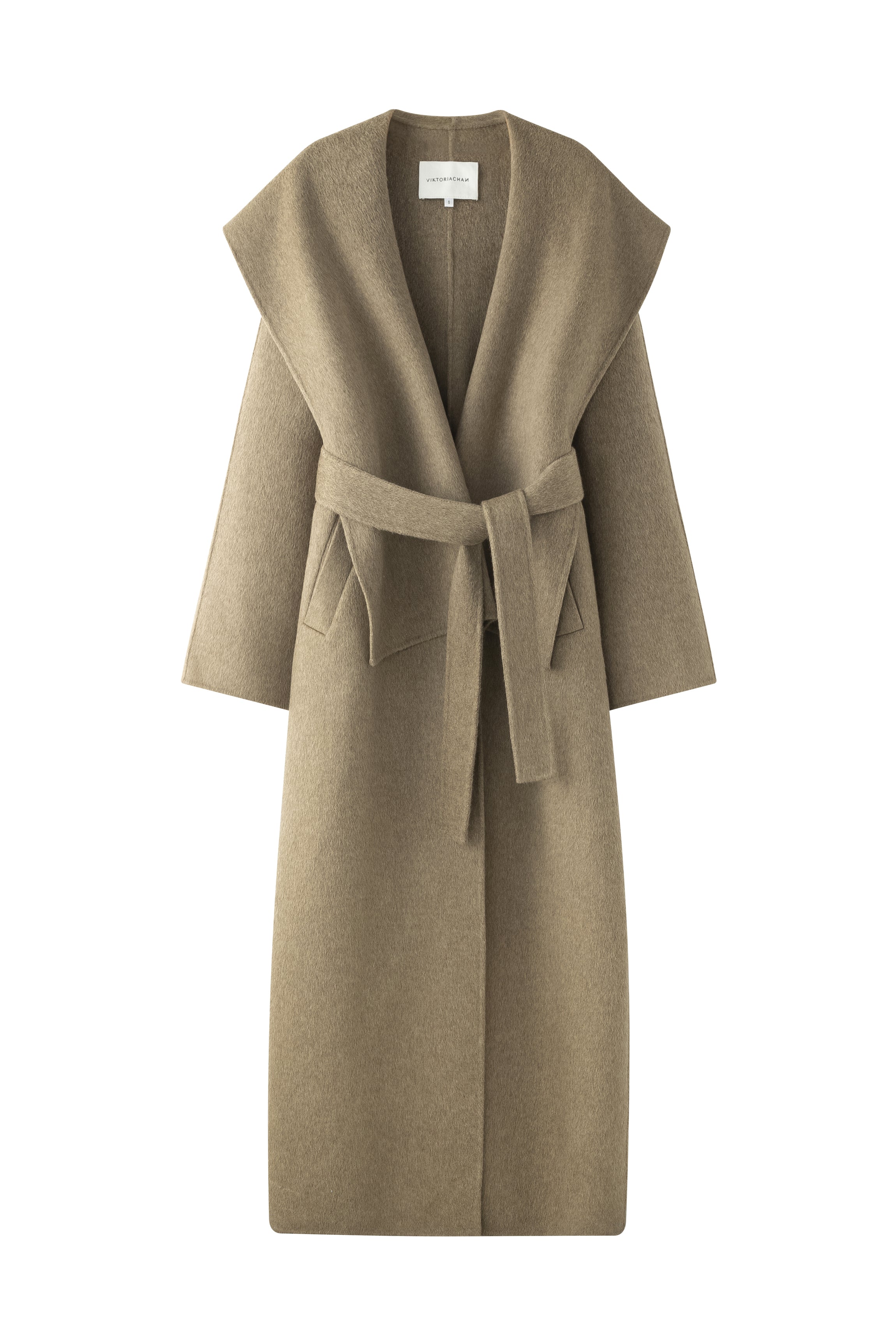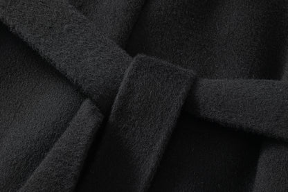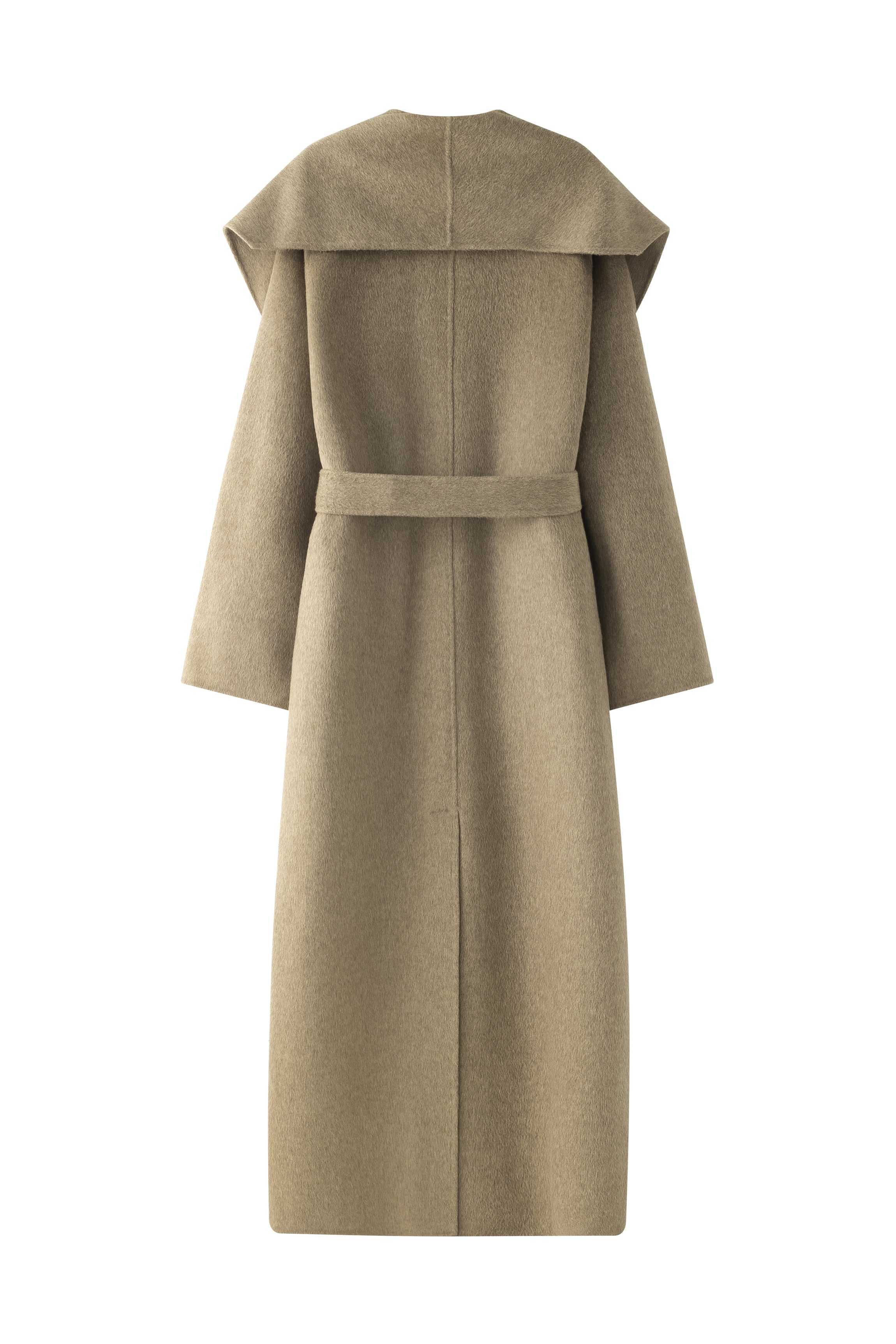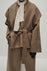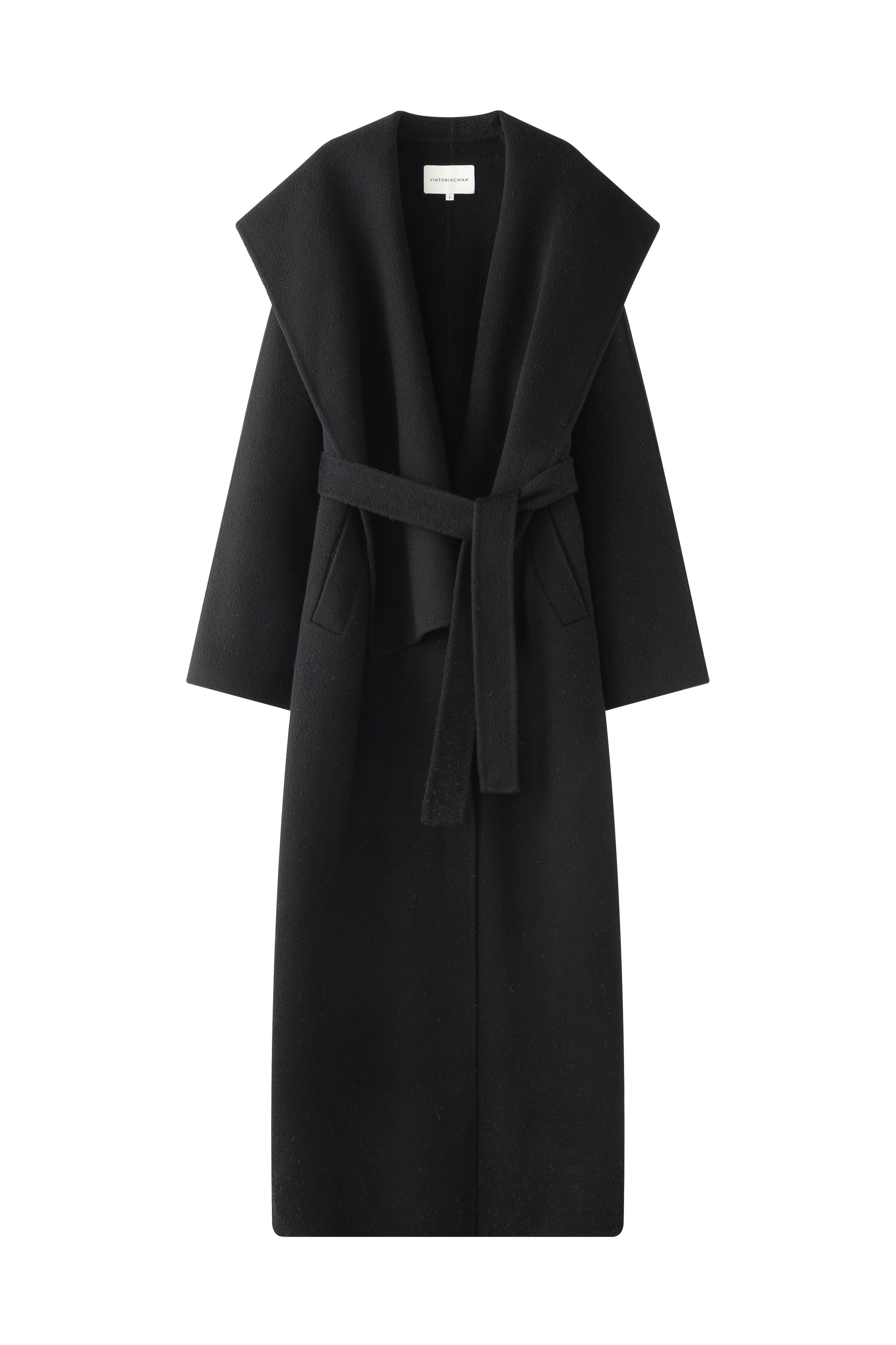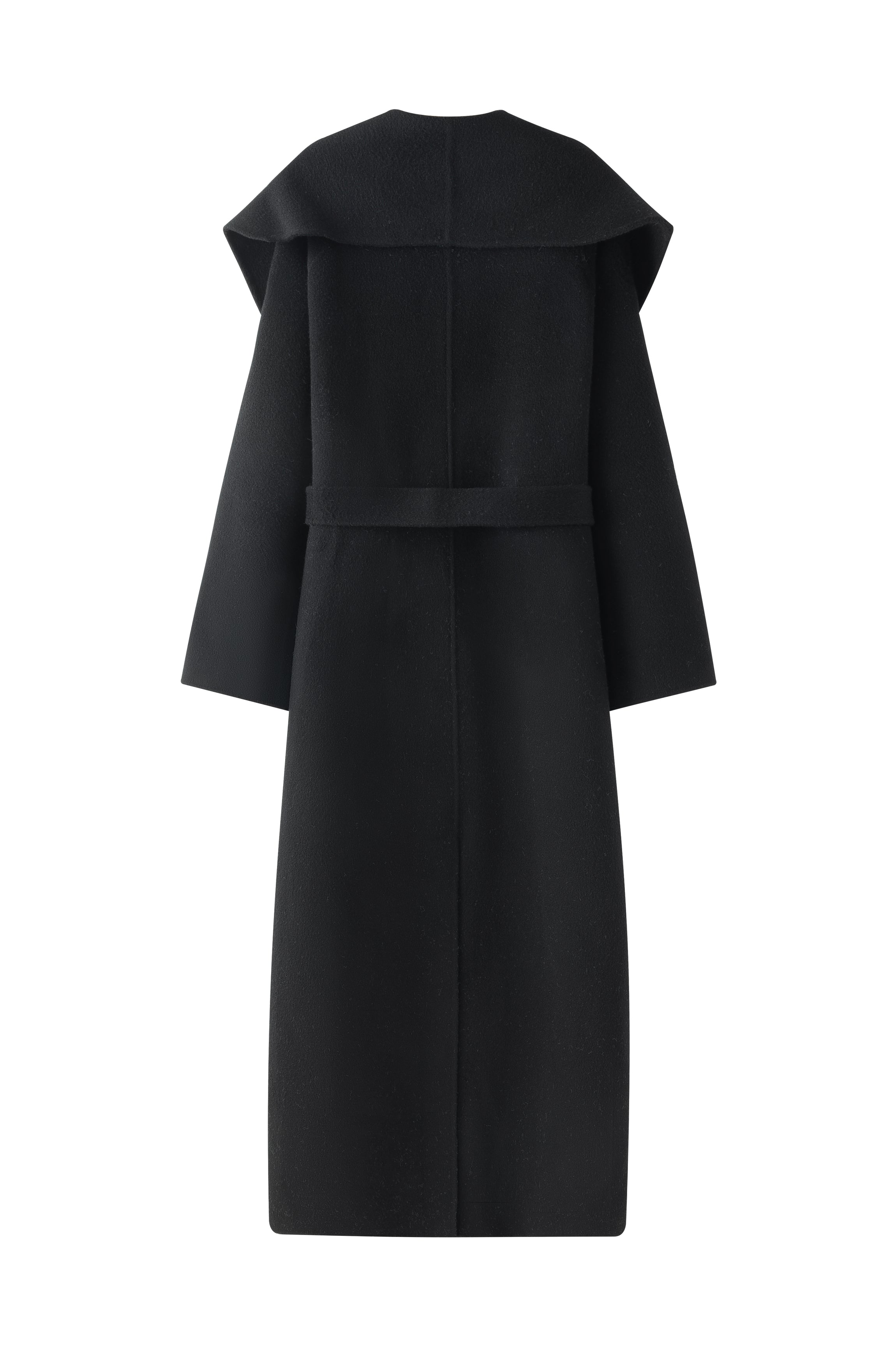 Unlined long coat with oversized shawl collar. Belted waist. Side-seam pockets. Back slit.