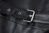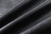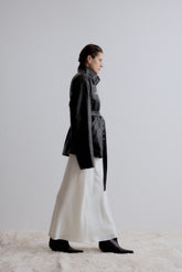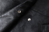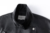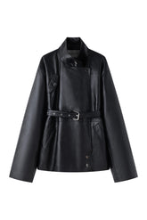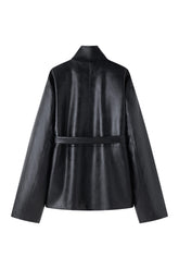 This black jacket features a high stand collar with a snap-button closure for a clean and structured look. The front fastening is secured with metal snaps, adding an indu...