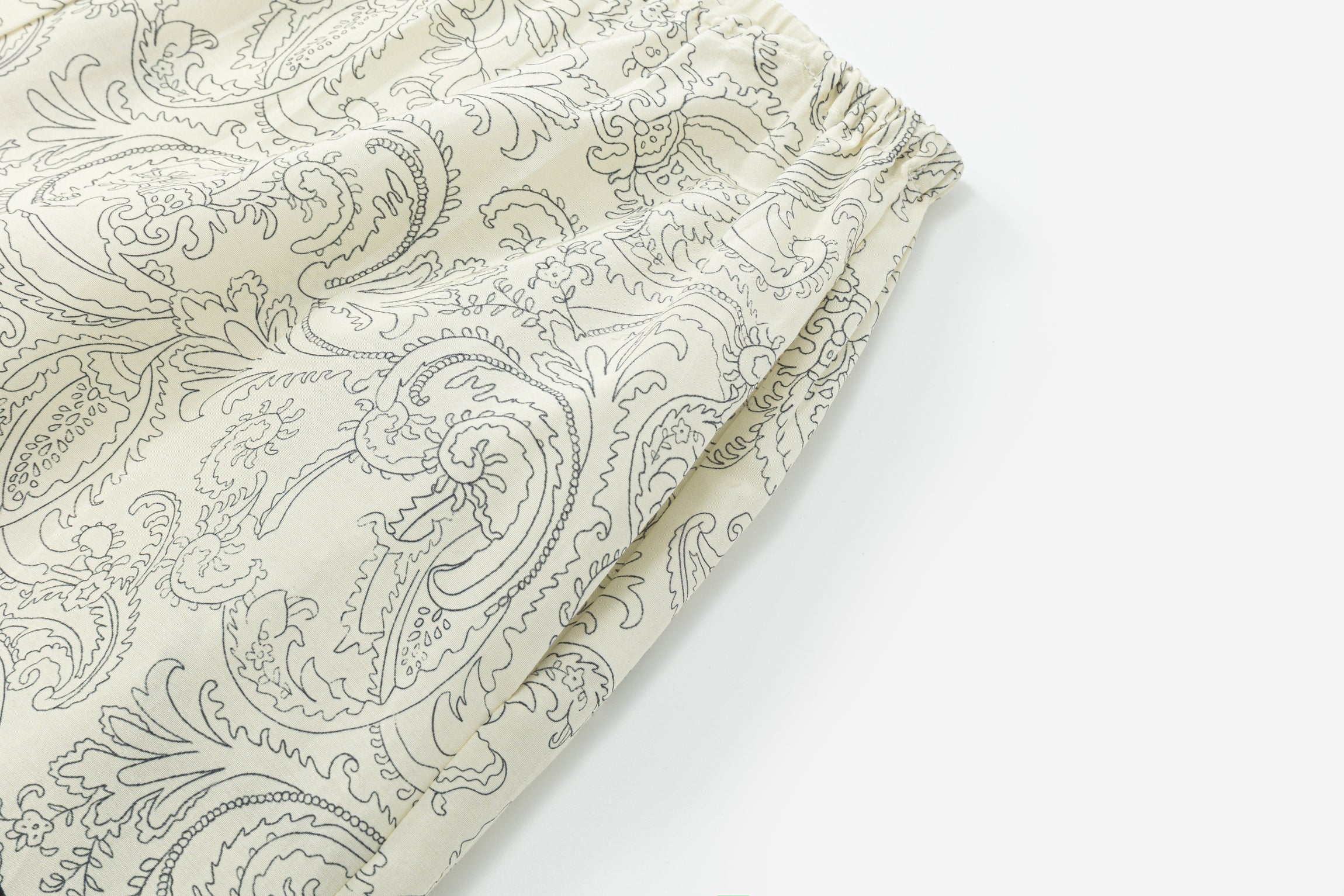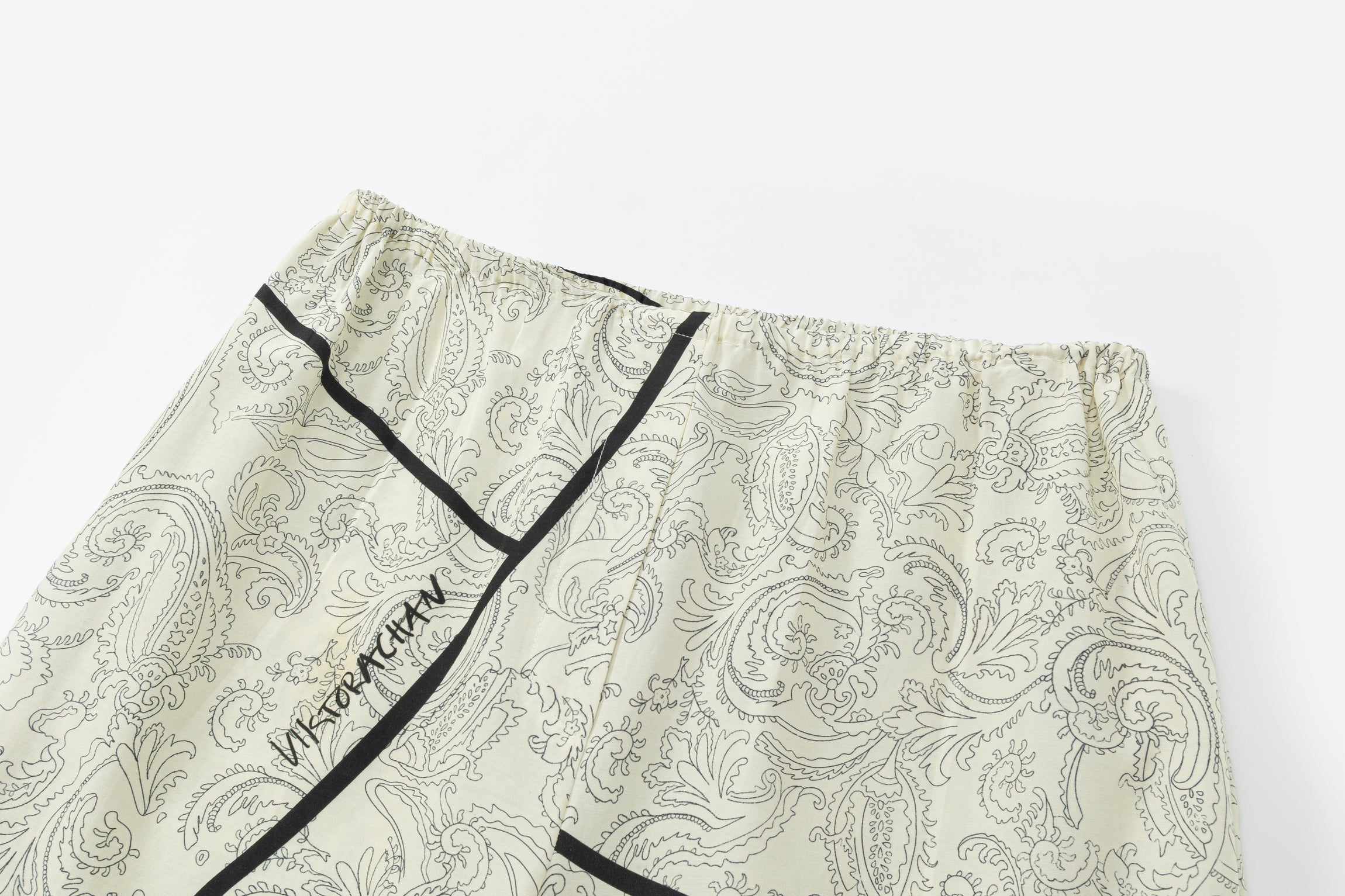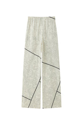 Loose printed beige silk trousers with graphic black lines and parsley pattern. Straight cut for a clean, contemporary look.