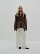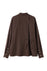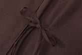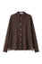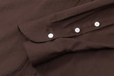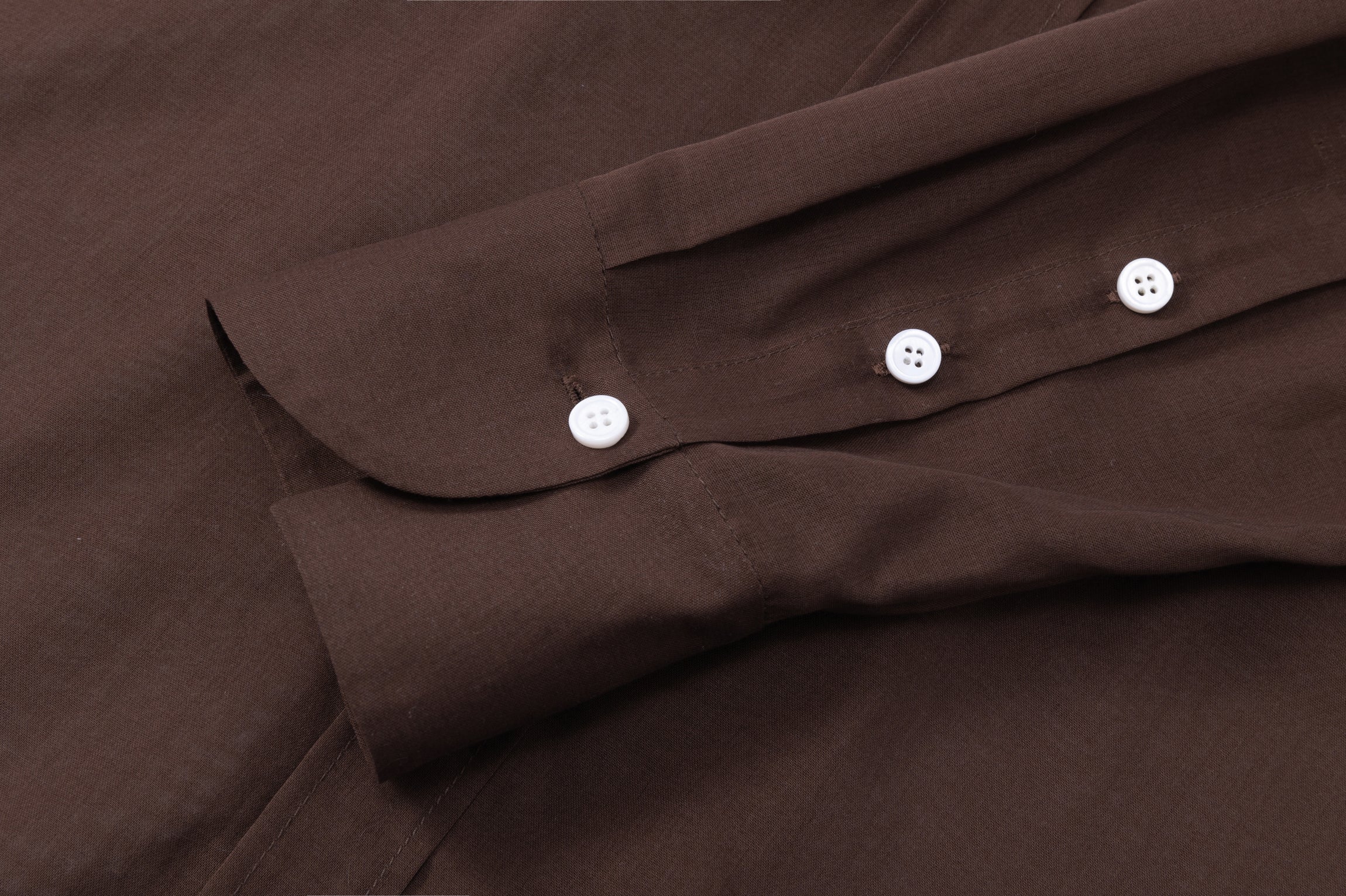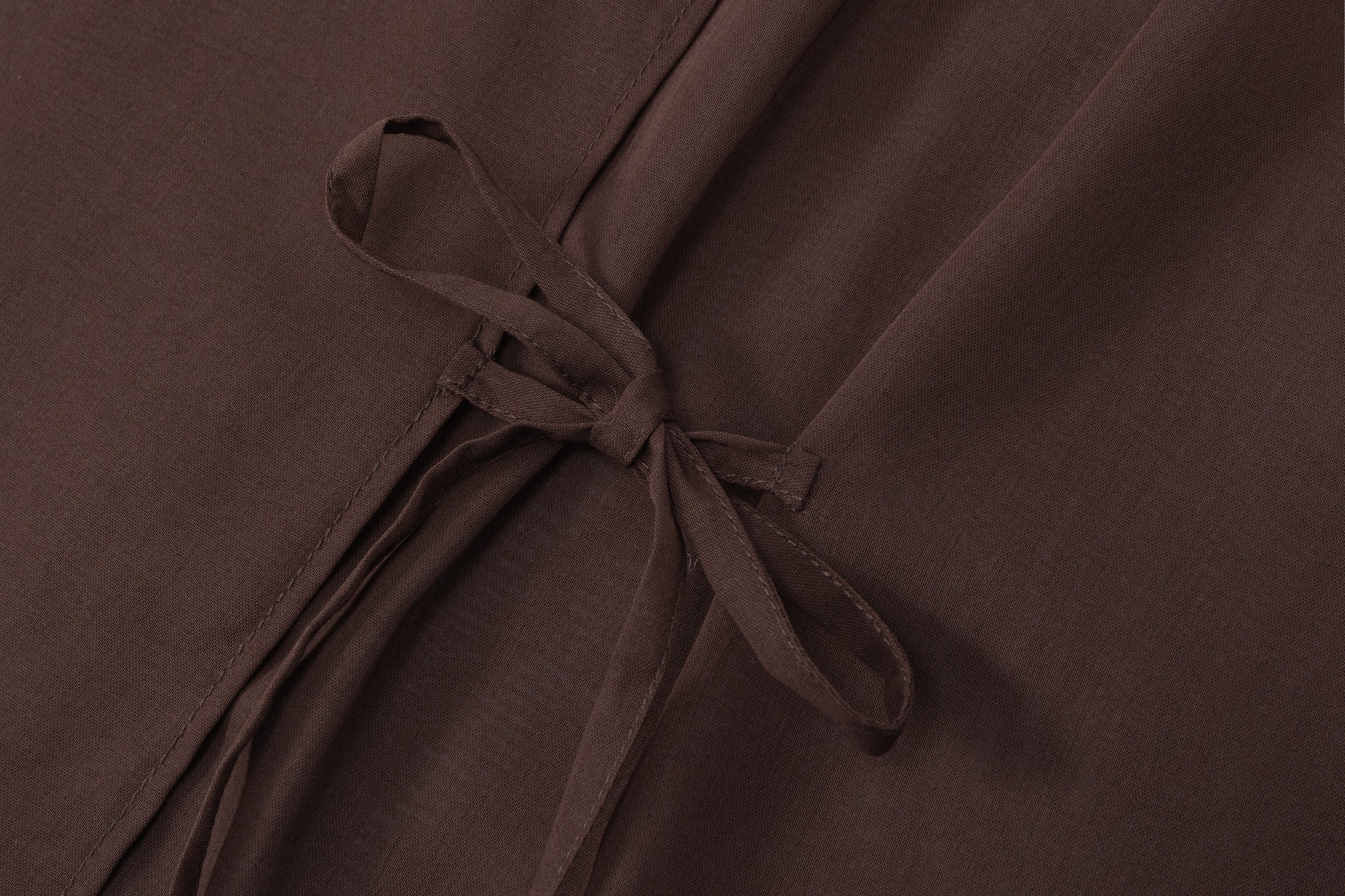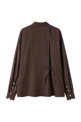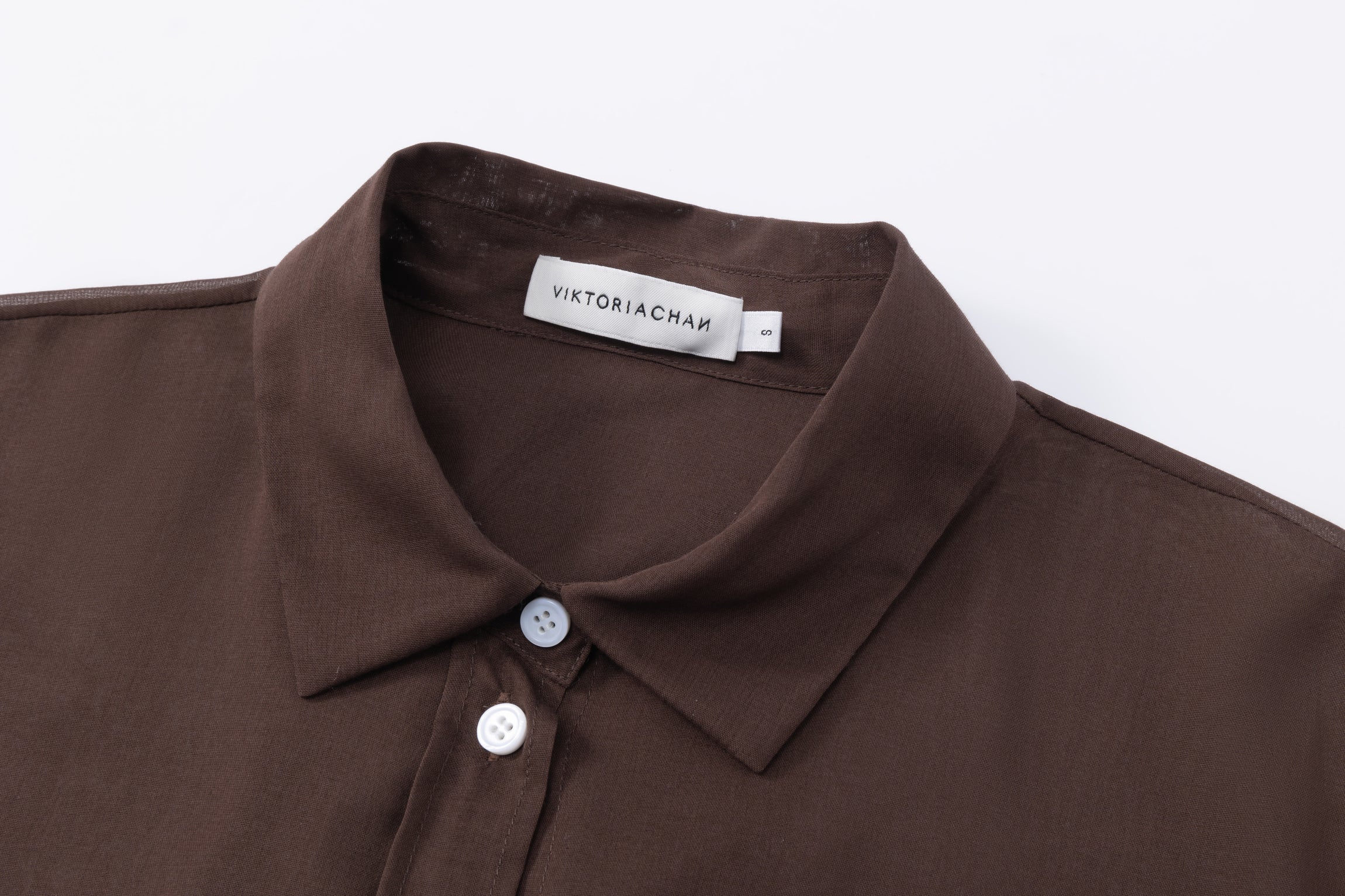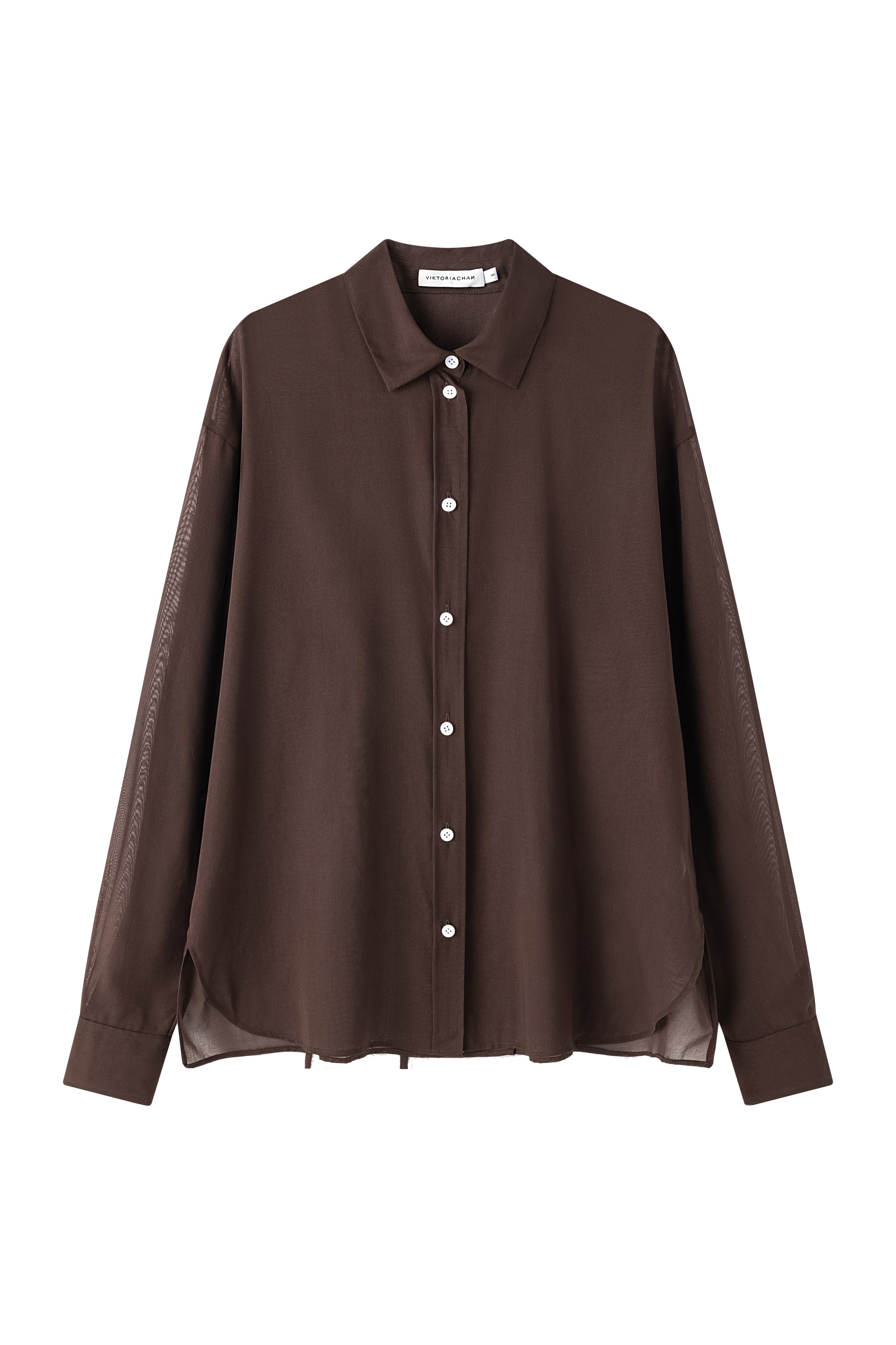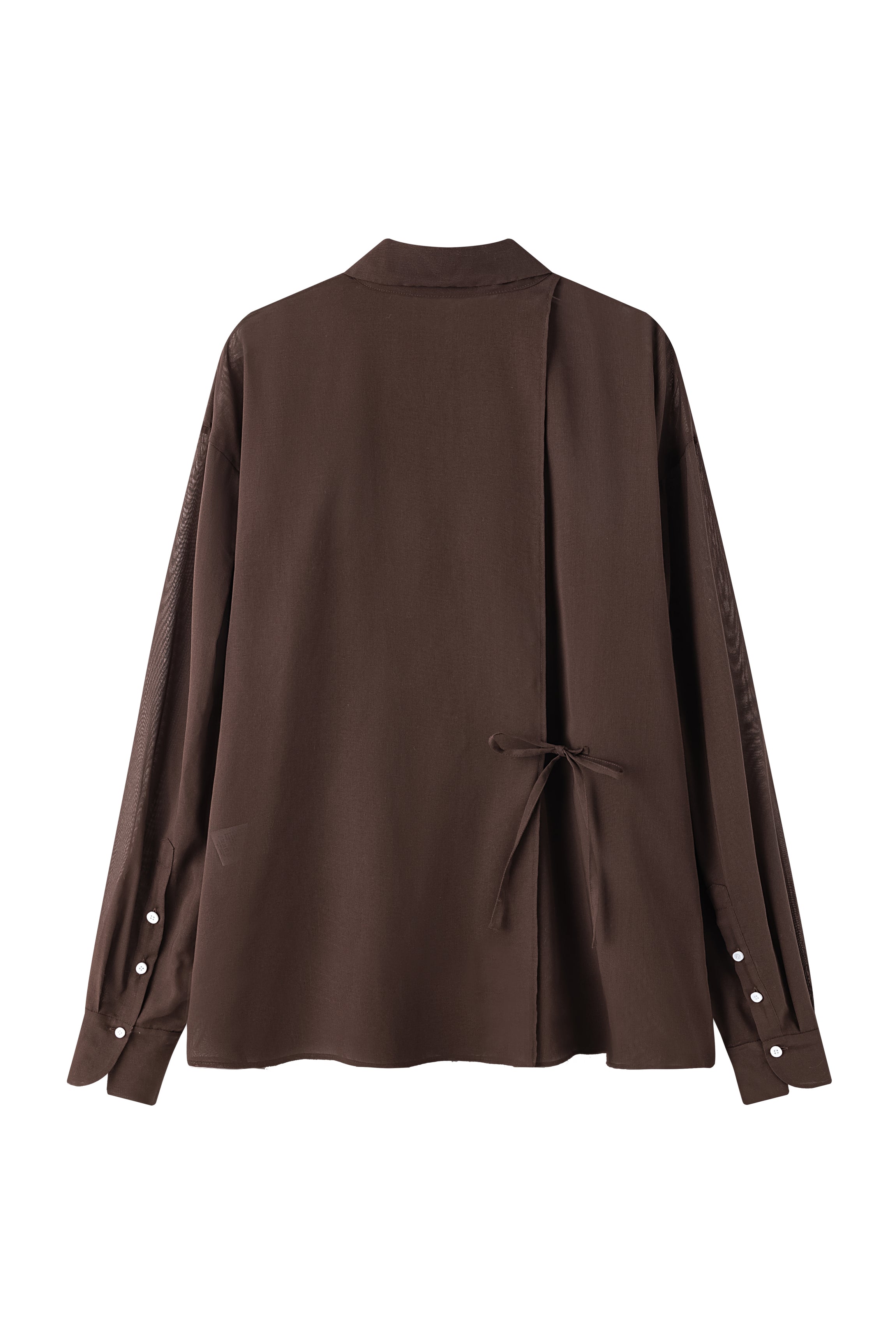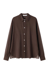 This is a sheer brown button-up shirt with a loose, relaxed fit. It has a classic collar, long sleeves with wide cuffs, and a slightly shiny, lightweight fabric. Back tie detail for adde...