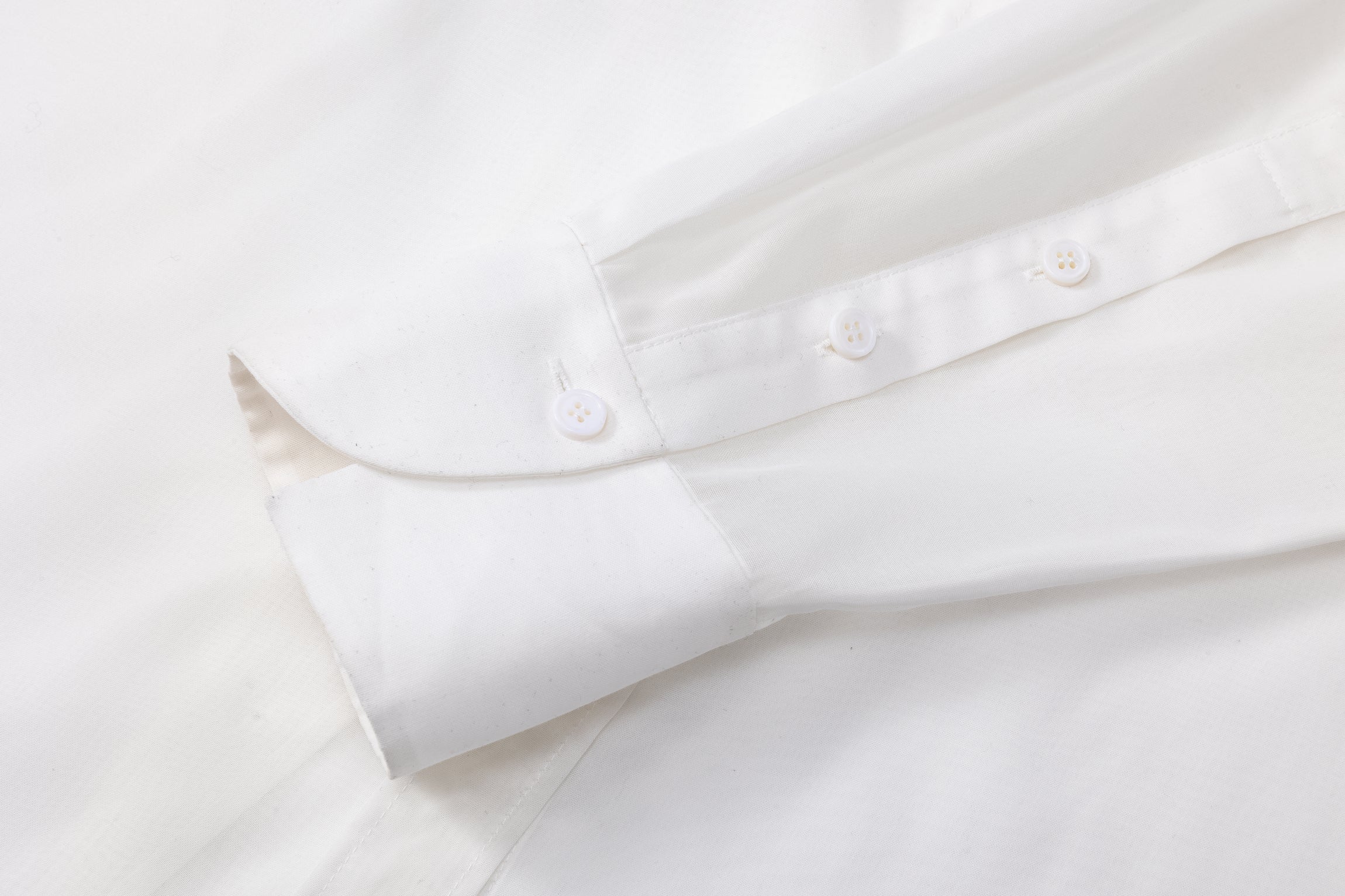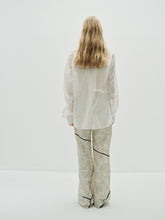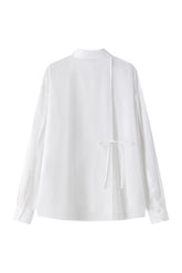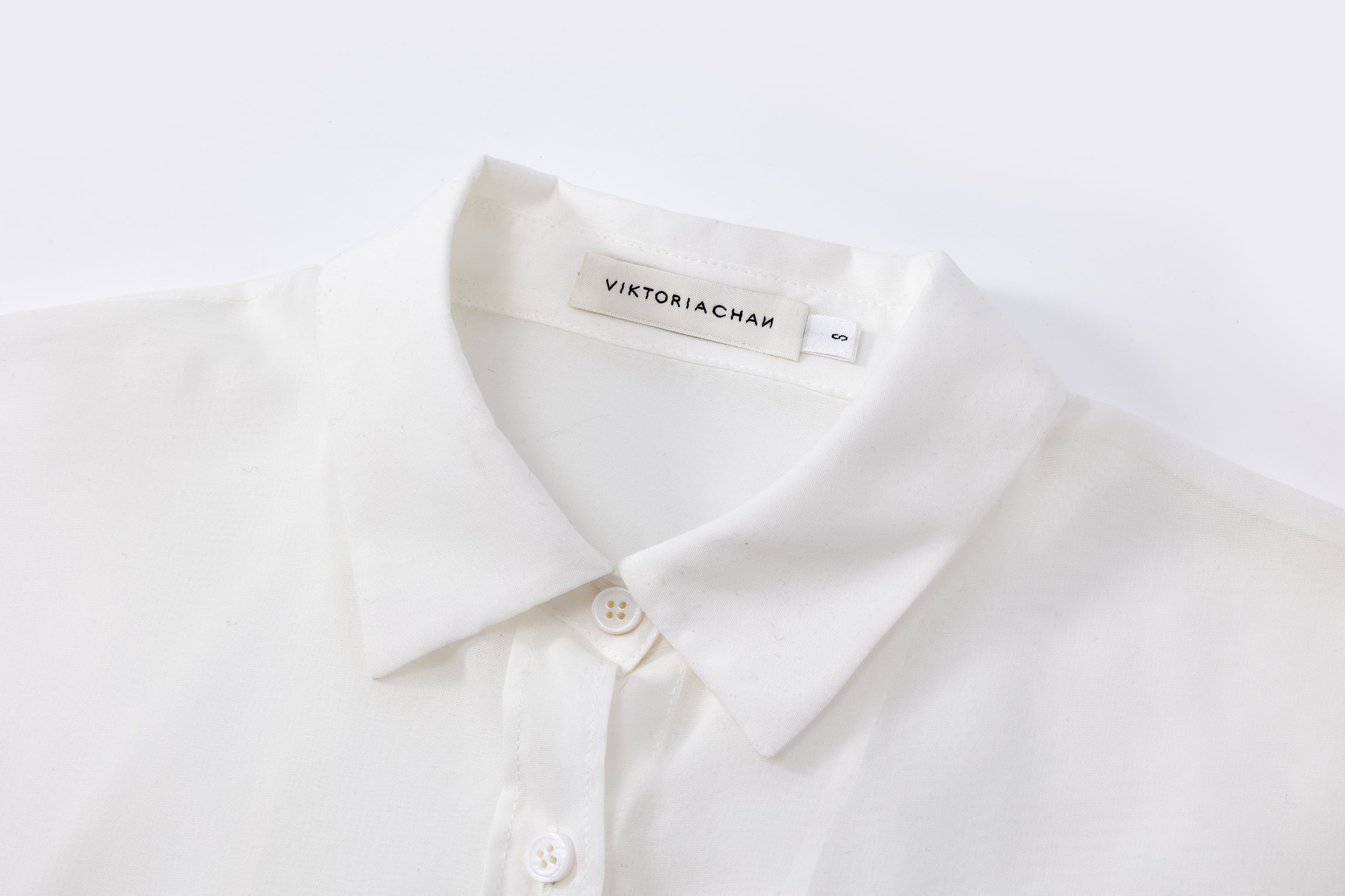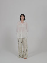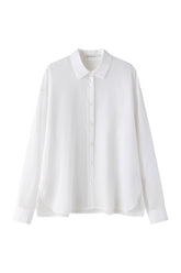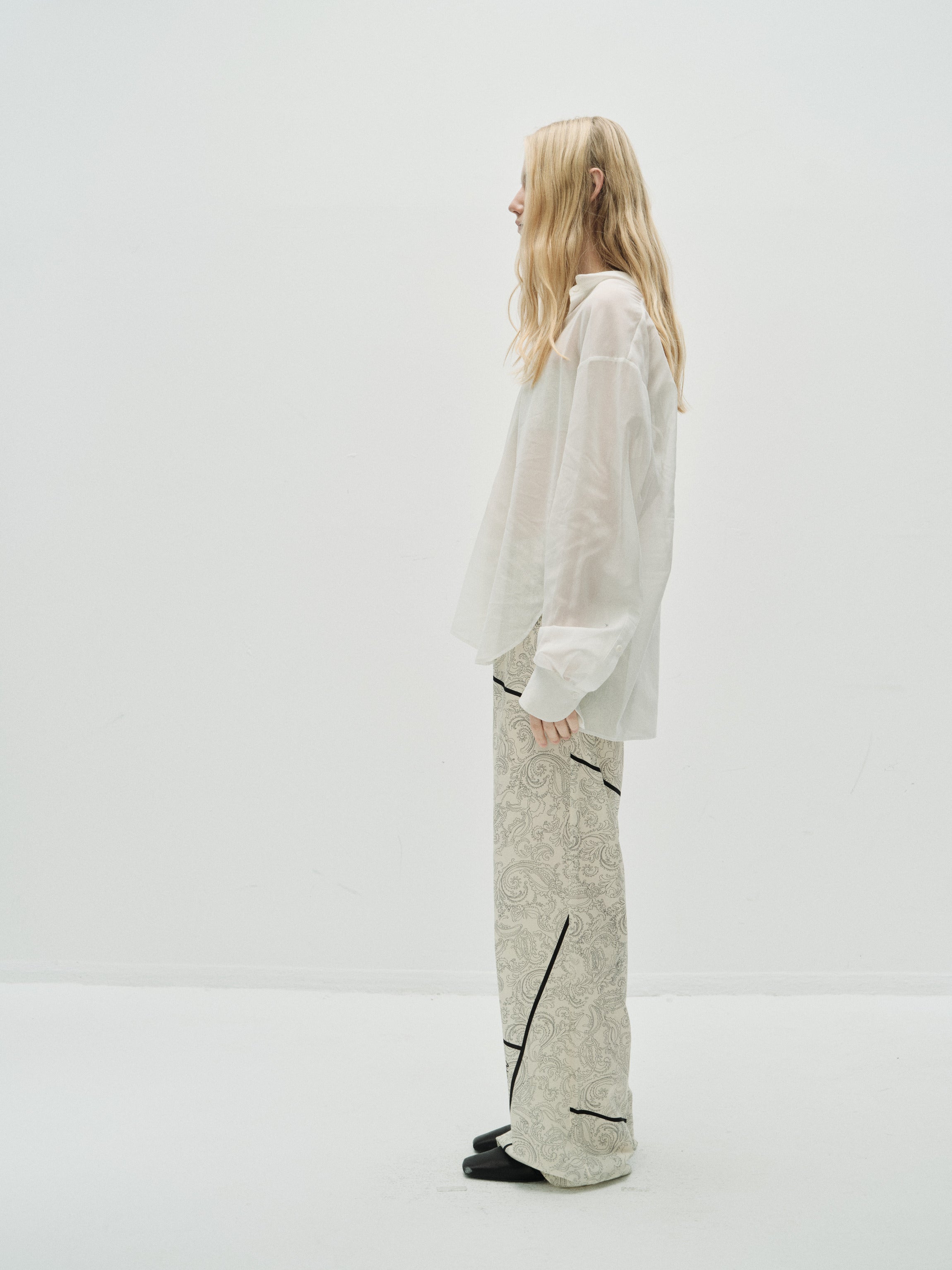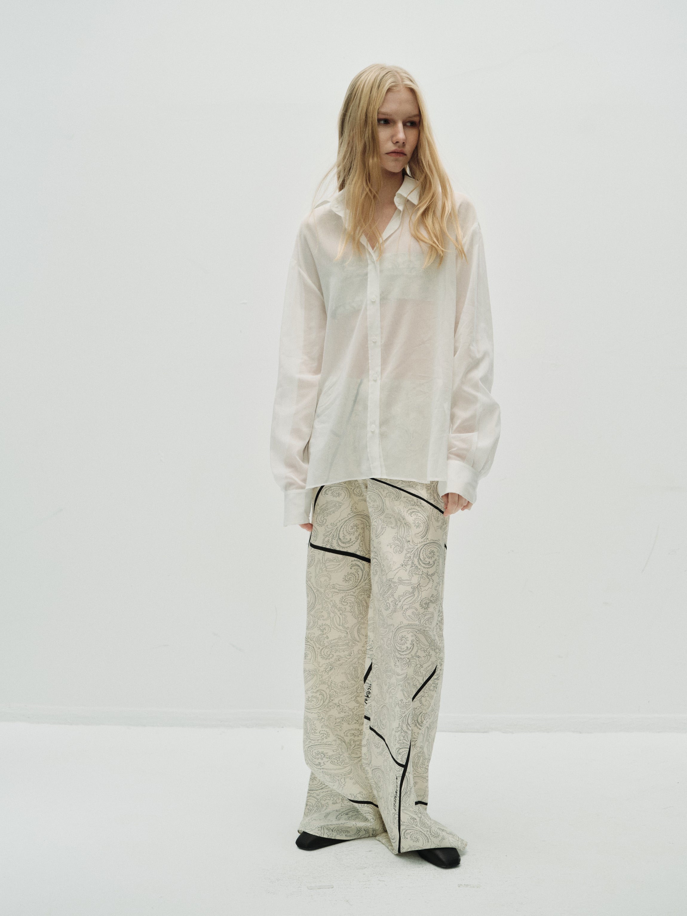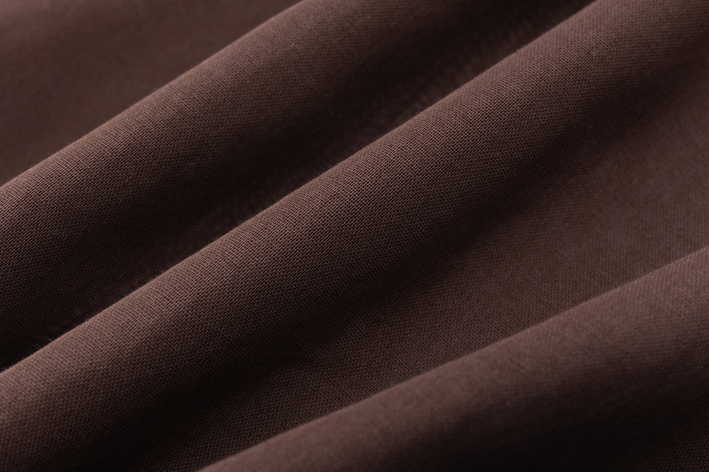 This is a sheer brown button-up shirt with a loose, relaxed fit. It has a classic collar, long sleeves with wide cuffs, and a slightly shiny, lightweight fabric. Back tie detail for adde...