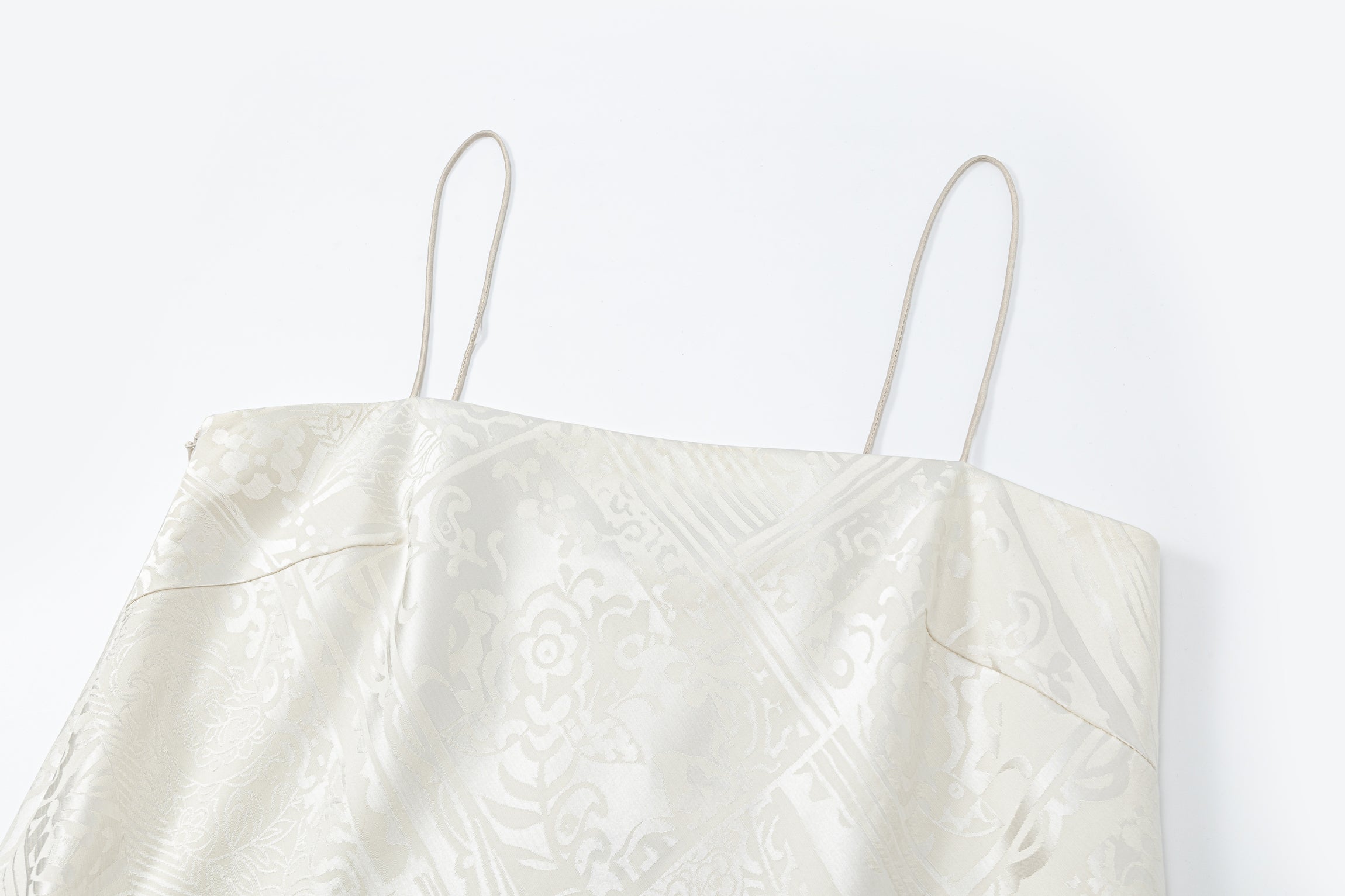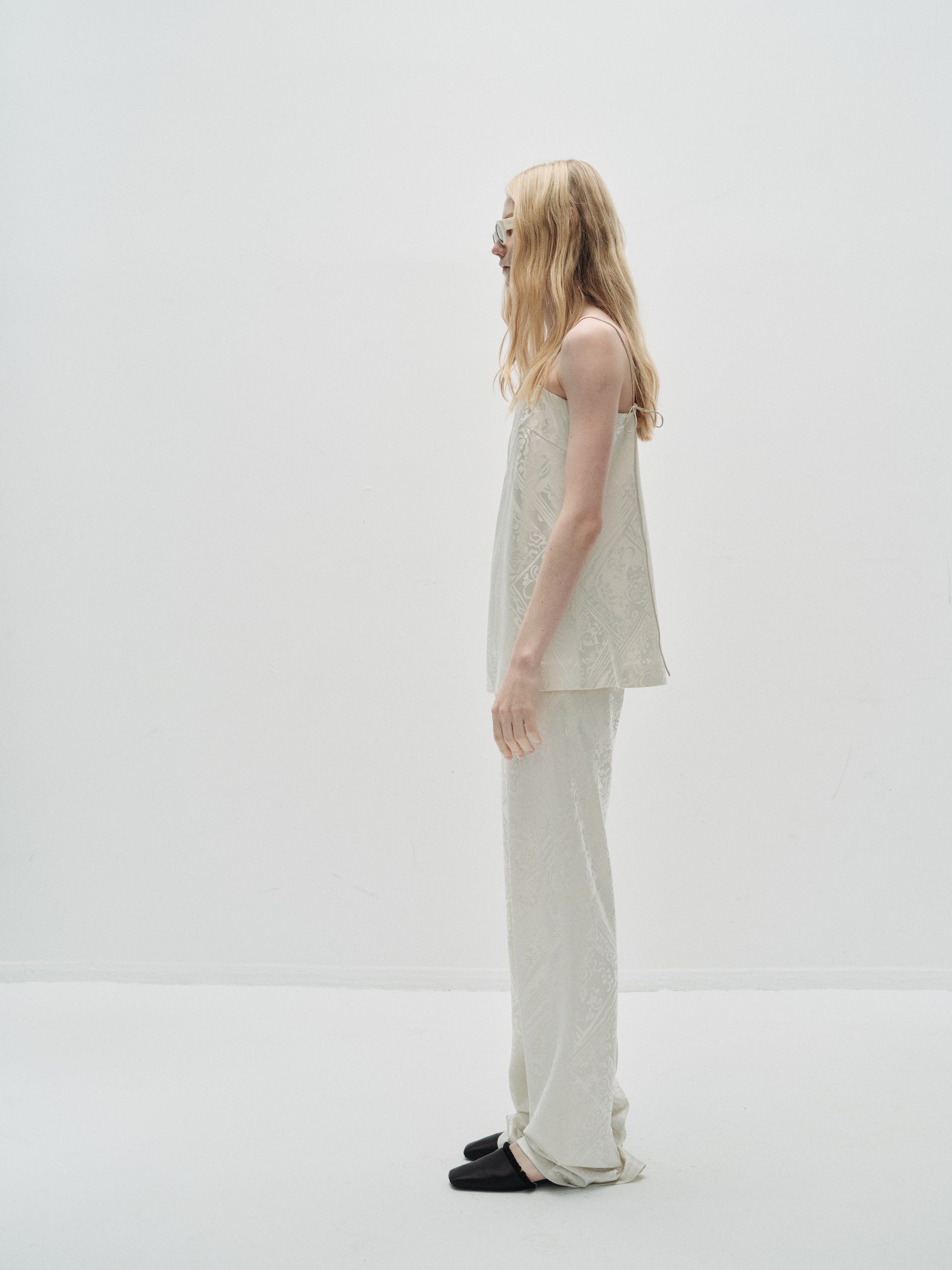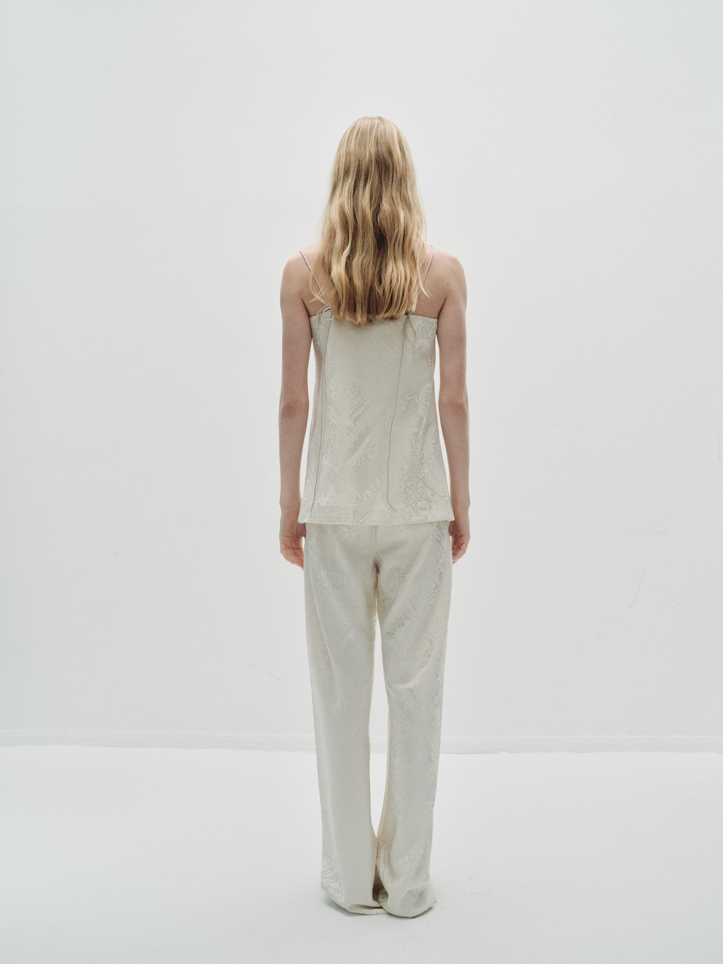 Spaghetti strap top in a silk-like jacquard, featuring a delicate shine and an all-over woven pattern. To be paired with the Tina jacquard trousers.