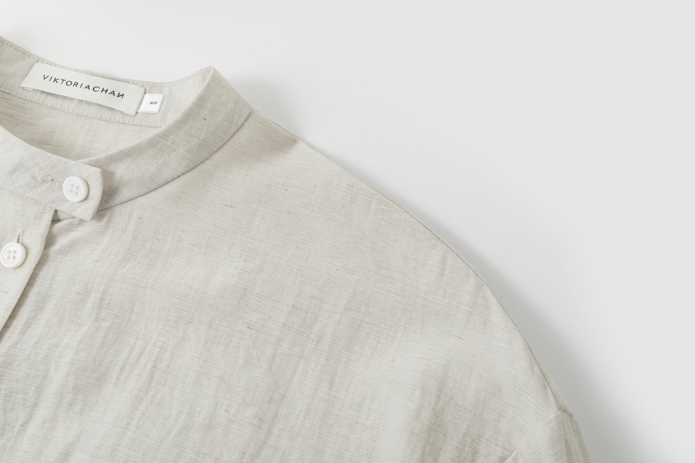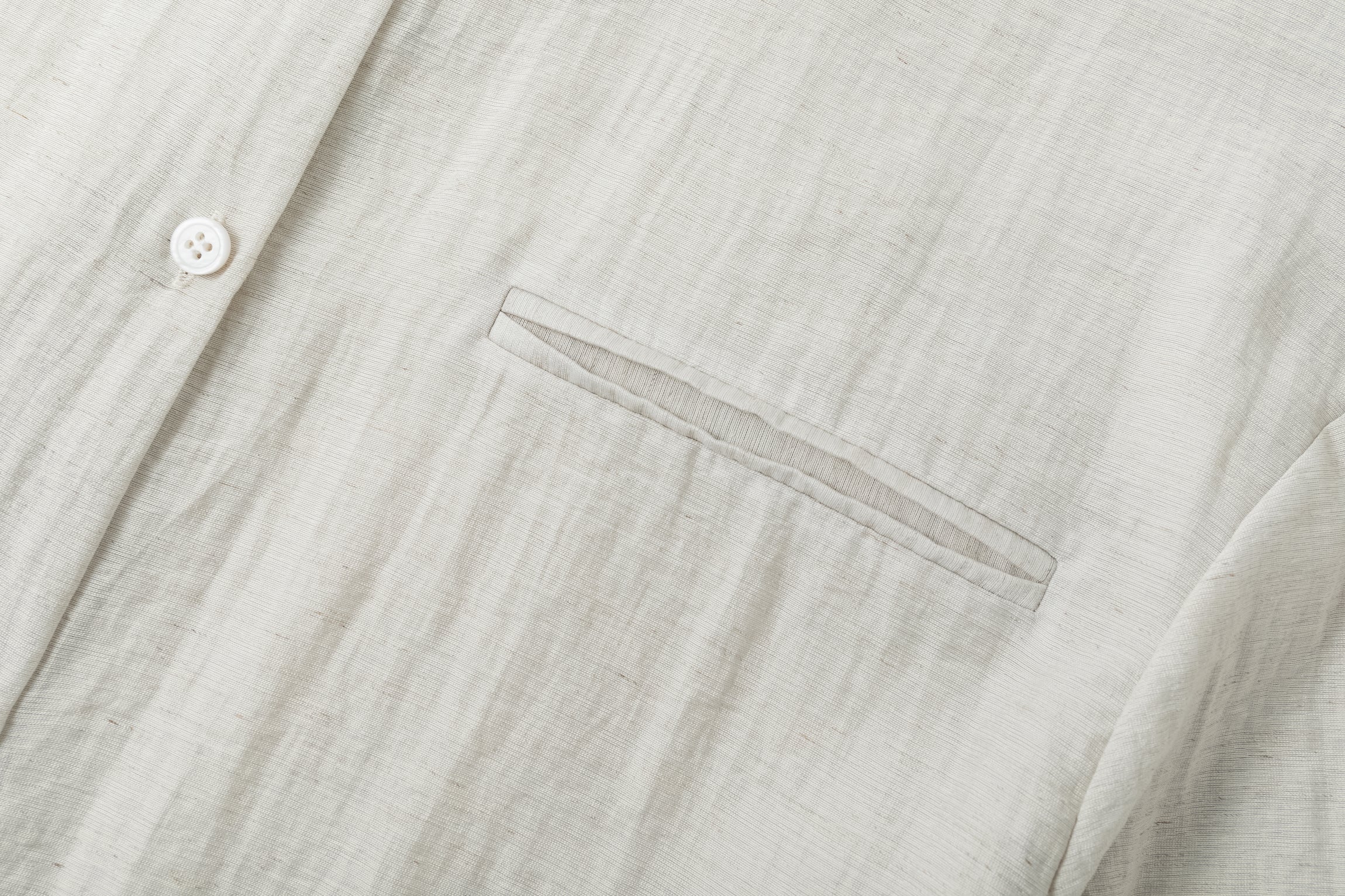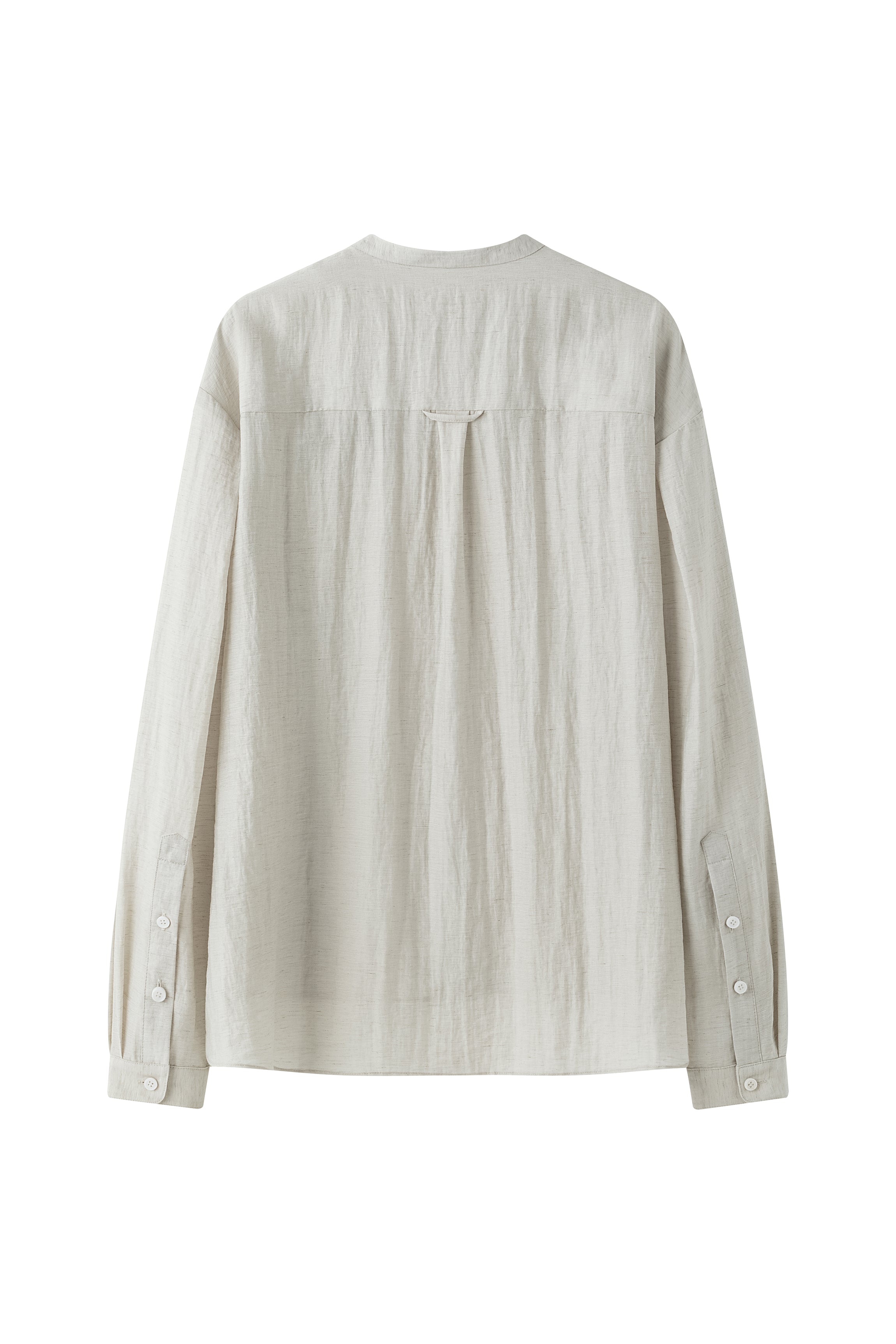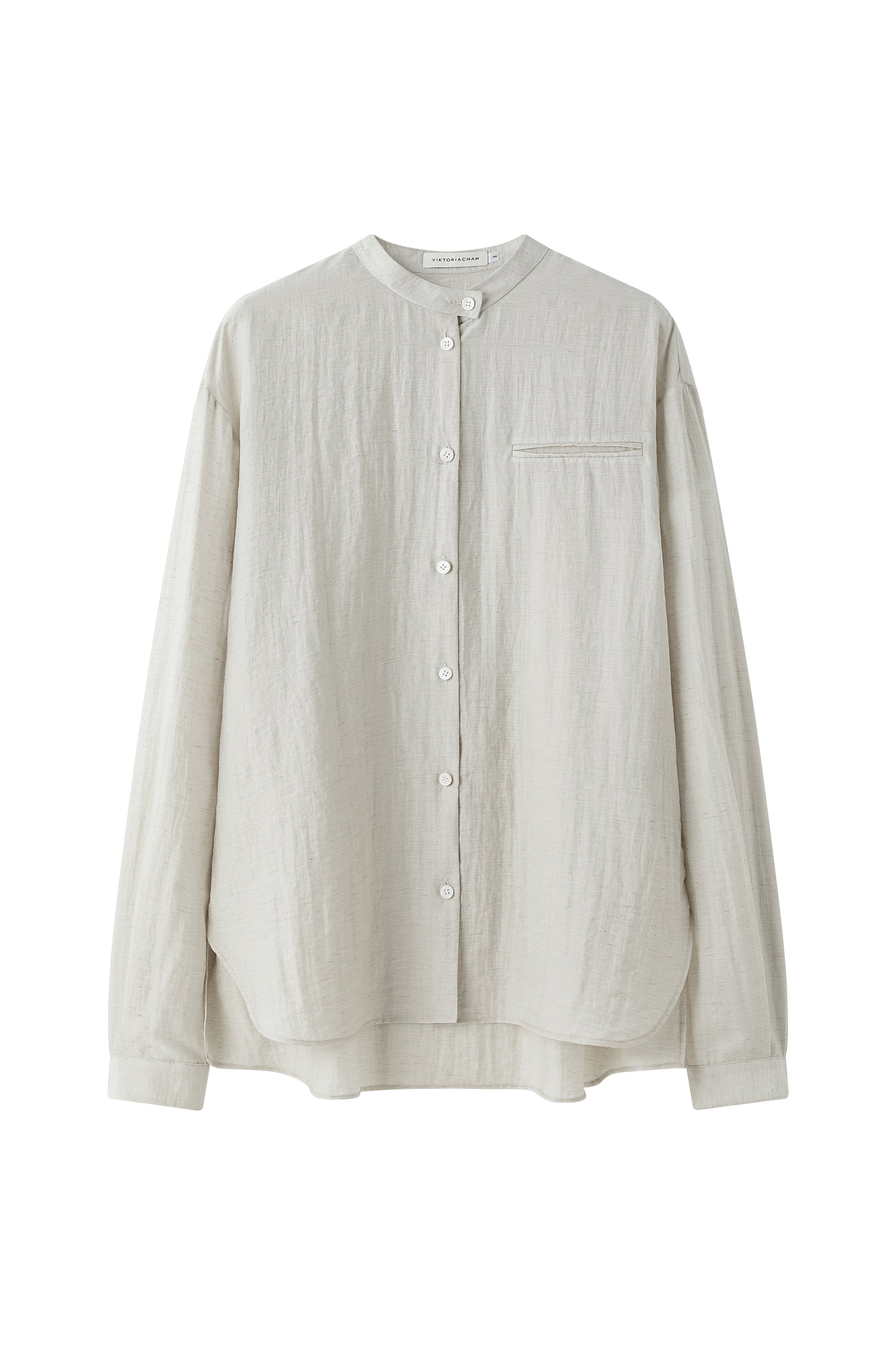 Lightweight shirt featuring a minimalist Mao collar, a single front welt pocket and delicate white buttons. Designed with dropped shoulders for a relaxed silhouette and an airy, effort...