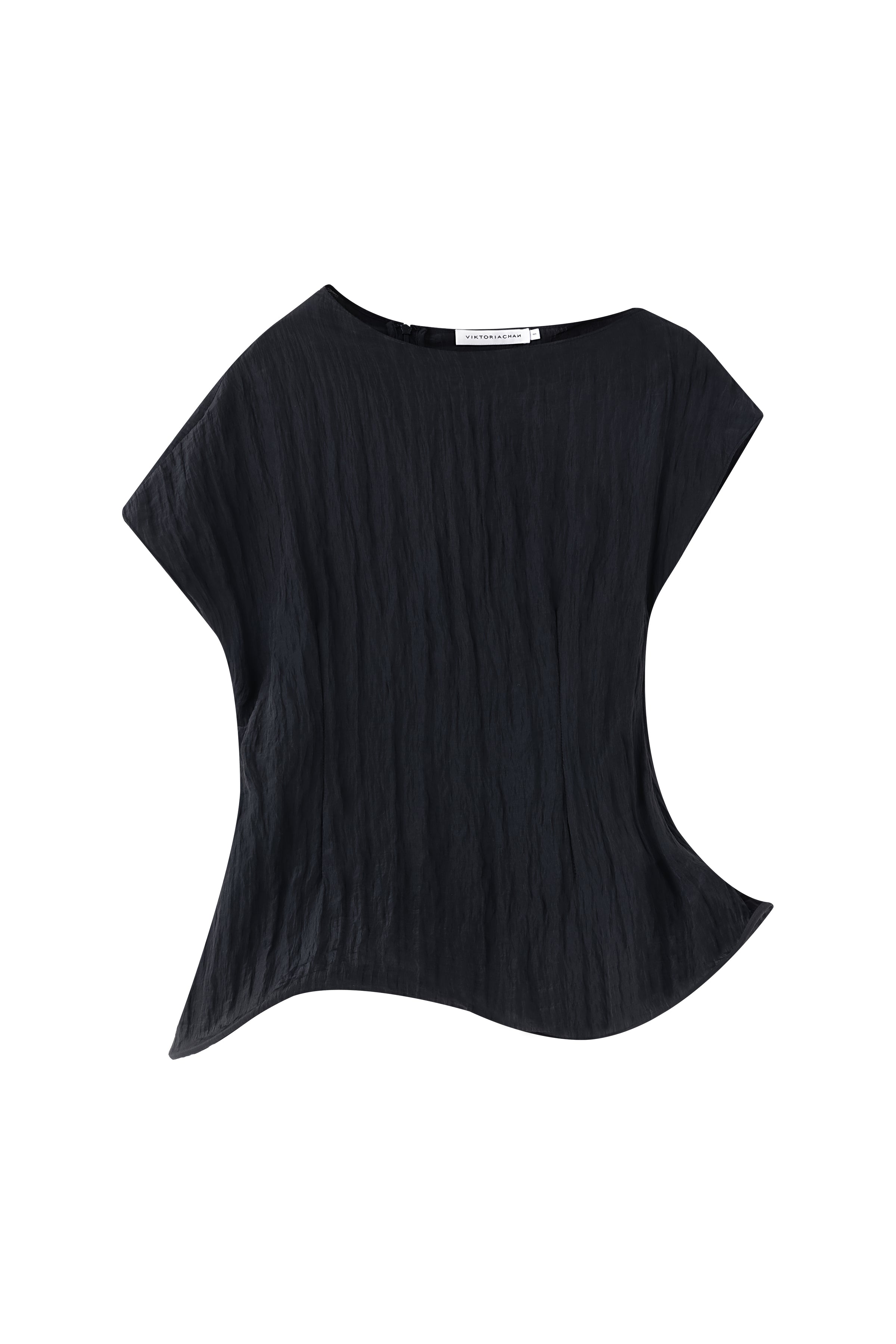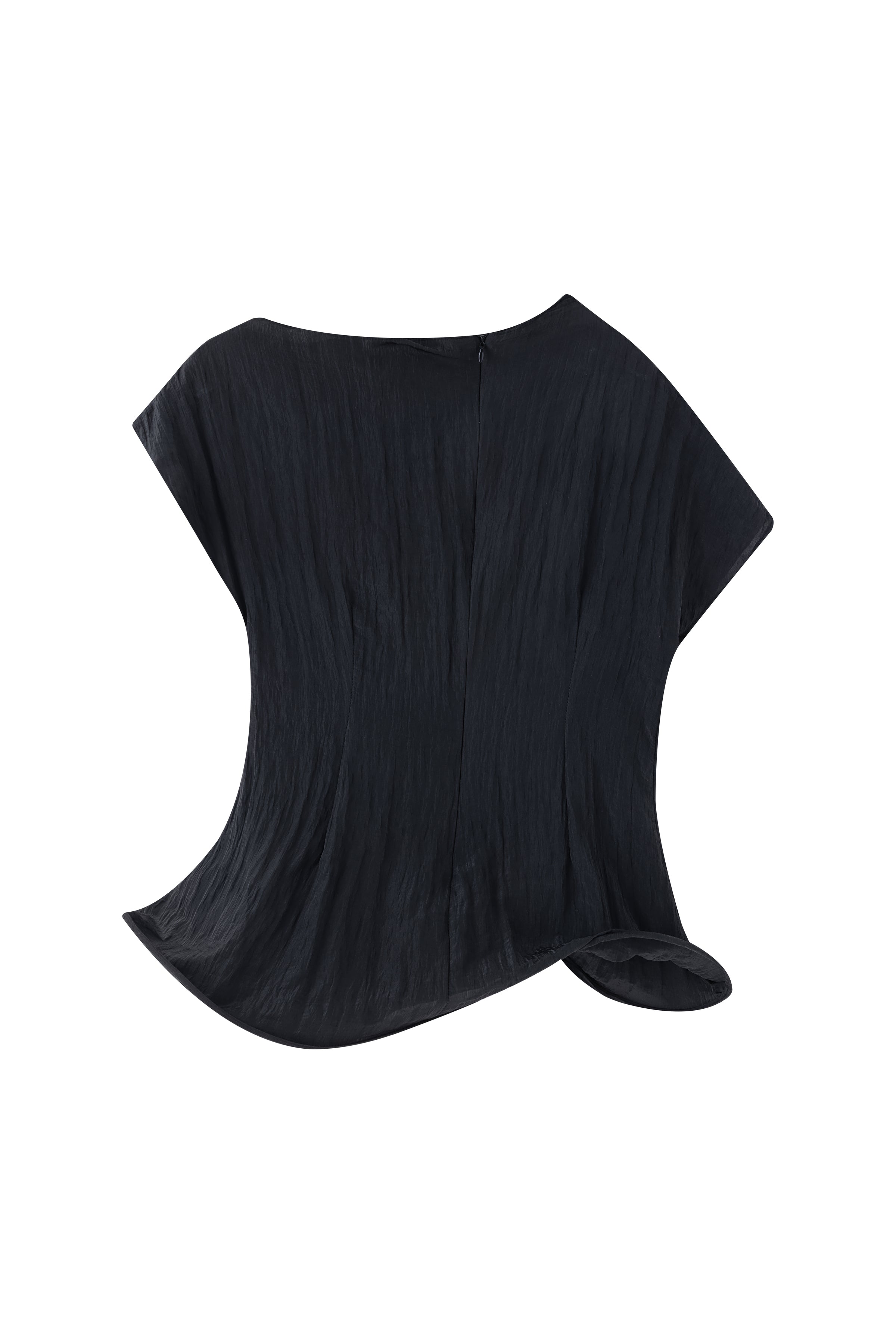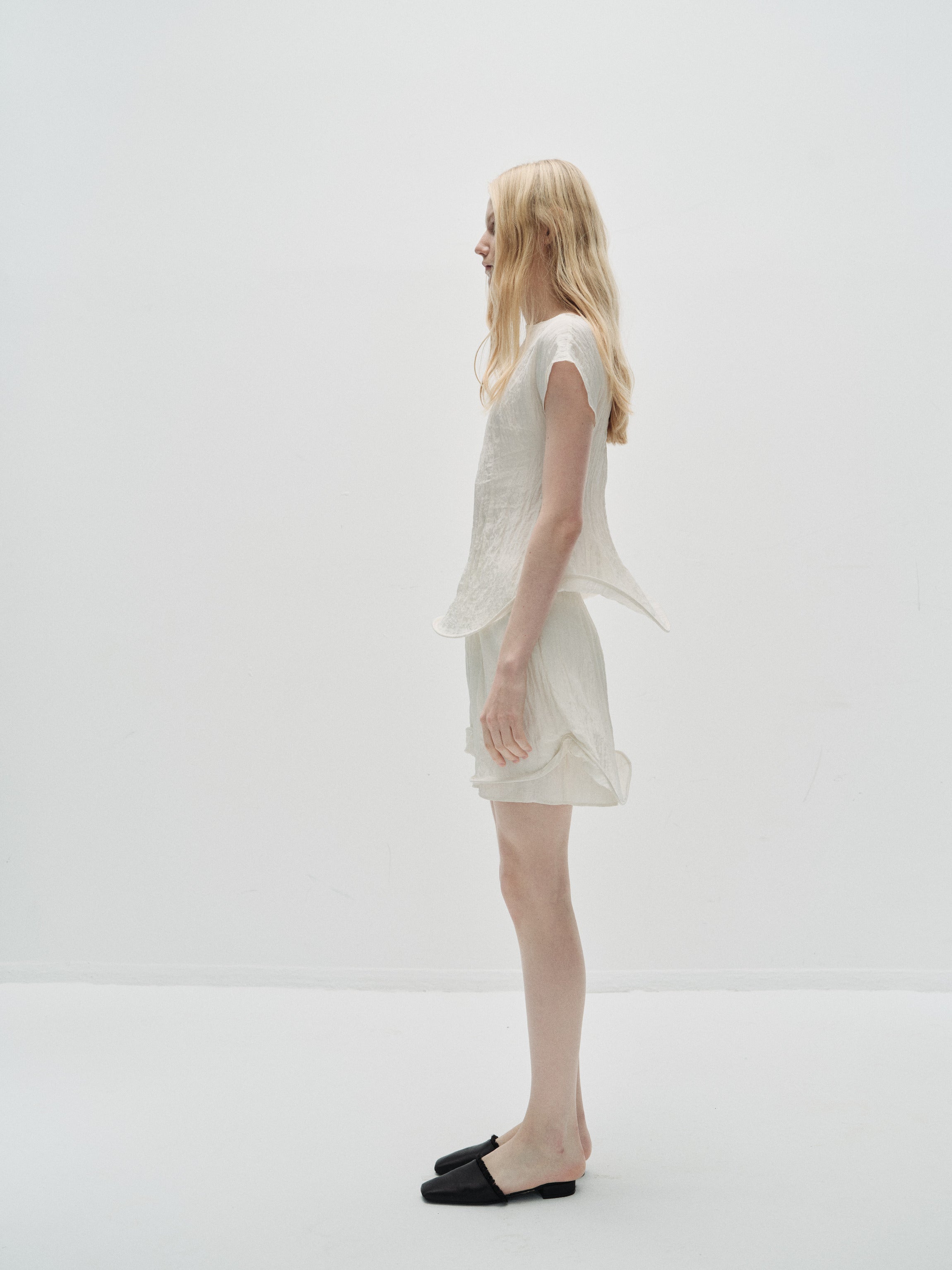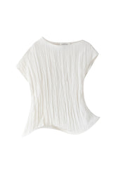Crinkled short-sleeved top with an asymmetrical stiff hemline creating a gentle twirling effect. To be paired with the matching Uni short skirt.