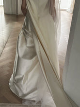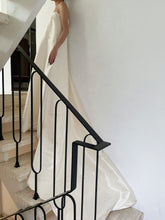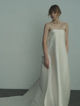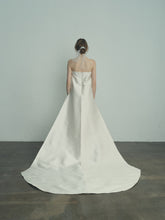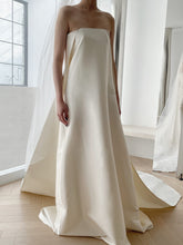 The design features a timeless strapless neckline that gracefully frames the shoulders, flowing into an A-line silhouette with a long train for a dramatic effect. The structured wool and...