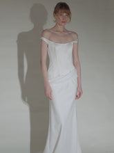 This vintage-inspired gown features a structured corset bodice paired with elegant folded skirt details, beautifully enhancing the silhouette. The design creates a timeless, flattering s...