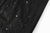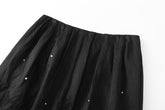 Long skirt with a crinkled finish adding texture. Glued-on rhinestones for a touch of sparkle. Elastic waistband and side pockets.