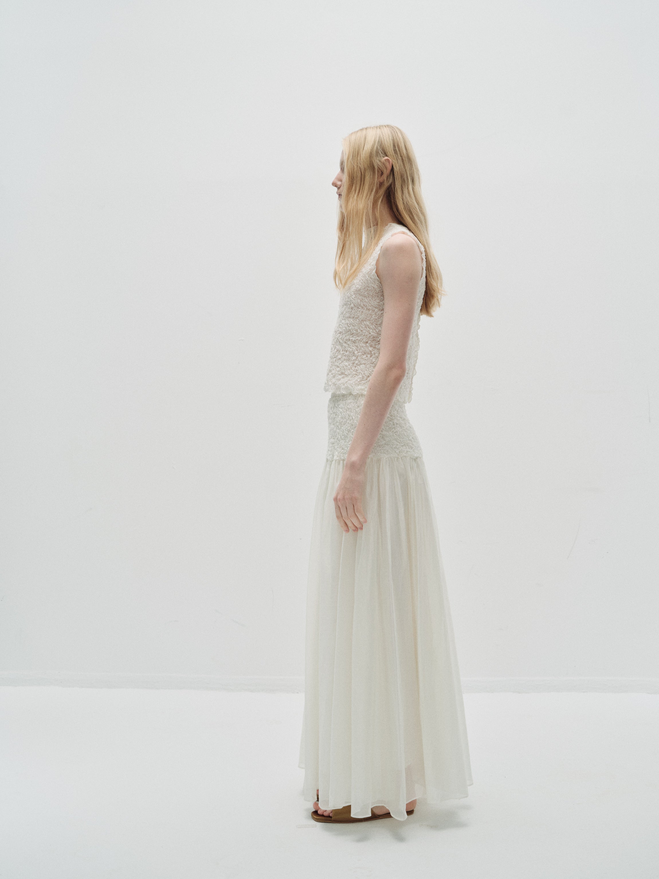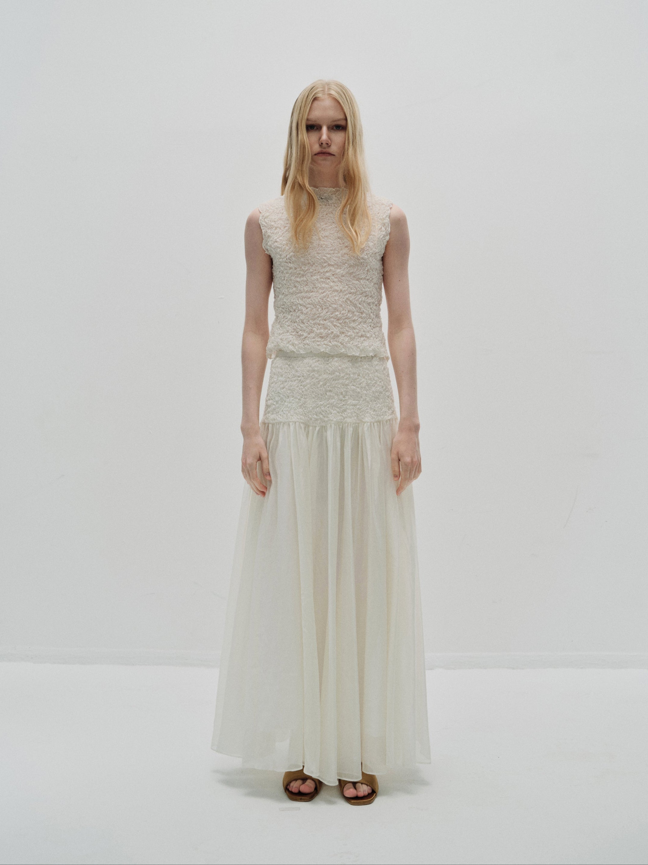 A long, flowing skirt in a lightweight crinkled fabric. The gathered waist adds gentle fullness, while the semi-transparent layers create movement and softness. Its floor-grazing length ...