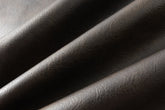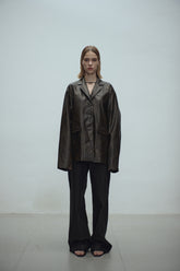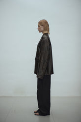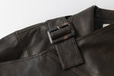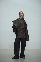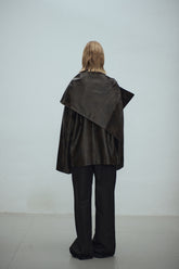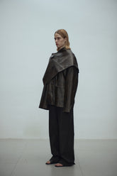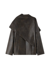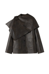 Brown textured leather jacket featuring an additional fabric piece that acts as a scarf or a poncho, with a tortoiseshell buckle. The jacket has tone-on-tone buttons and patch pockets.