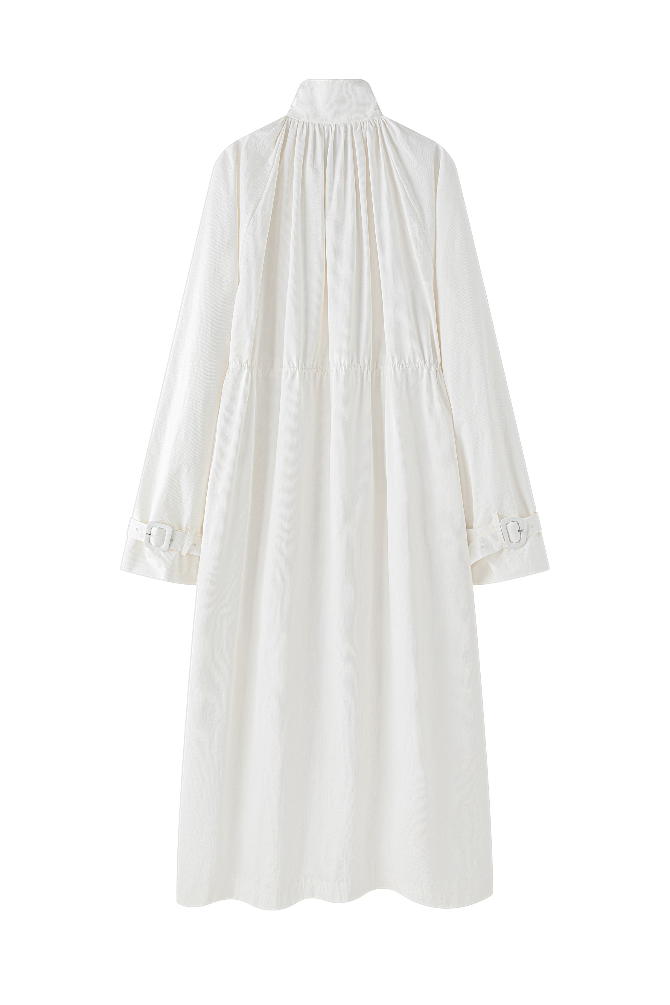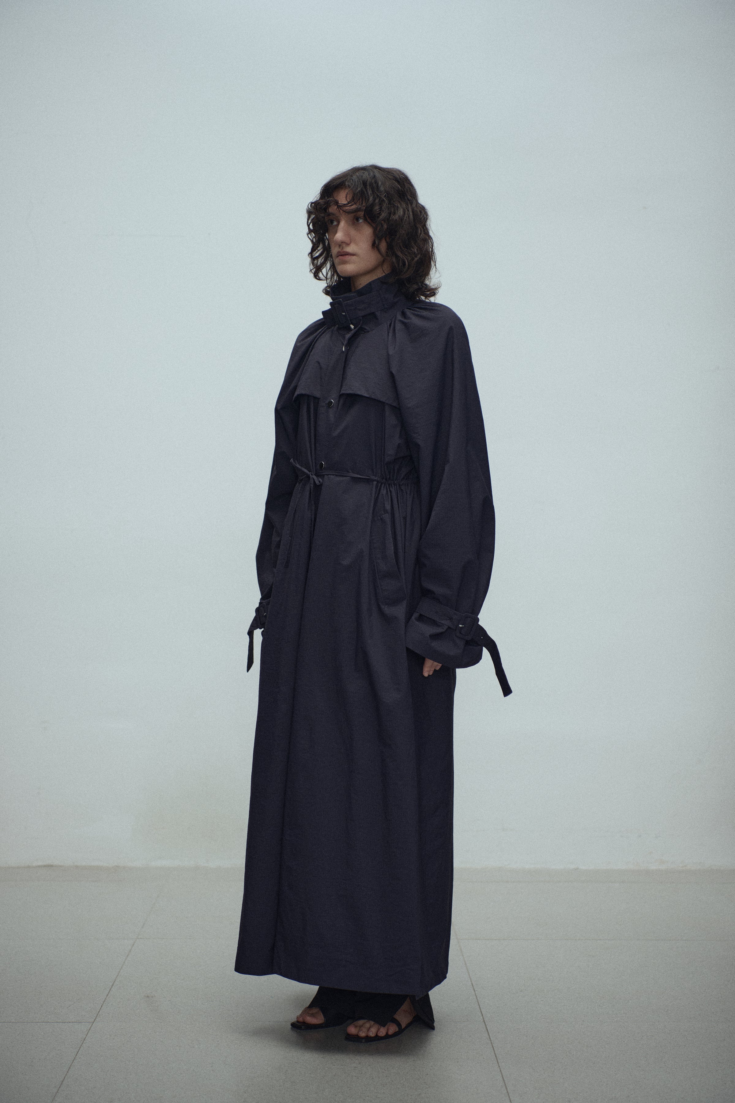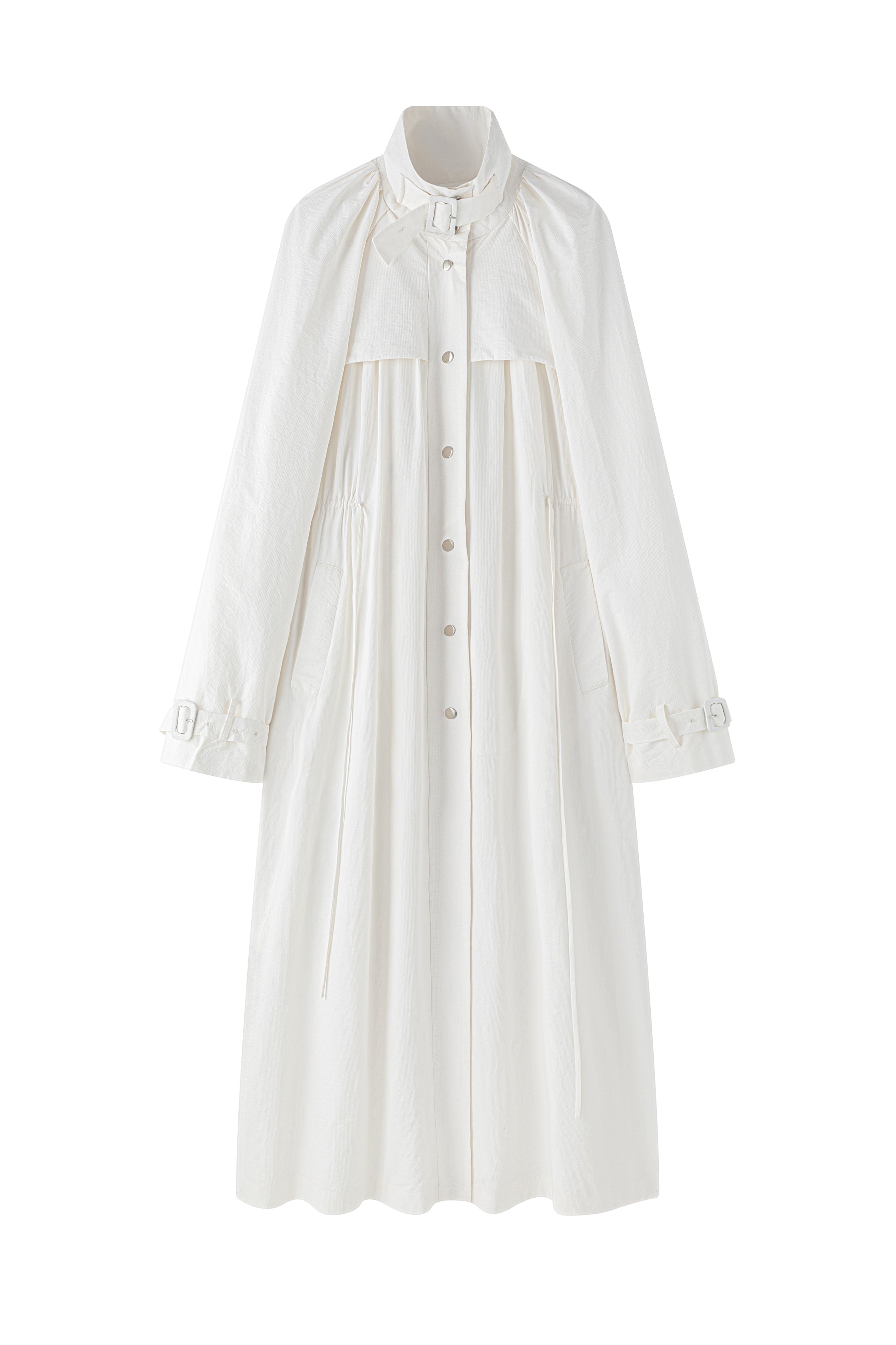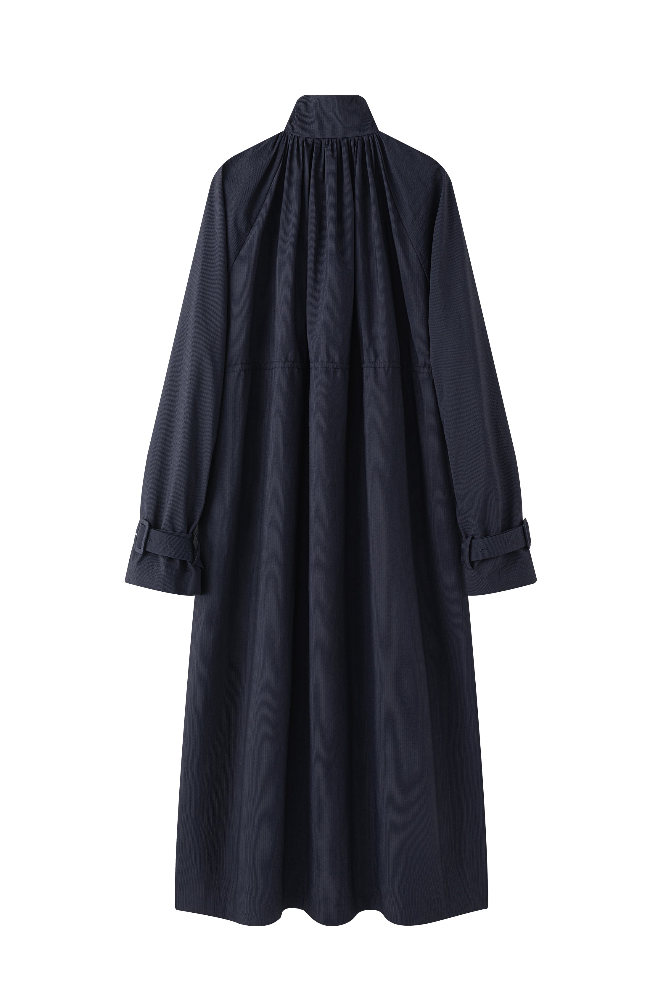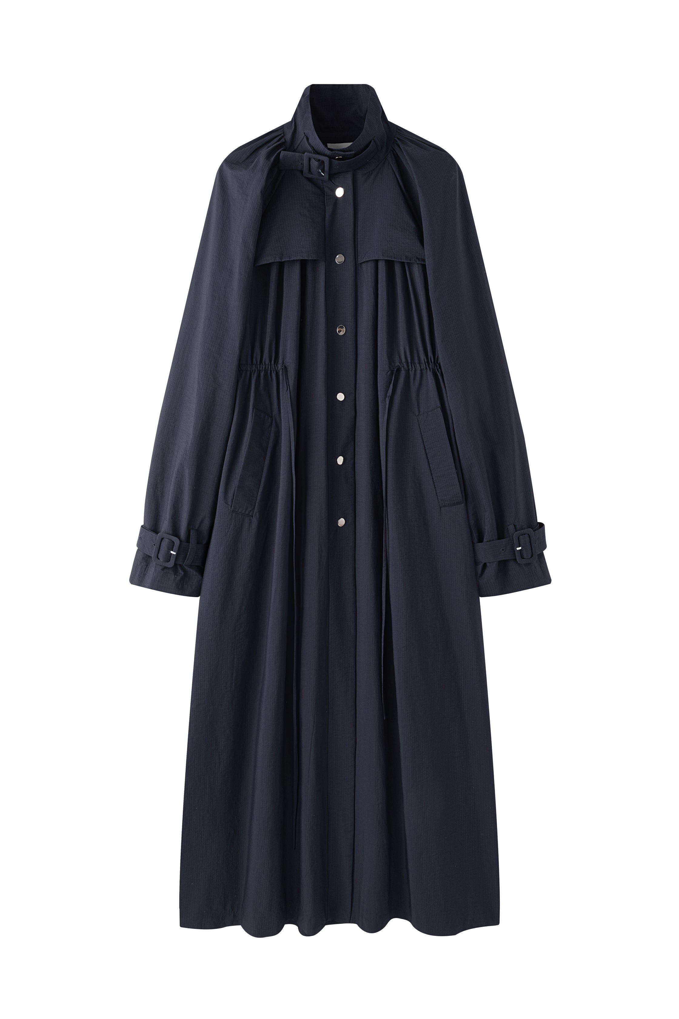 Gathered trench coat with a high neck and a neck buckle. Features sleeves buckles at the hems, open side slits and a drawstring at the waist for adjustable fit. Lightweight, textured mat...