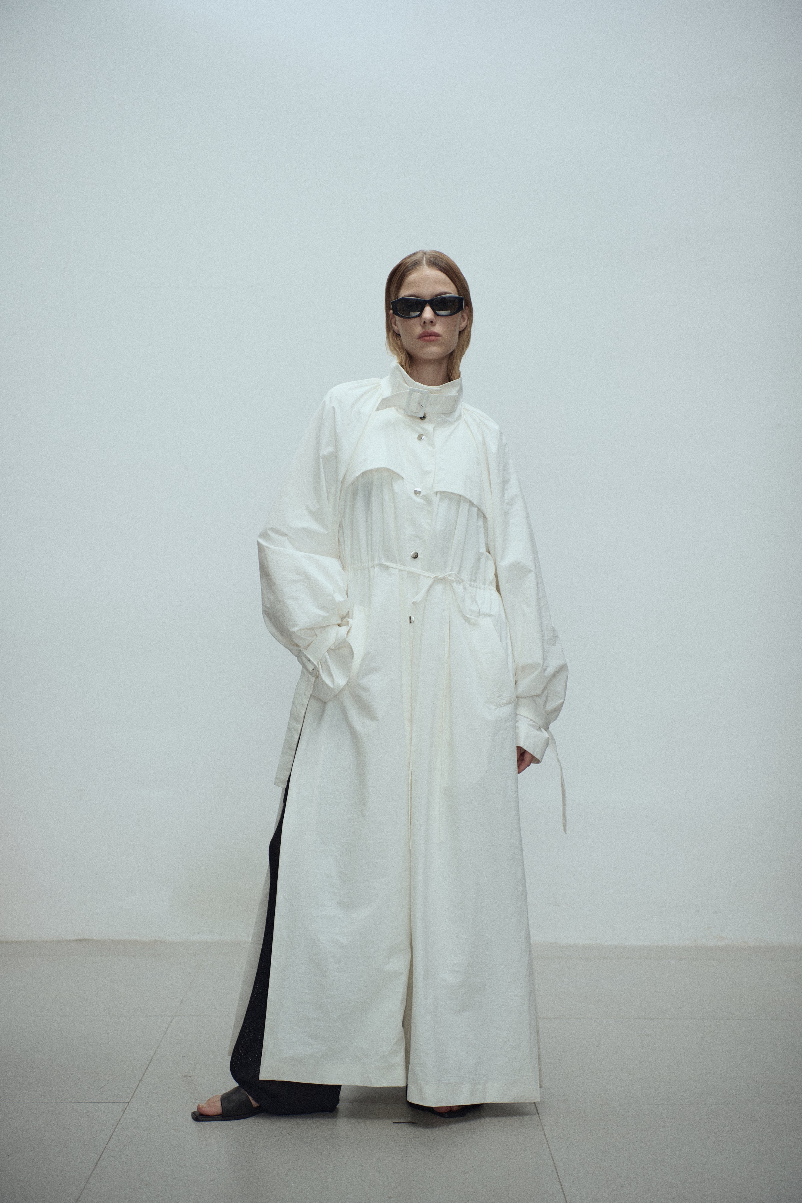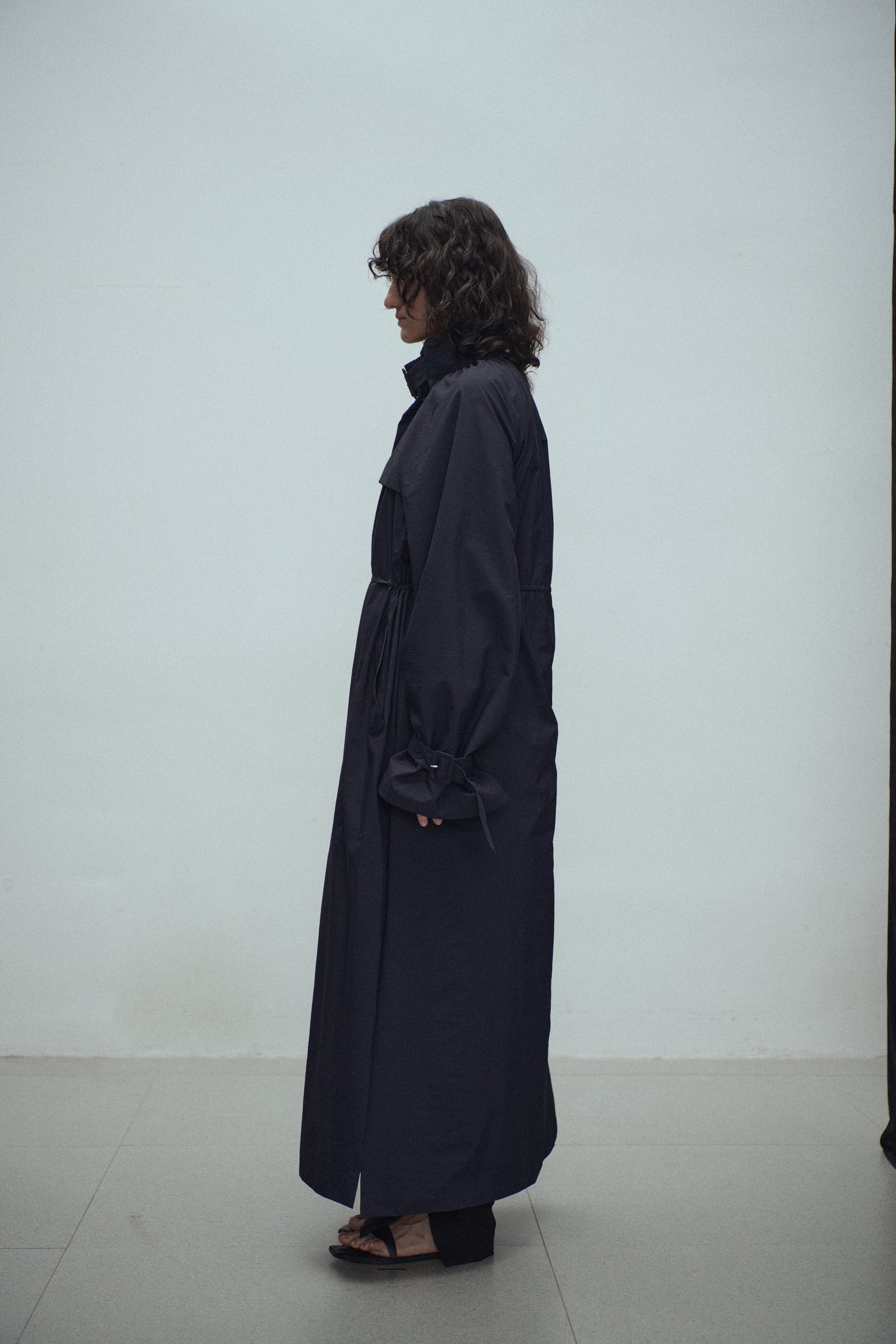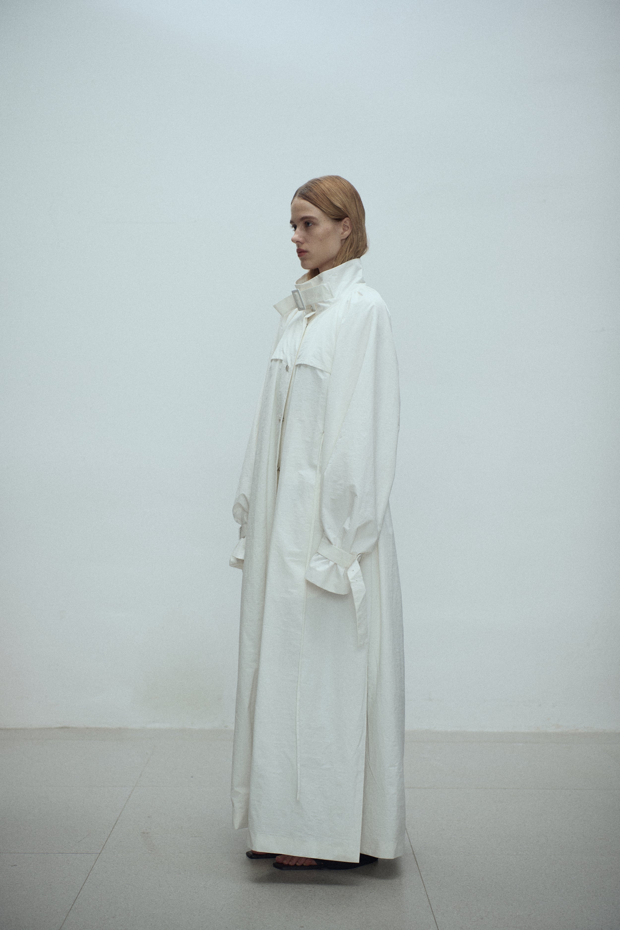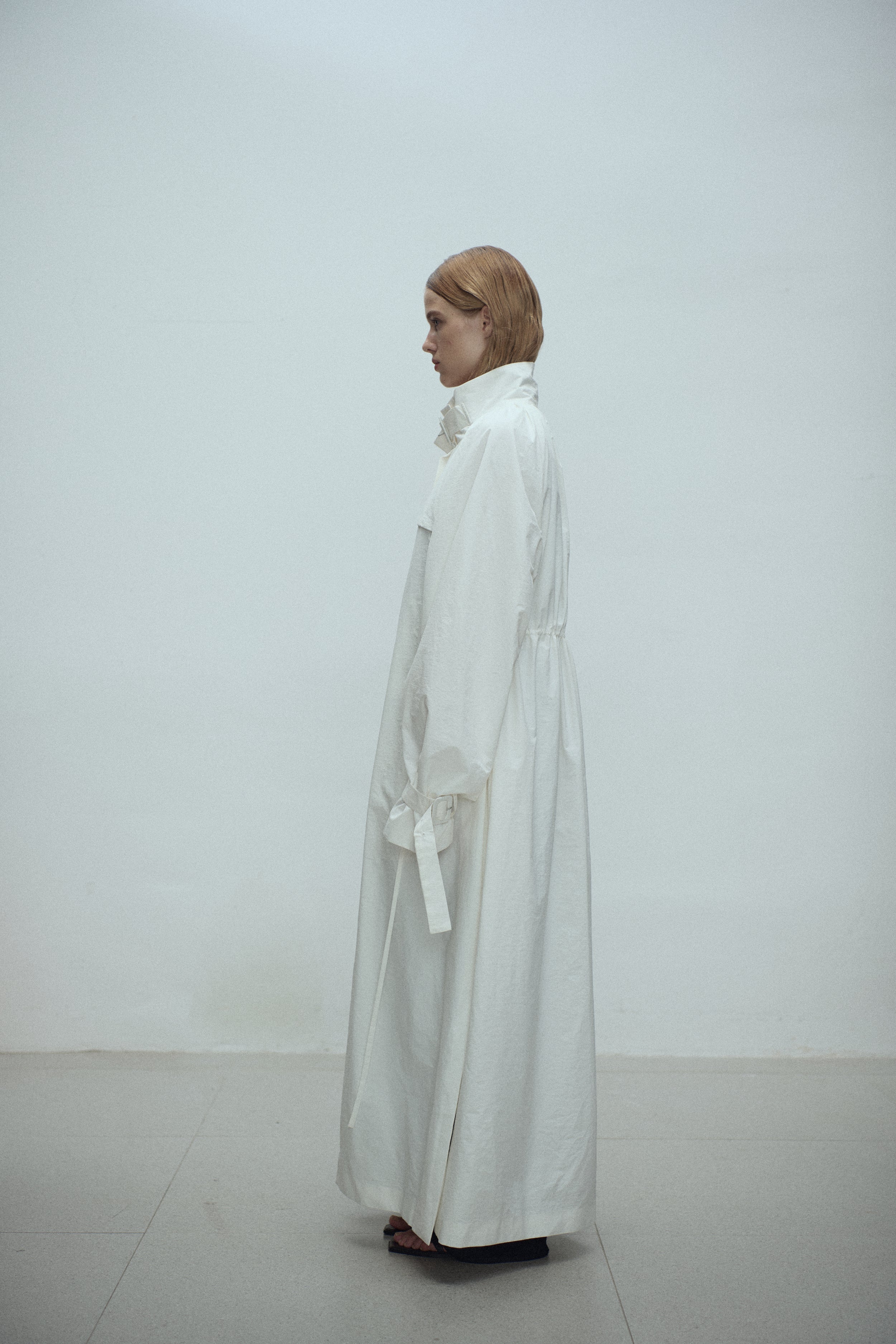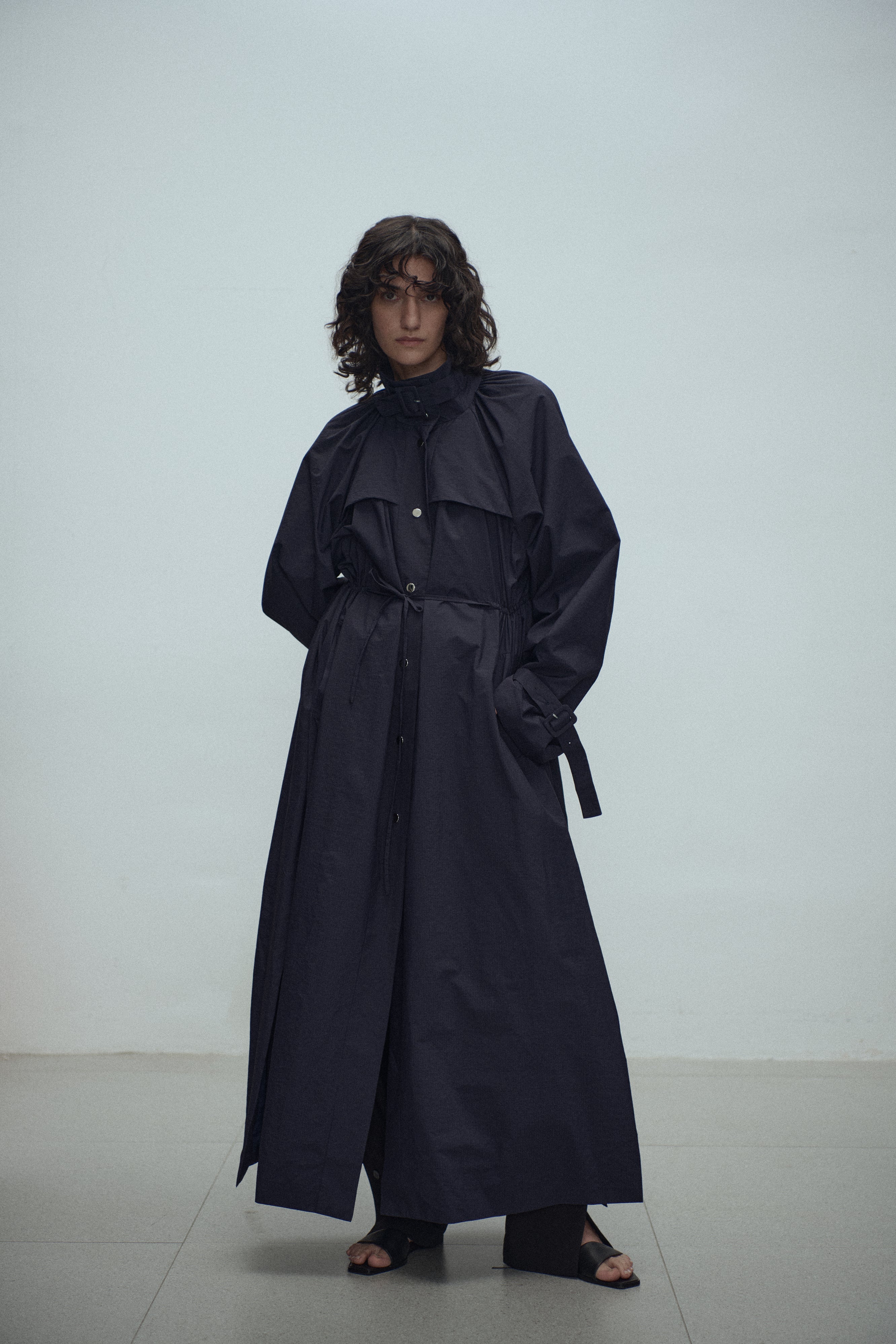 Gathered trench coat with a high neck and a neck buckle. Features sleeves buckles at the hems, open side slits and a drawstring at the waist for adjustable fit. Lightweight, textured mat...