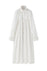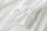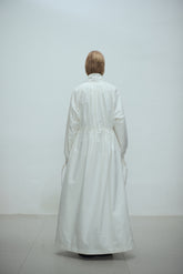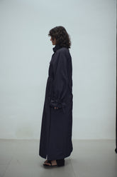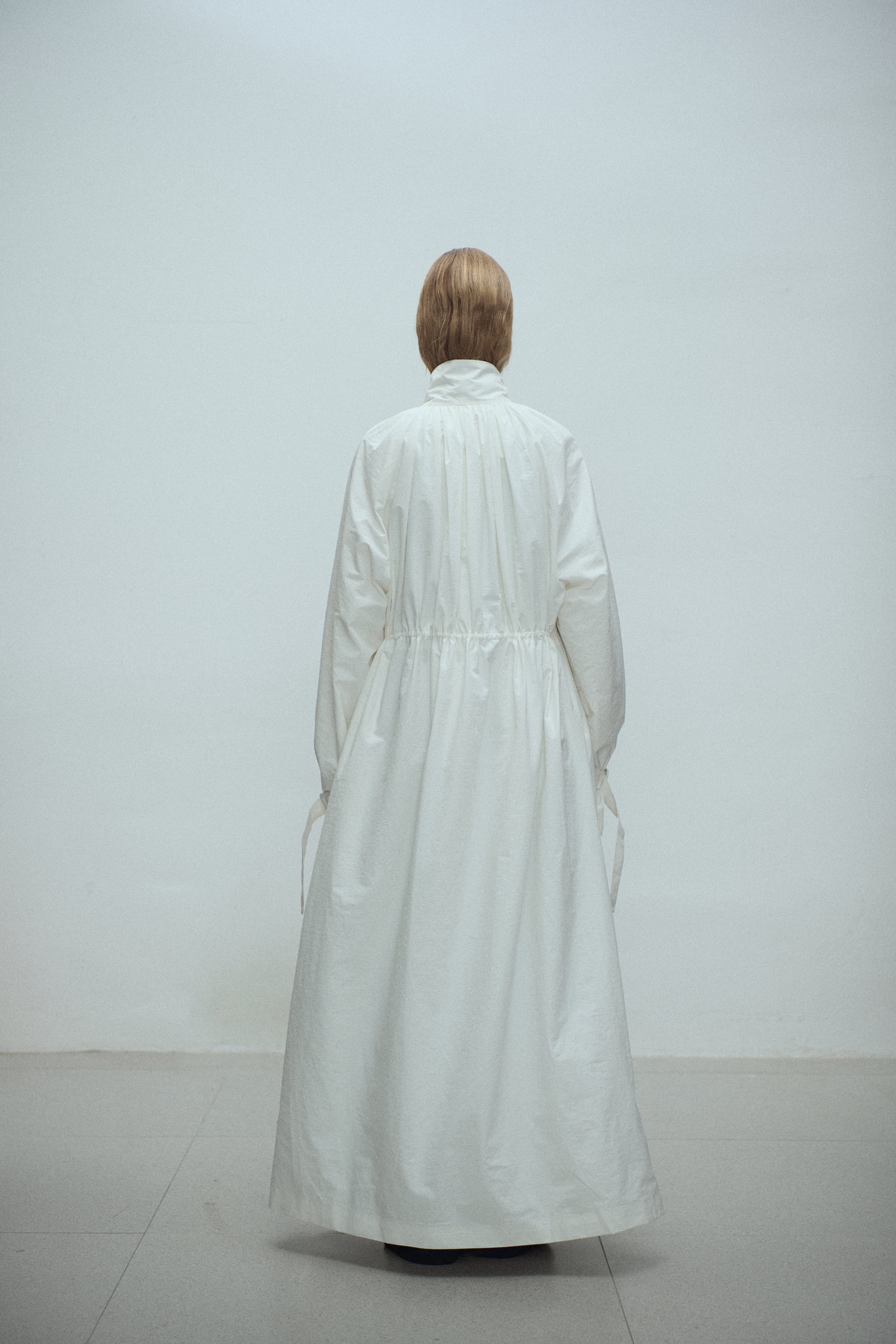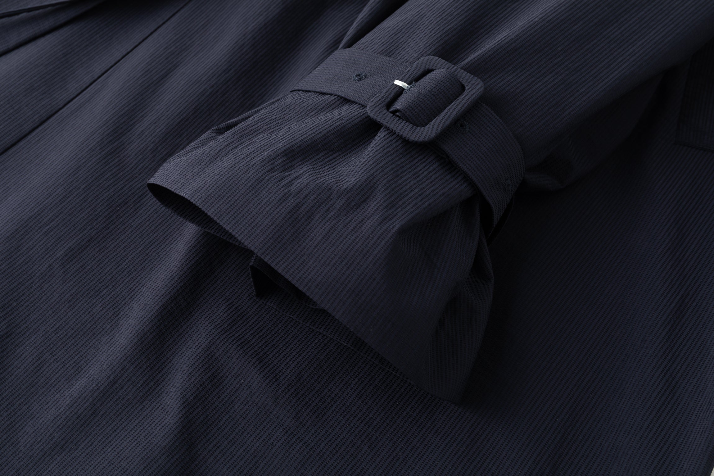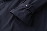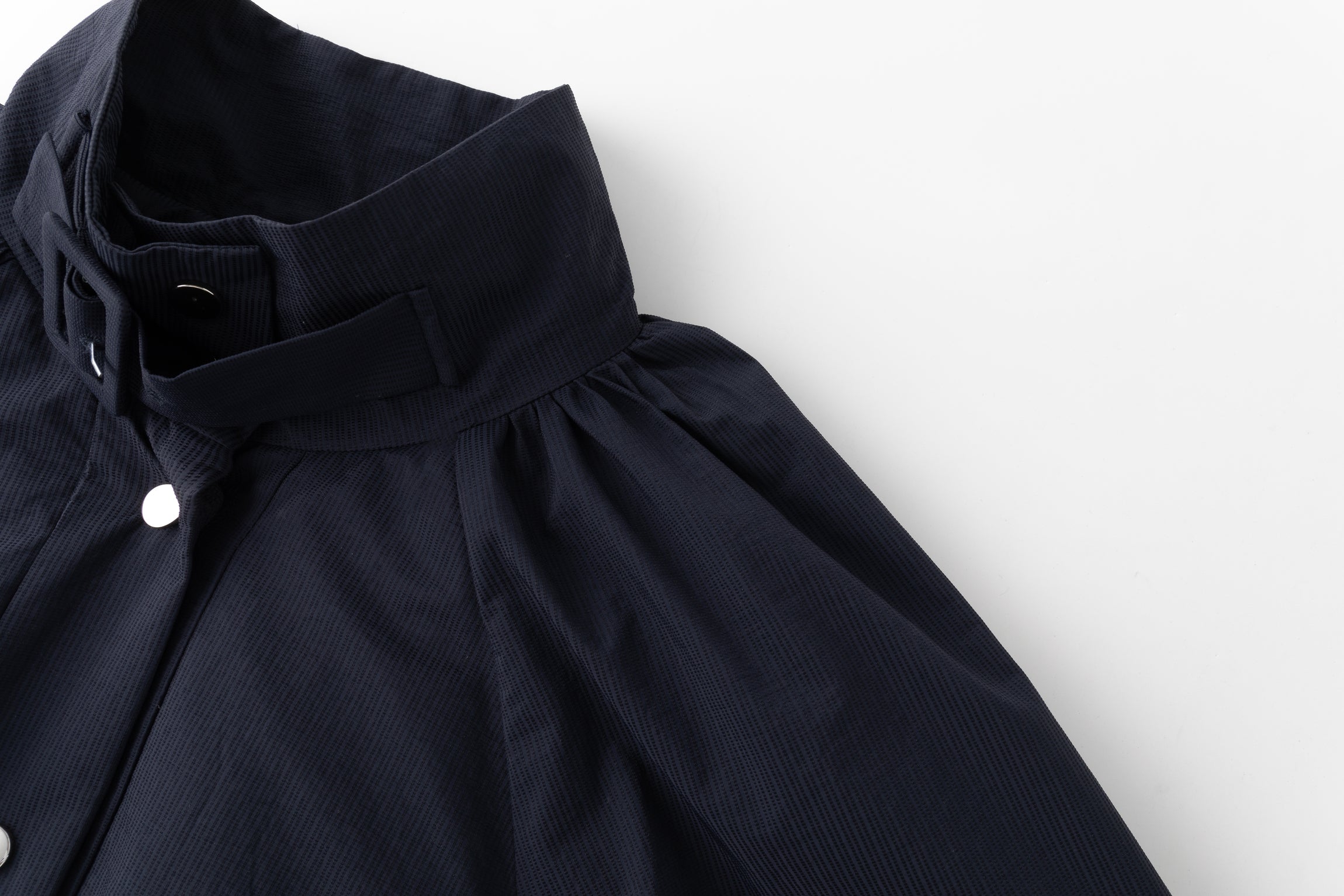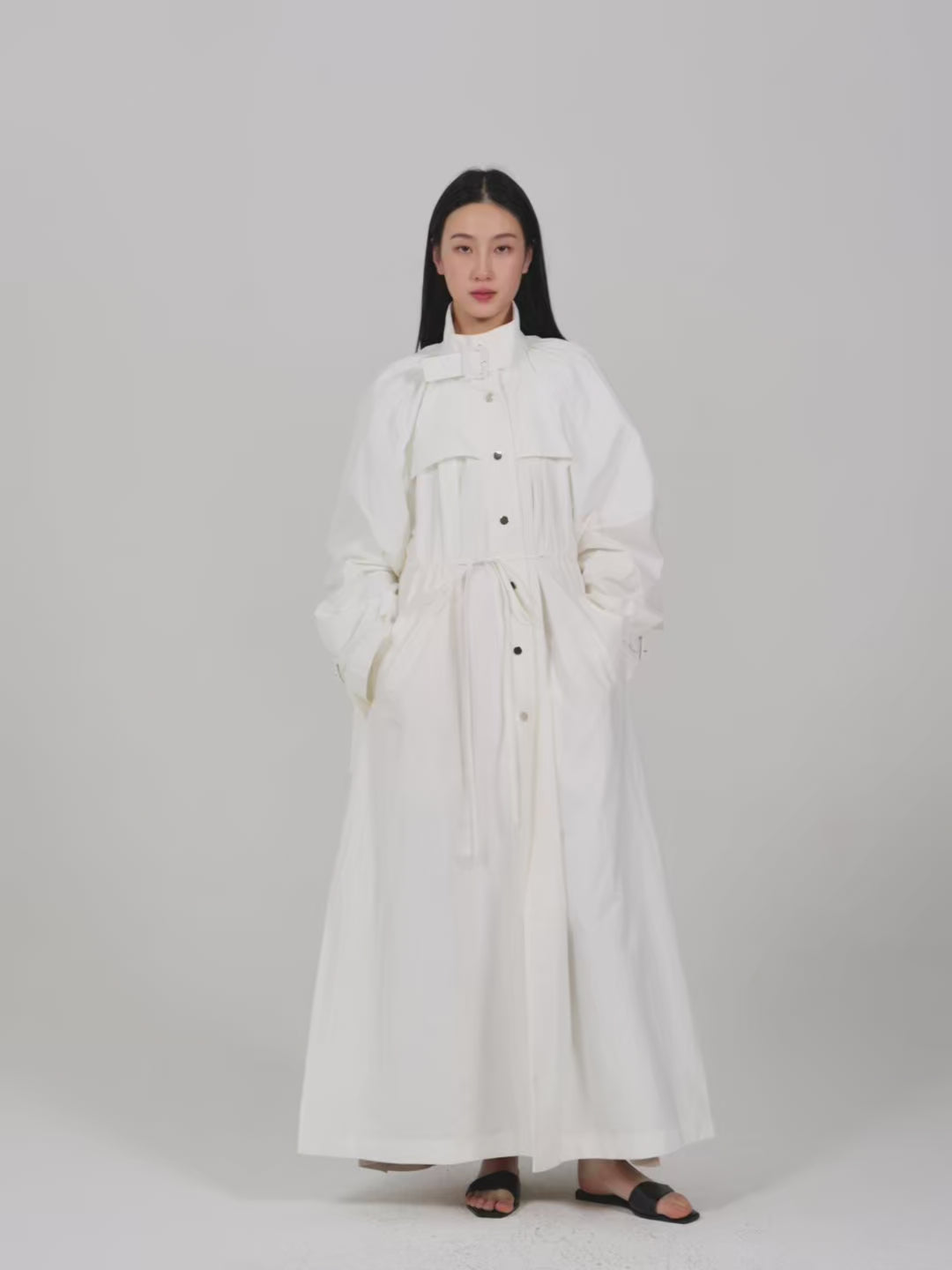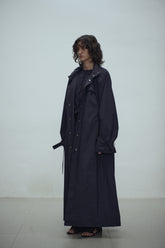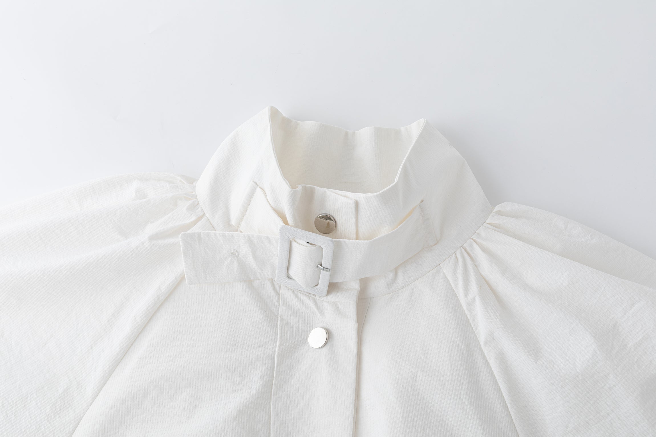 Gathered trench coat with a high neck and a neck buckle. Features sleeves buckles at the hems, open side slits and a drawstring at the waist for adjustable fit. Lightweight, textured mat...