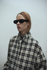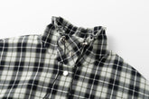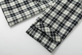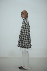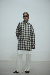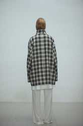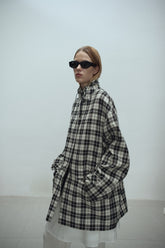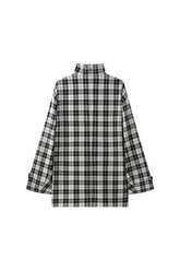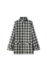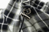 Checked 100% cotton jacket featuring a high collar and a silver button-up closure. It includes a drawstring at the neck for adjustable fit and has side welt pockets. The pattern is a cla...