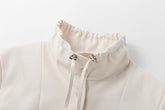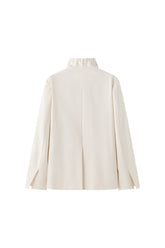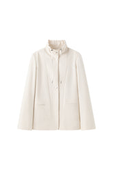 This cotton blazer features a silver buttoned front for a polished appearance and a high collar with a drawstring, reminiscent of a rain jacket. Side modern slit pockets.