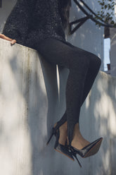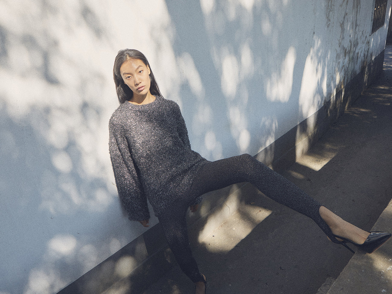 Leggings in knitted shimmery fabric. Wear with a an oversized shirt, knit or blazer for a cool festive look. Model is 174cm tall and wears size S. Take a bigger size if you are tall.