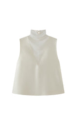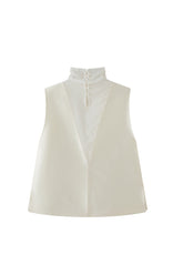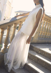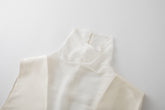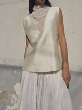 Fine wool and silk blend wide shoulder top with cut out deep V neck in sheer silk in the front and back. The mix of the stiff wool and silk blend fabric makes a beautiful contrast to the...