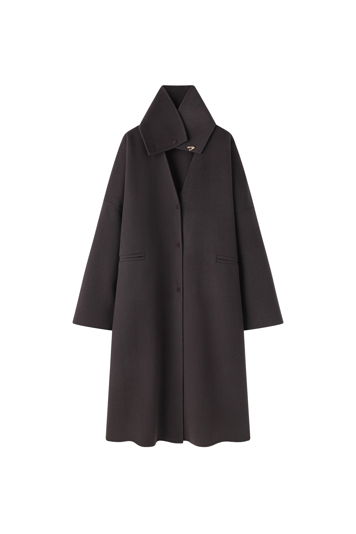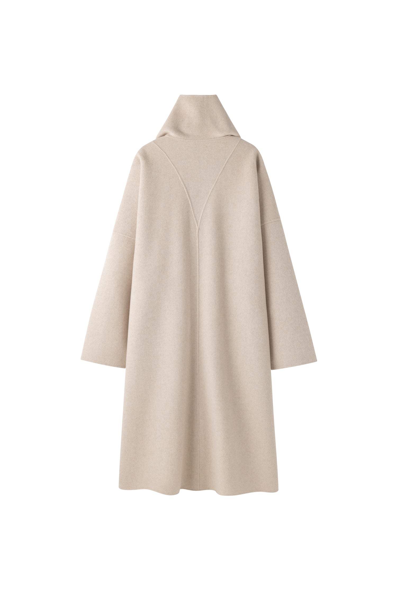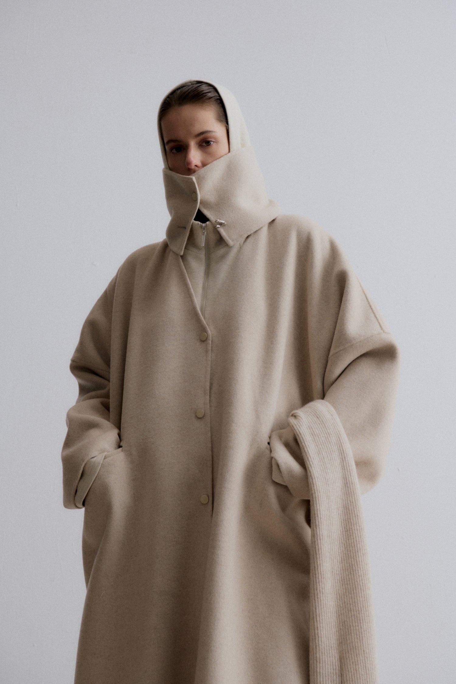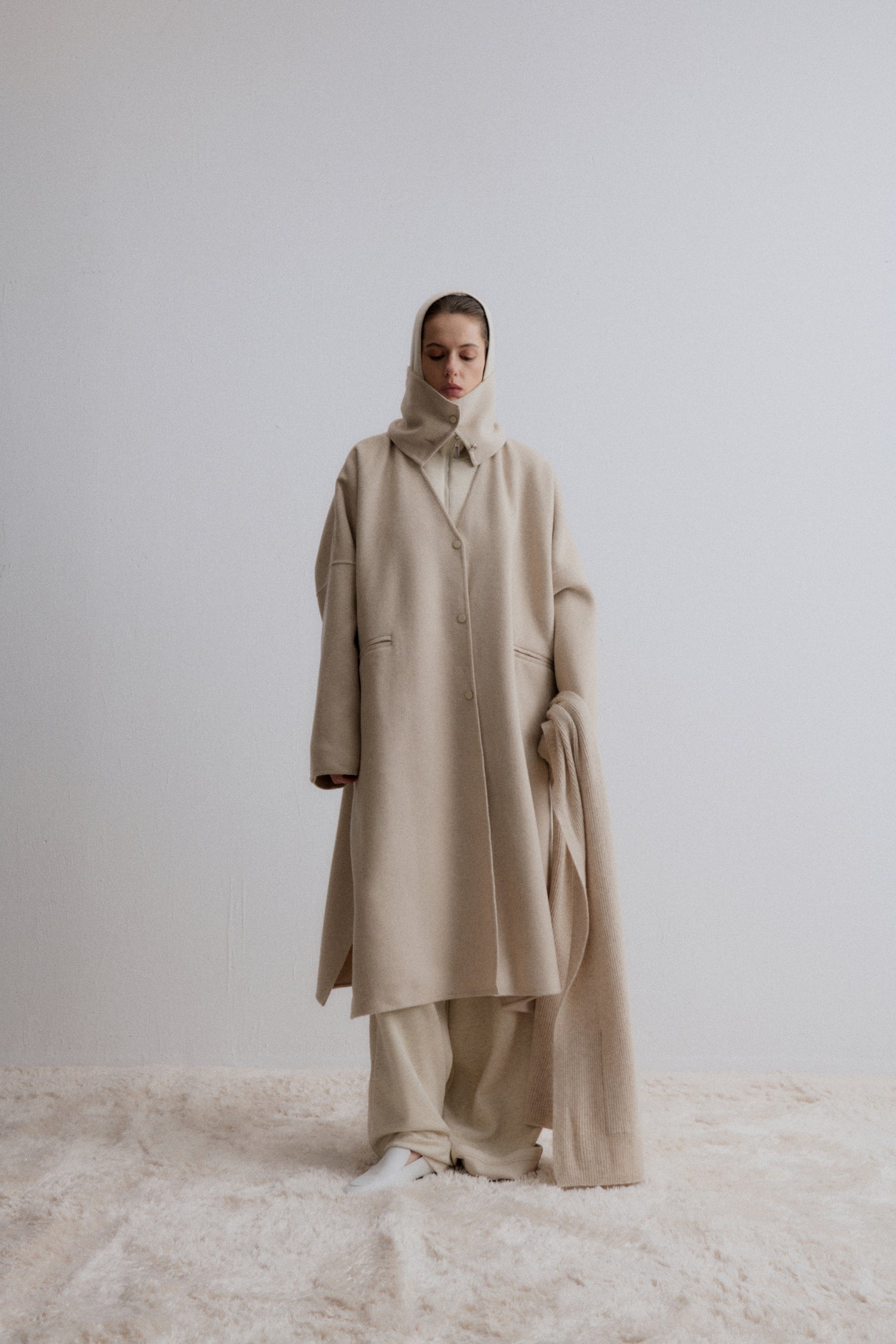 This oversized cashmere and wool blend coat in a soft beige hue features a minimalist design with a wide high collar that can be worn folded or buttoned for extra warmth. The relaxed fit...