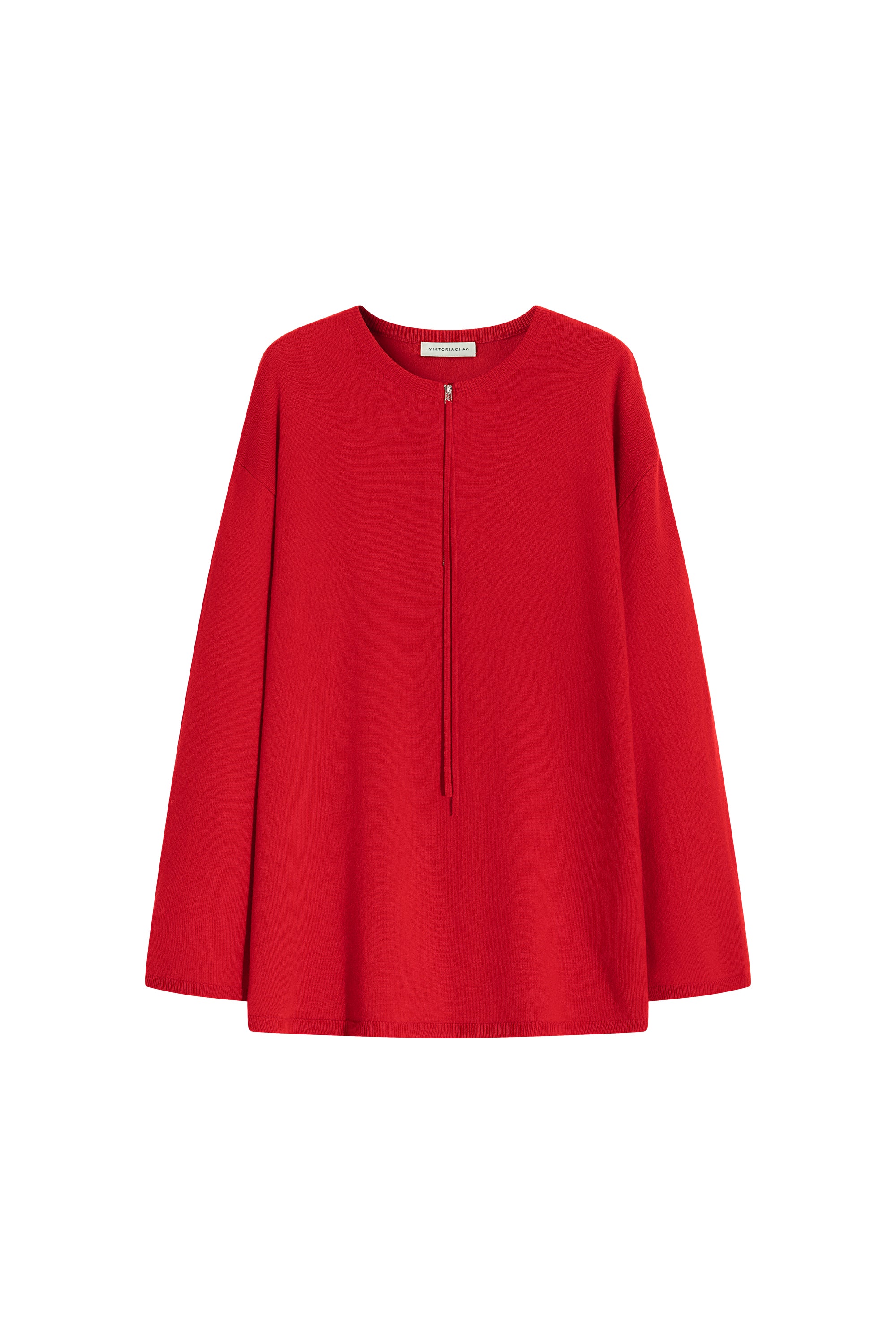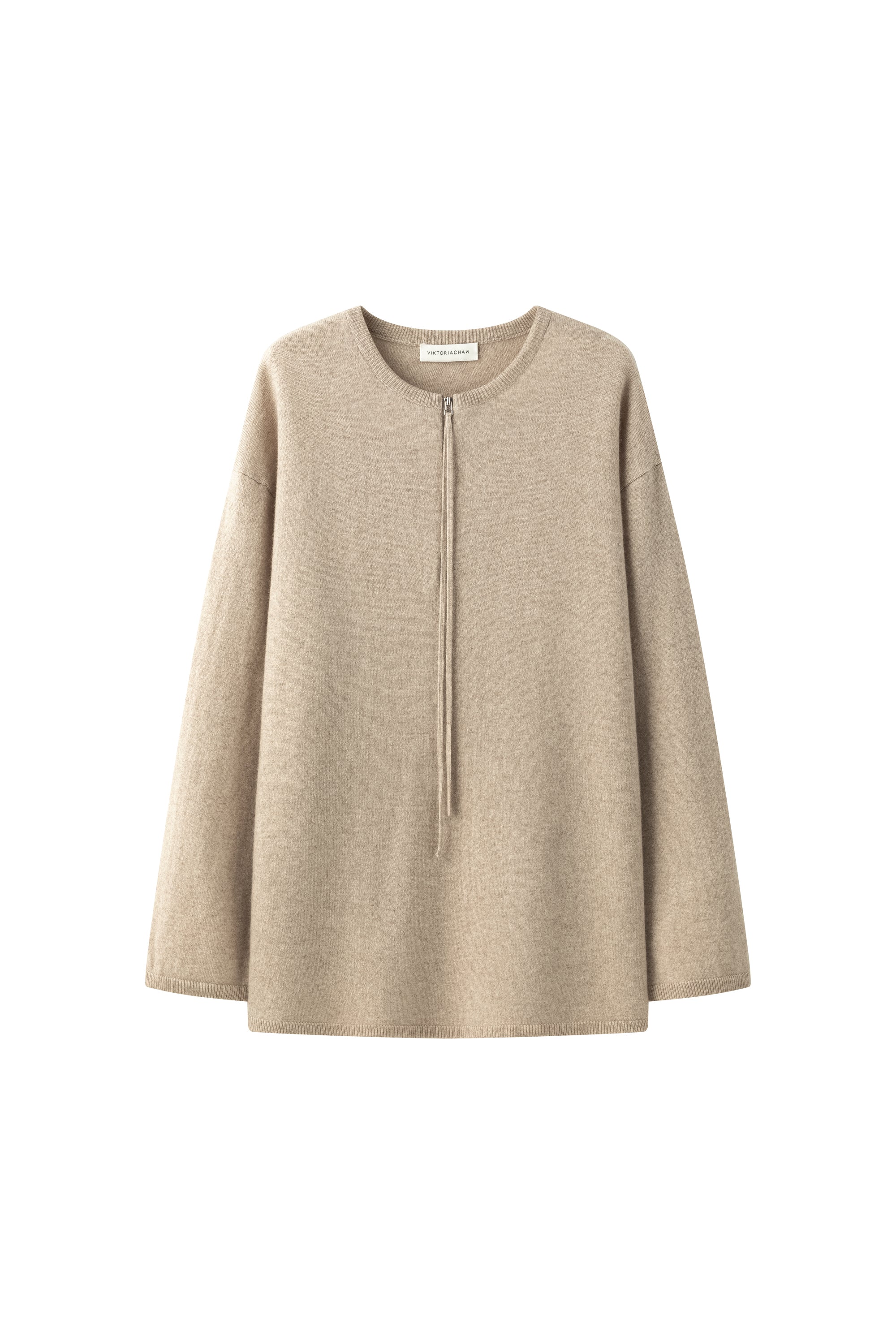 Oversized knit pullover with zipper detailed neckline. Ribbed details on neckline and hems.
