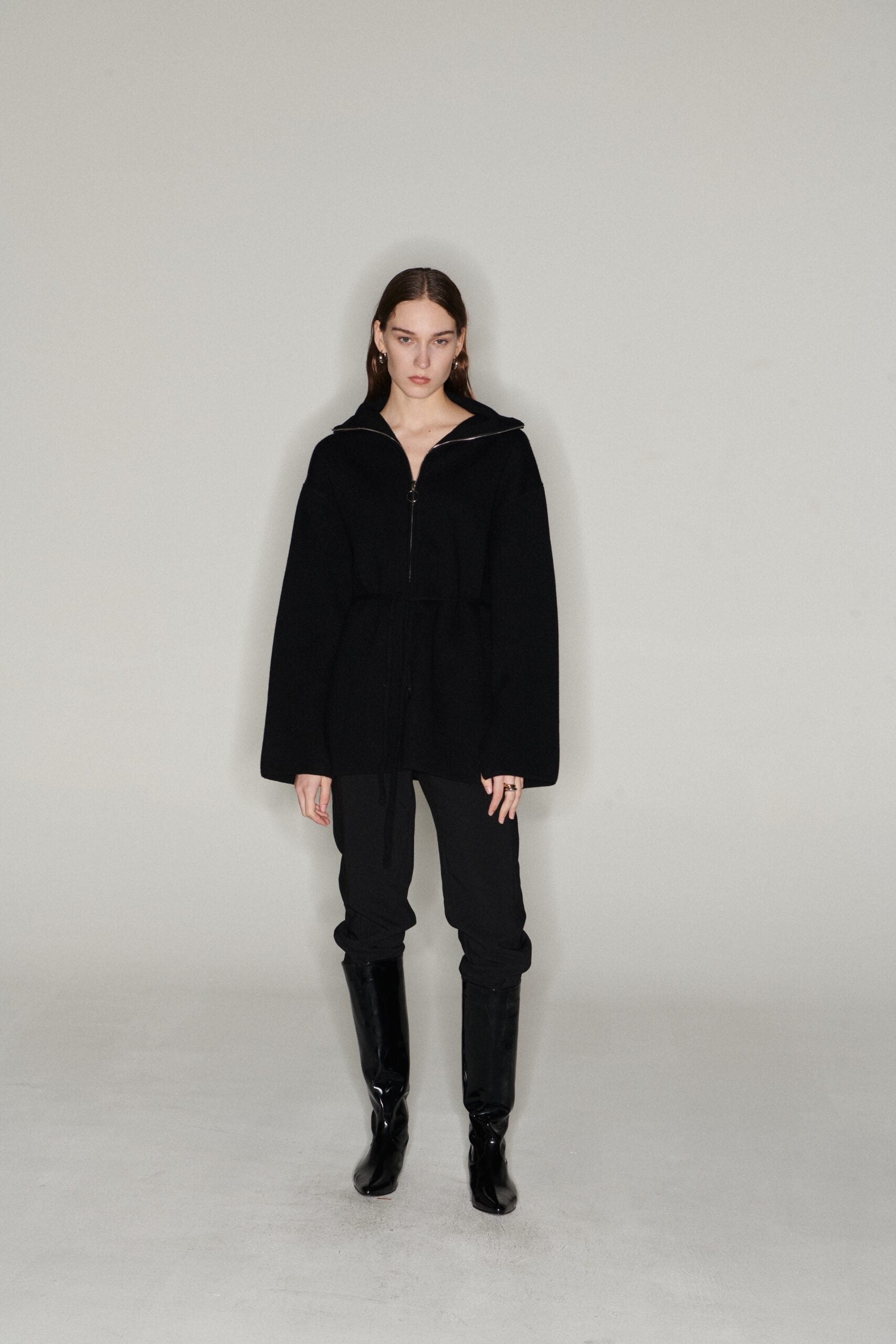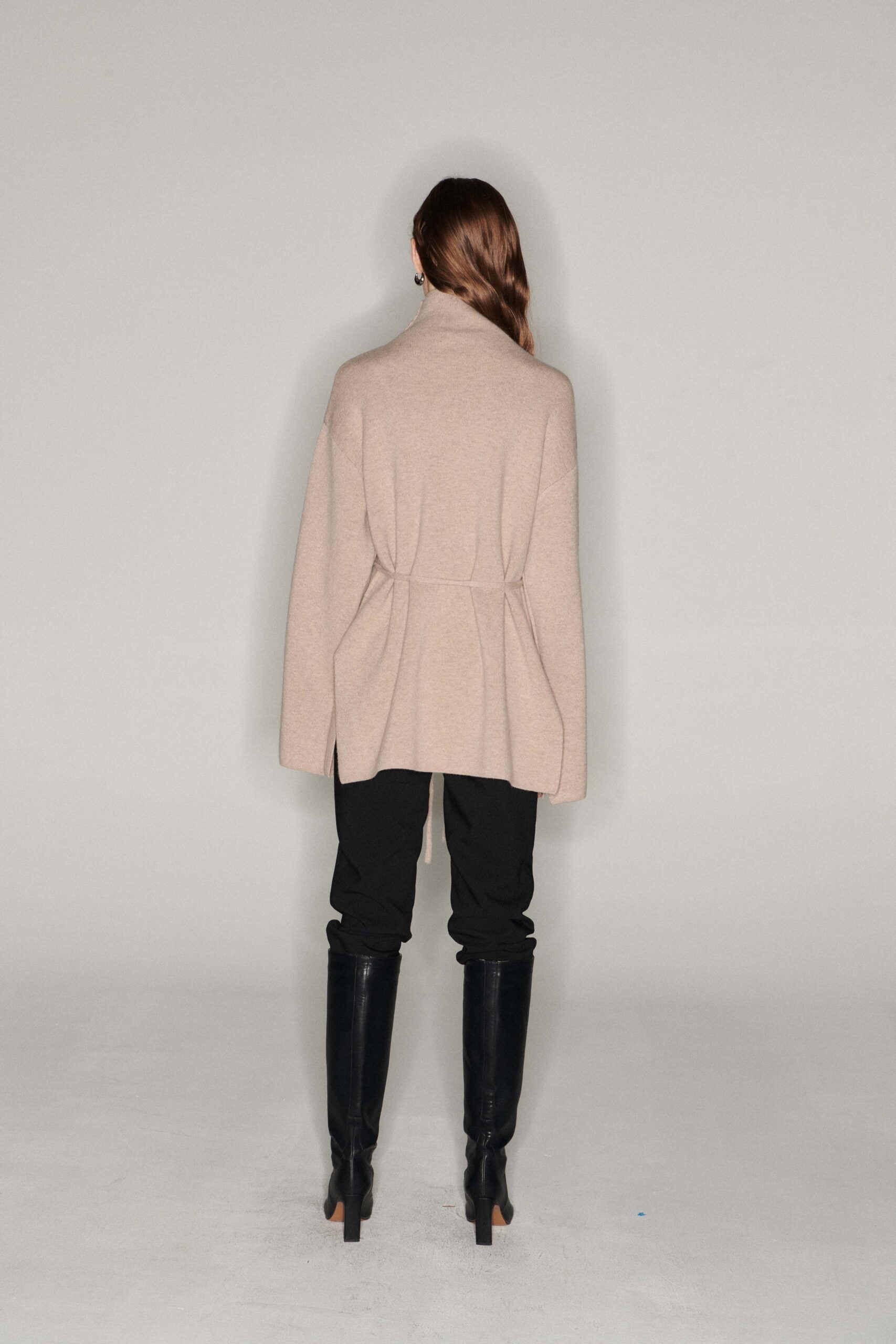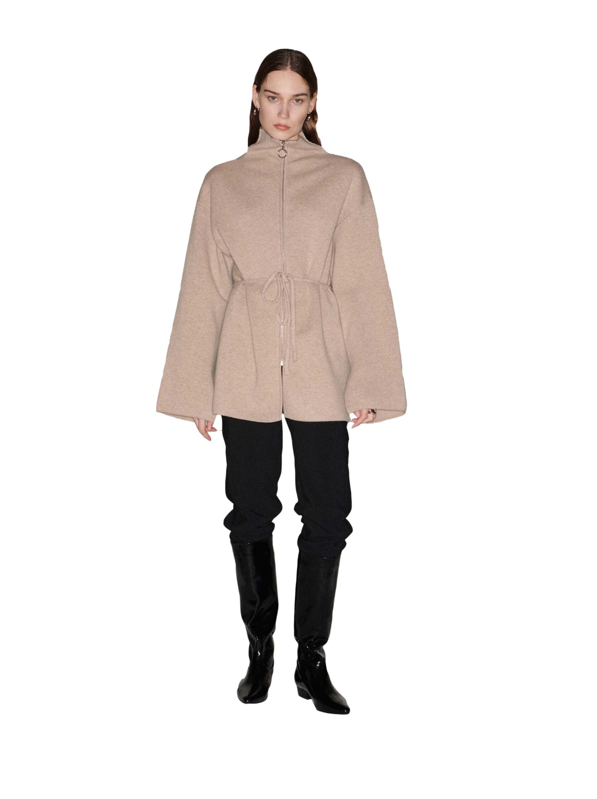 Wool and cashmere cardigan with zipper. Comes with waist strap. Slit on both sides and under the sleeves. Wear as a jacket or just a cardigan. Model is 177cm tall and wears size S.