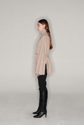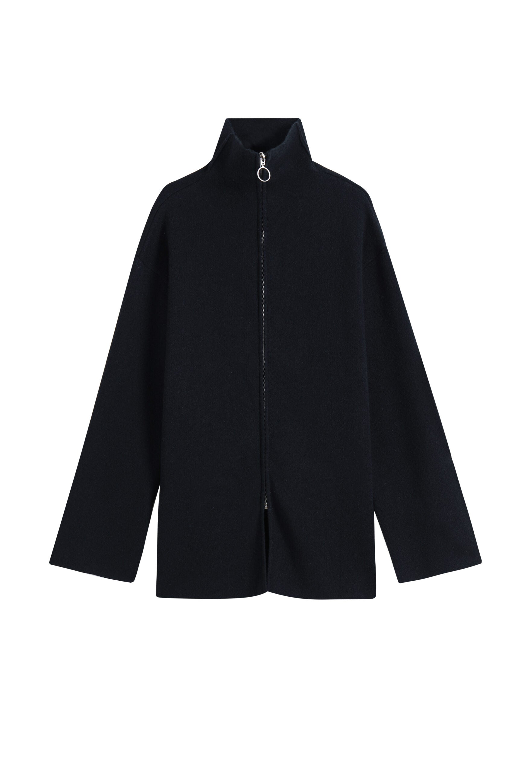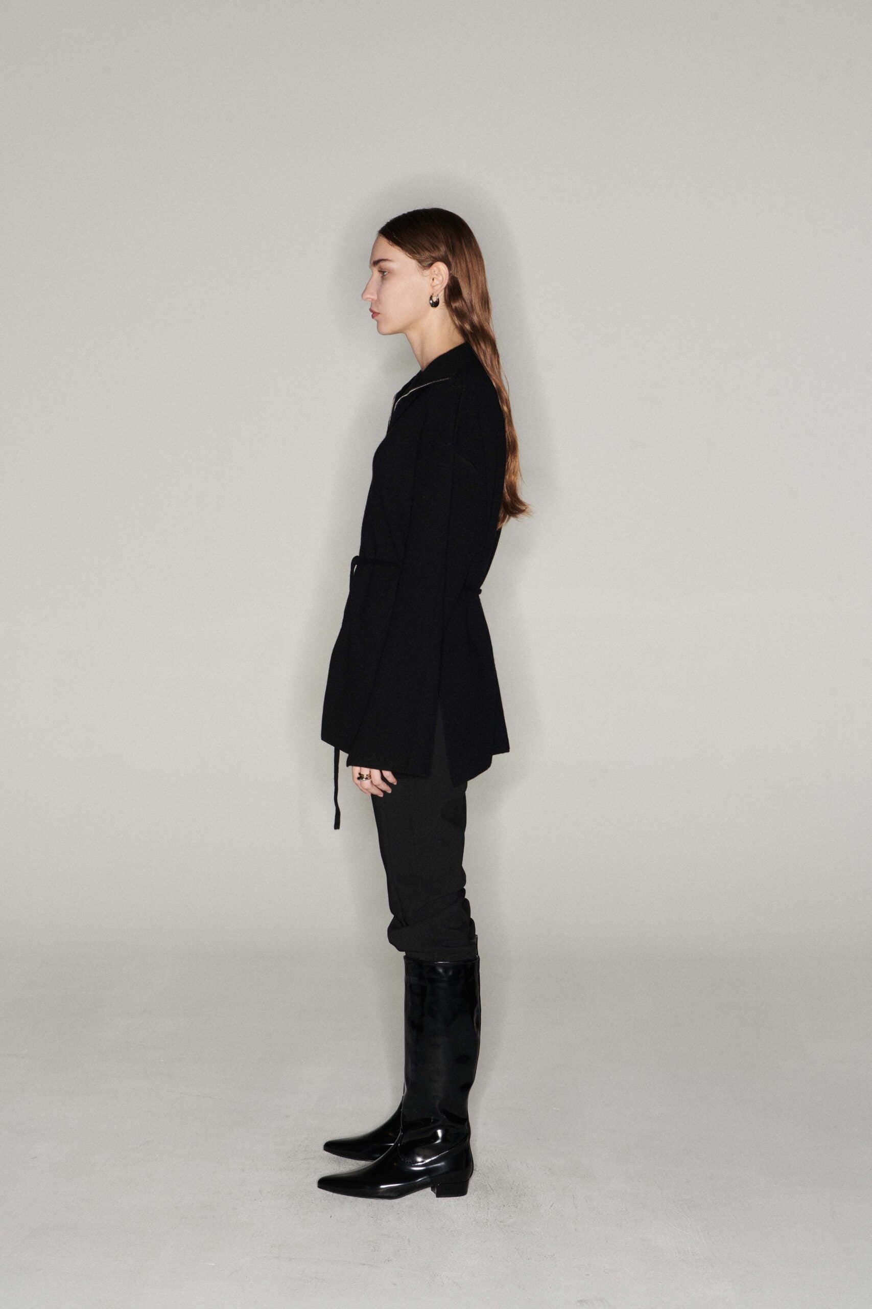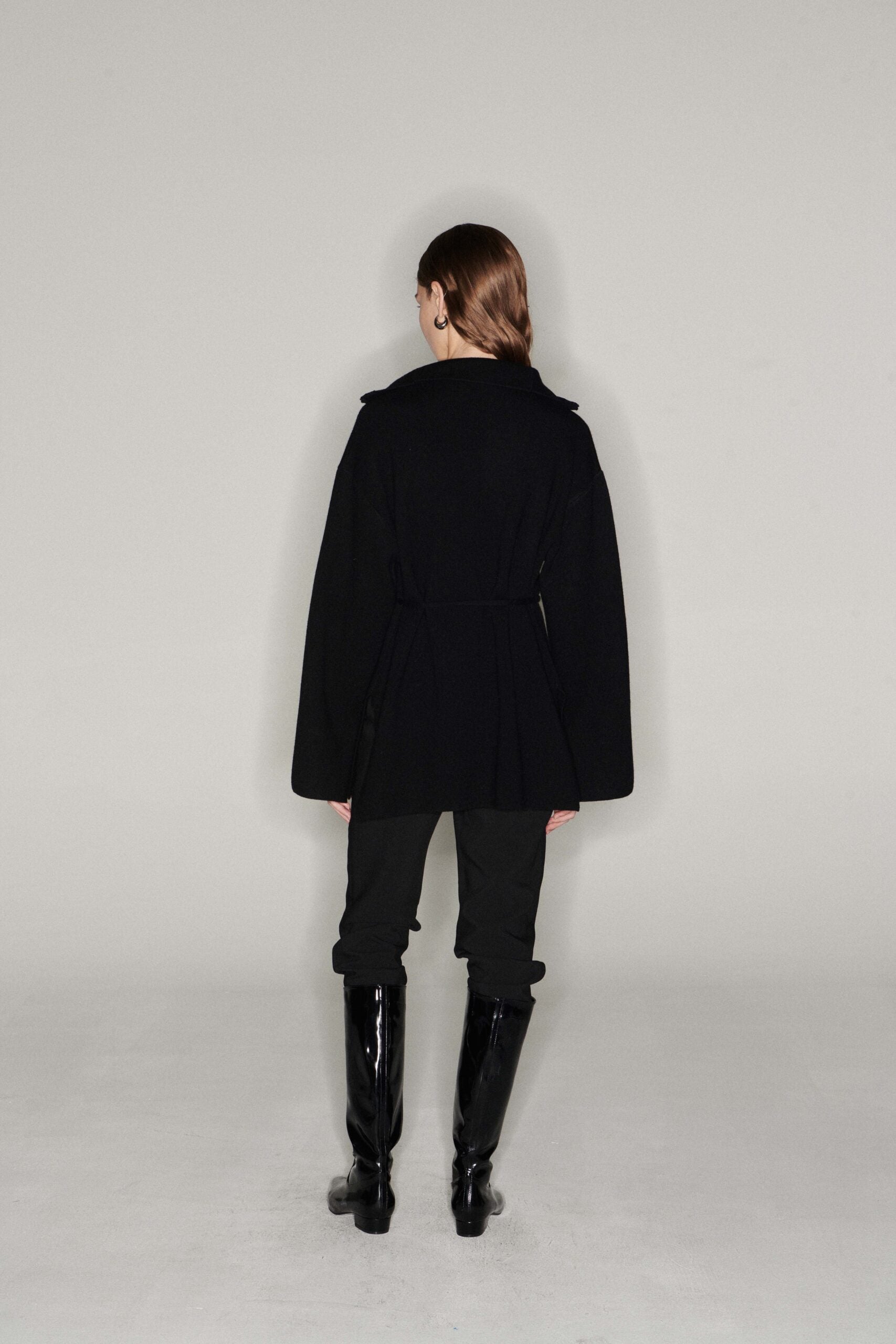 Wool and cashmere cardigan with zipper. Comes with waist strap. Slit on both sides and under the sleeves. Wear as a jacket or just a cardigan. Model is 177cm tall and wears size S.