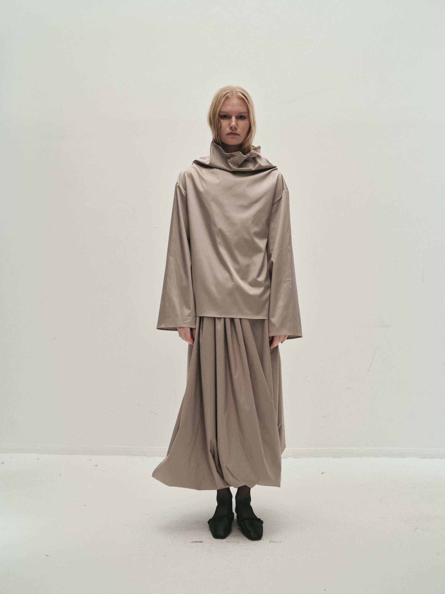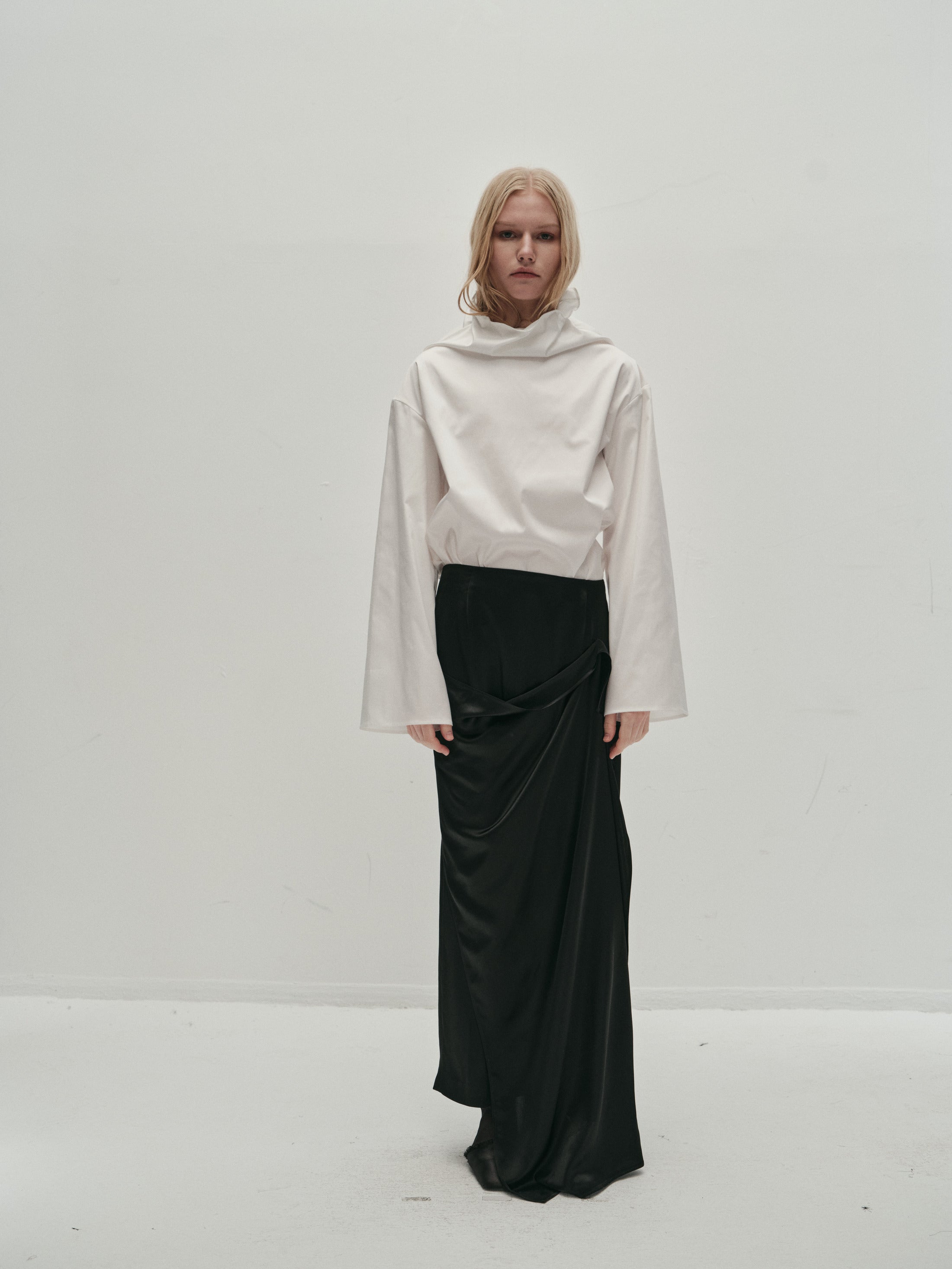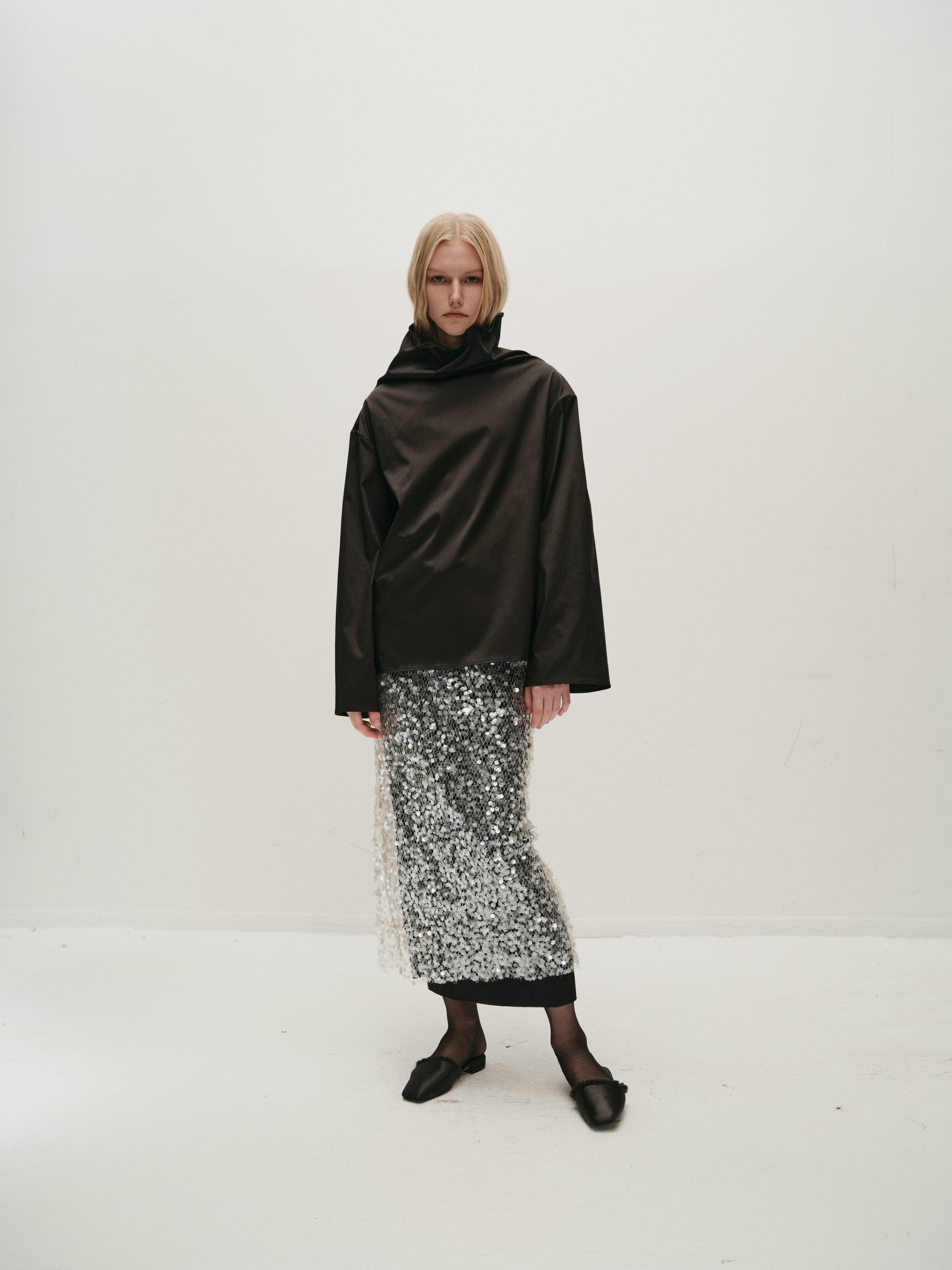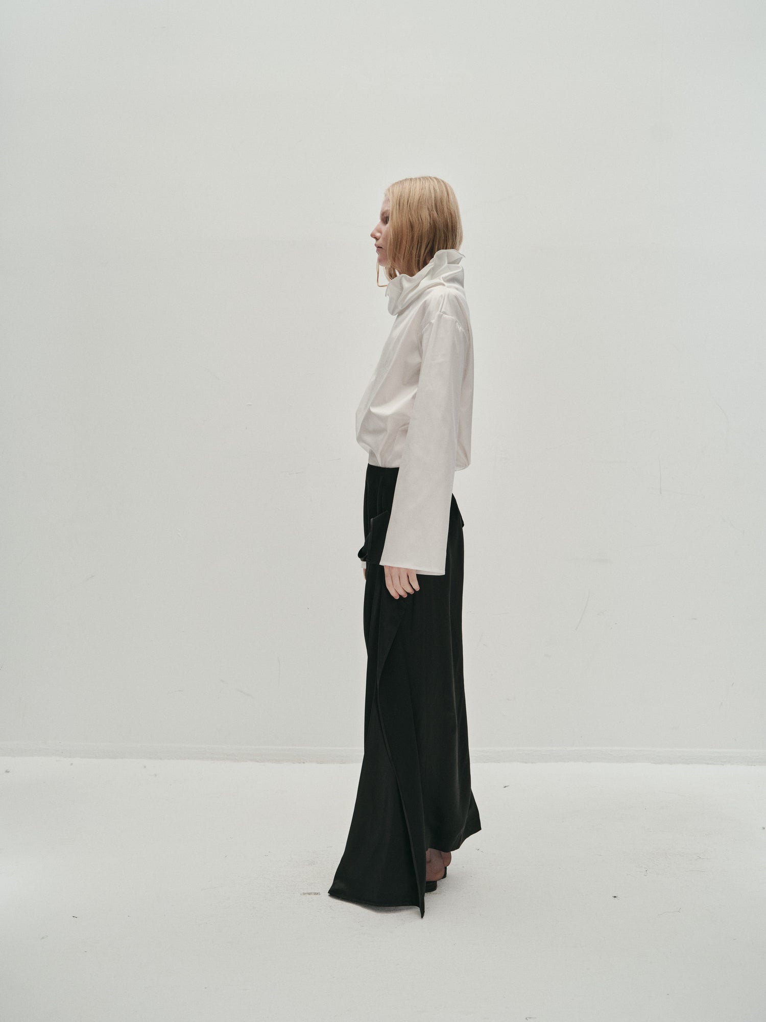 Satin-like texture with a glossy finish. High collar with a wavy trim. Flared long-sleeves