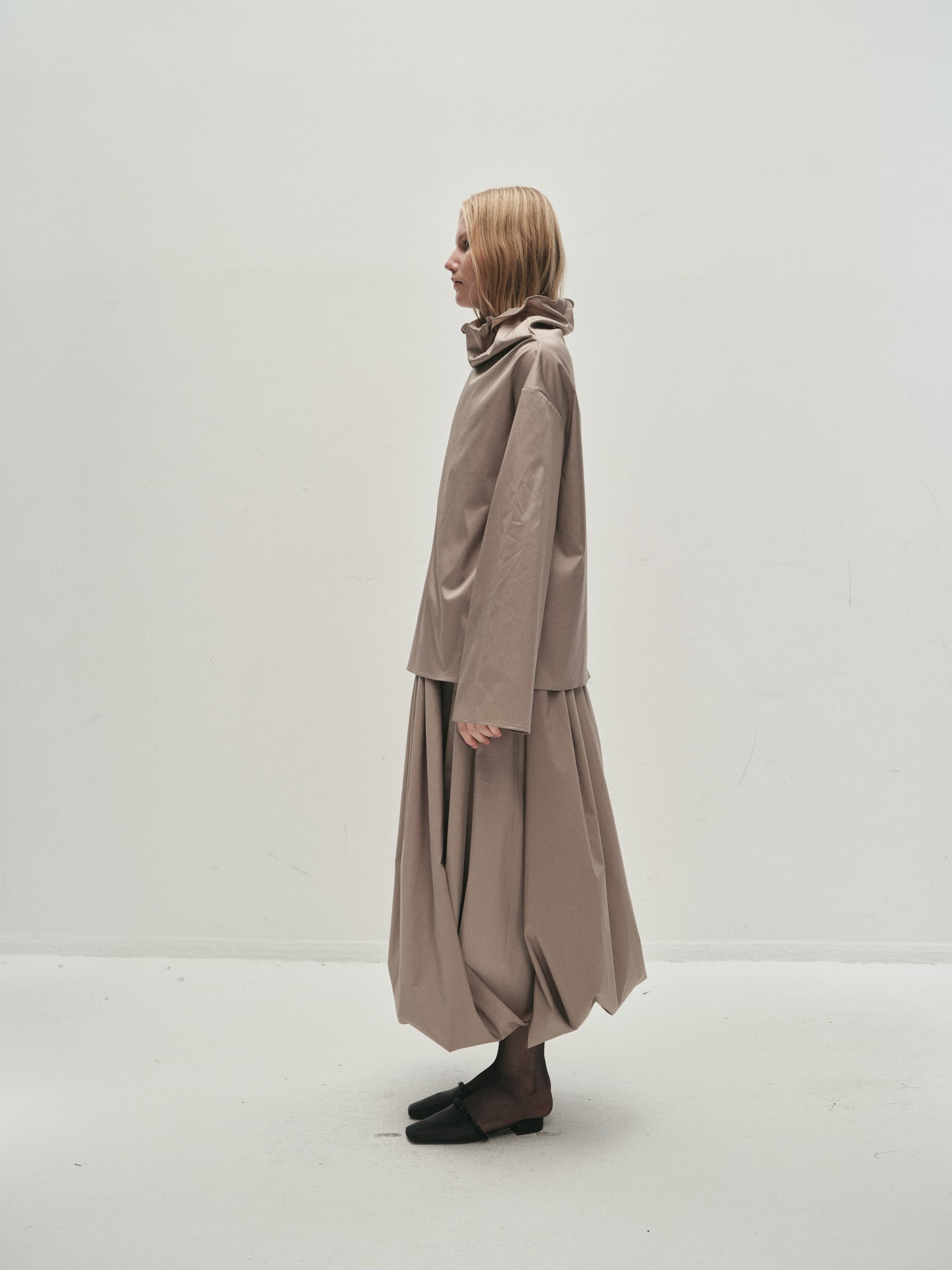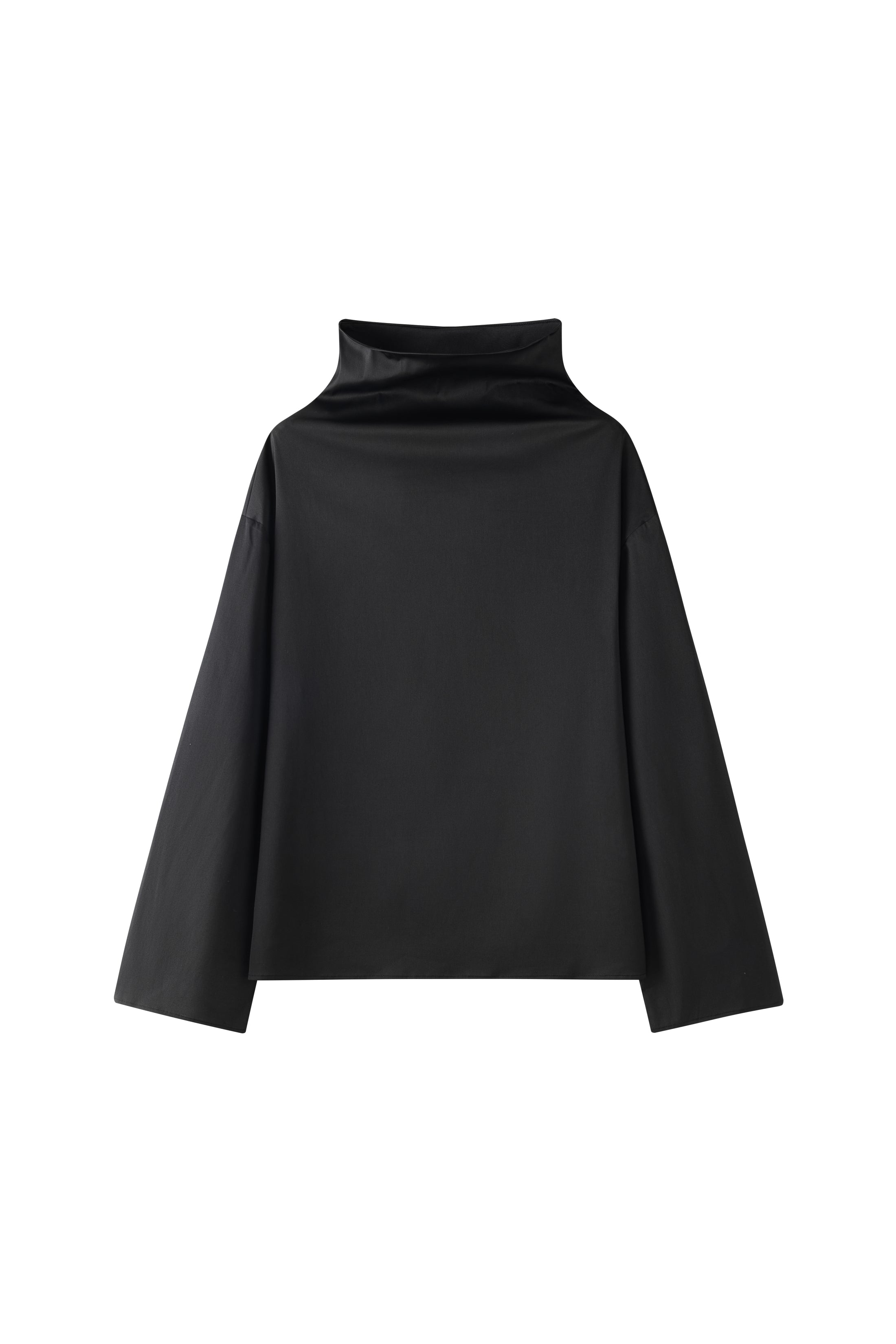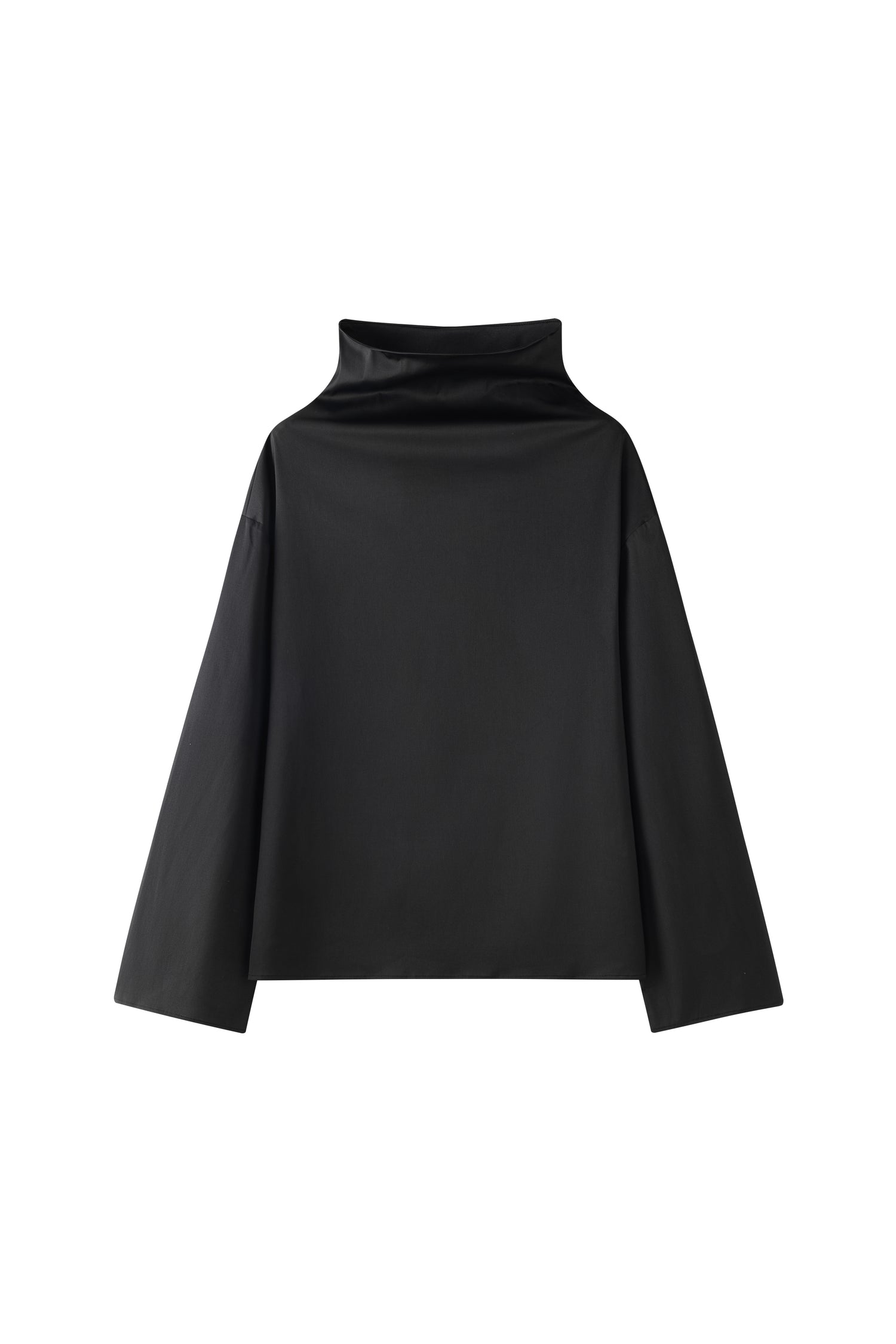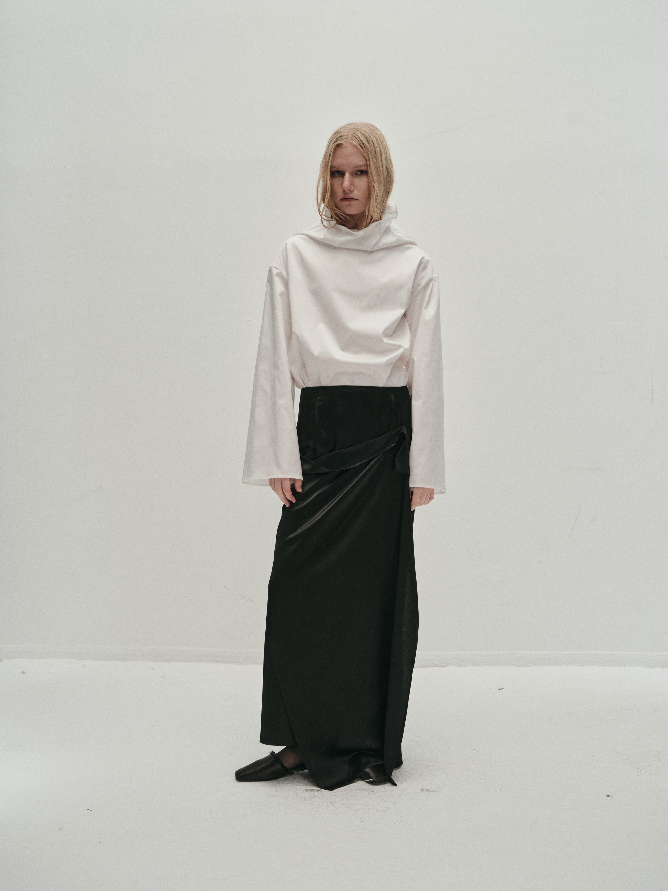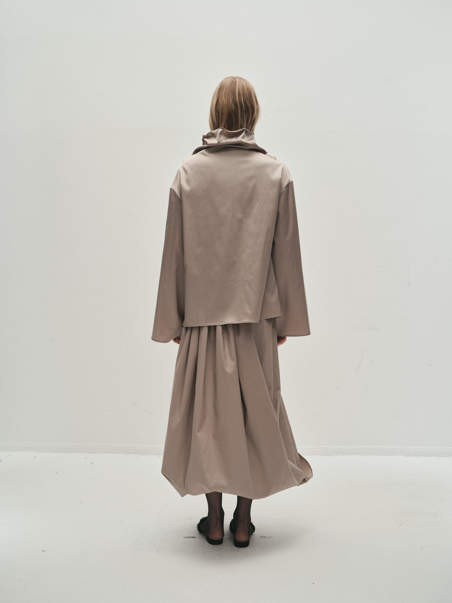 Satin-like texture with a glossy finish. High collar with a wavy trim. Flared long-sleeves