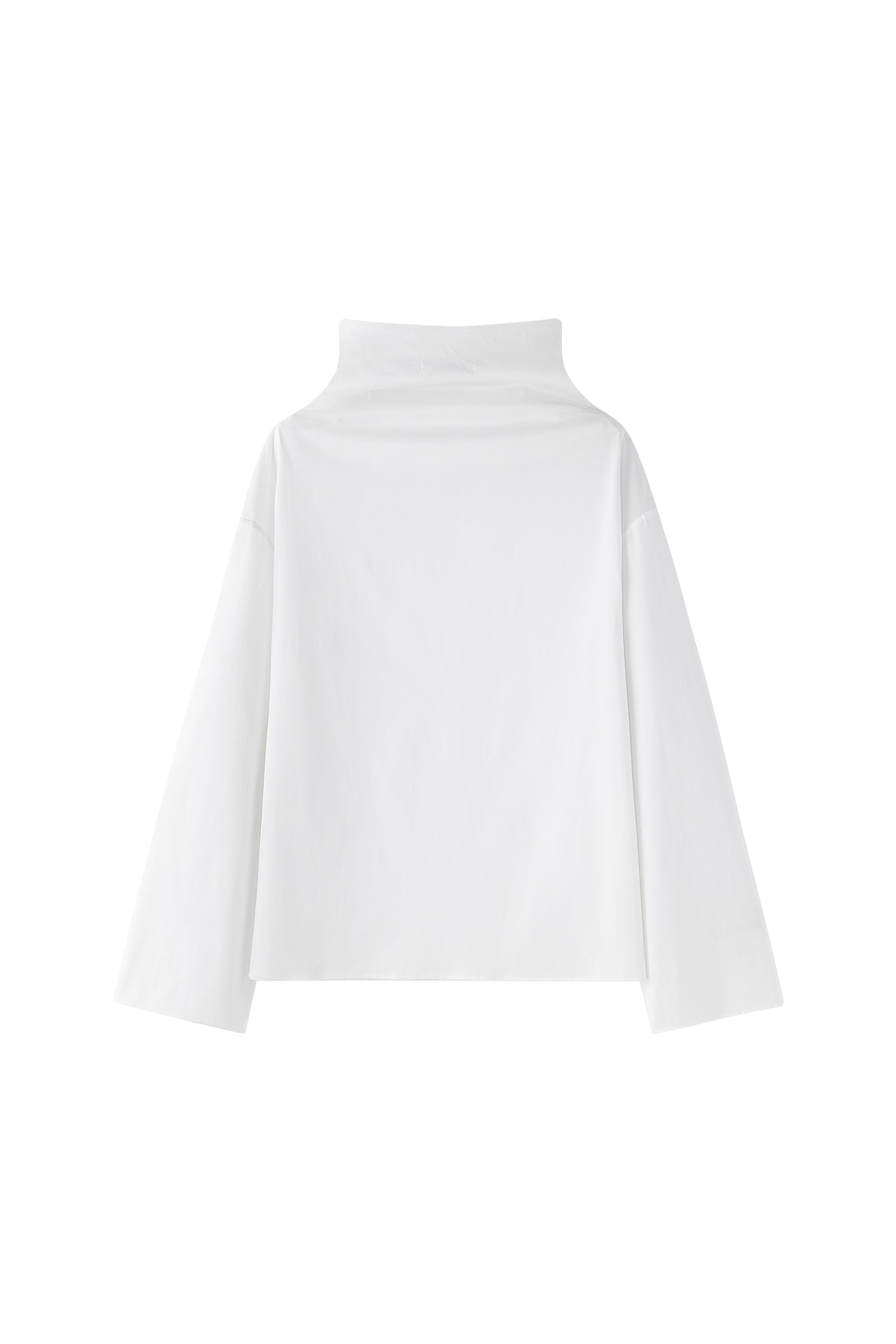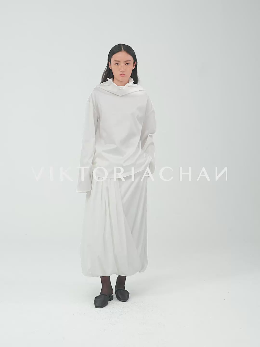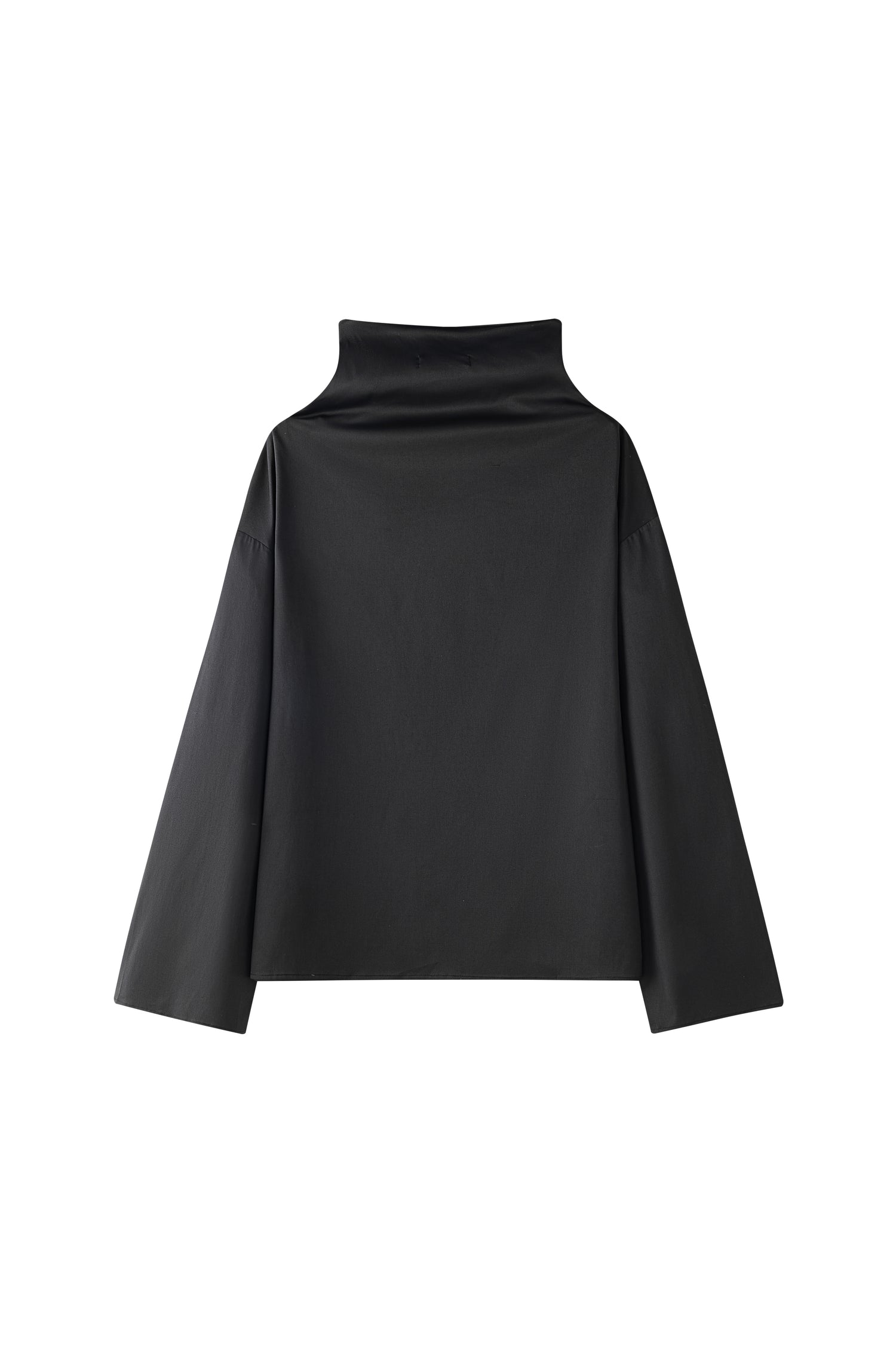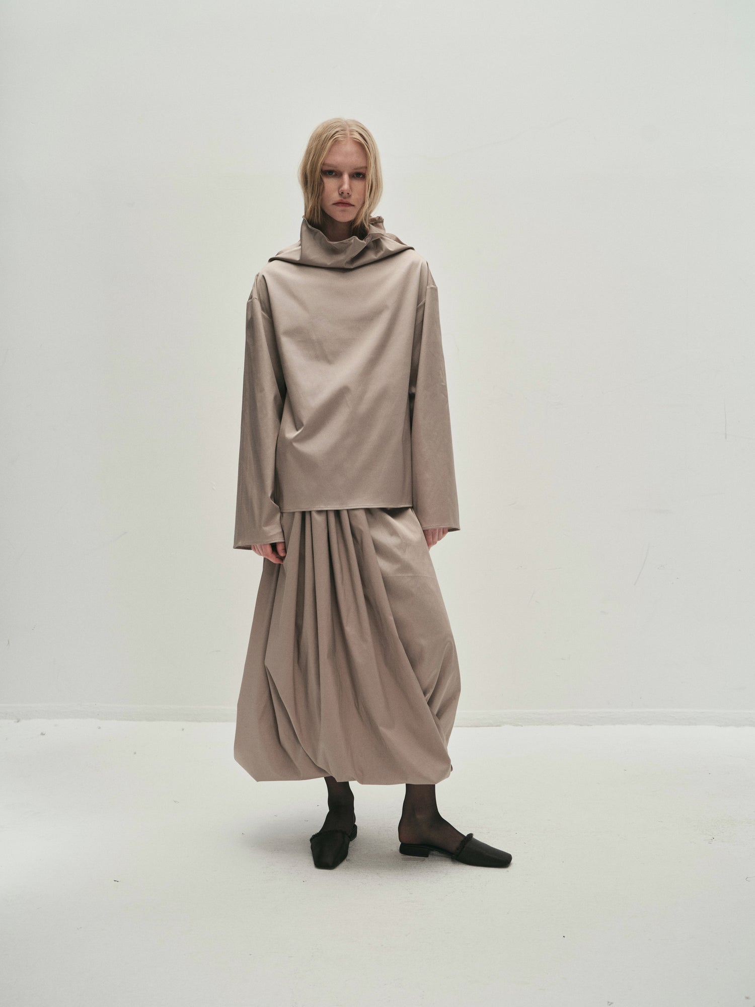 Satin-like texture with a glossy finish. High collar with a wavy trim. Flared long-sleeves