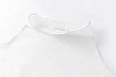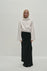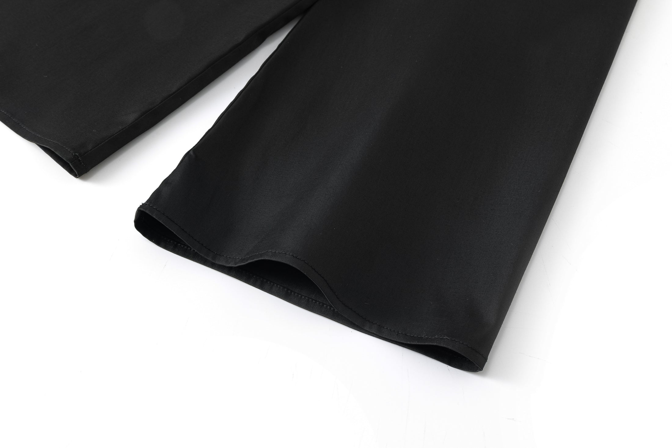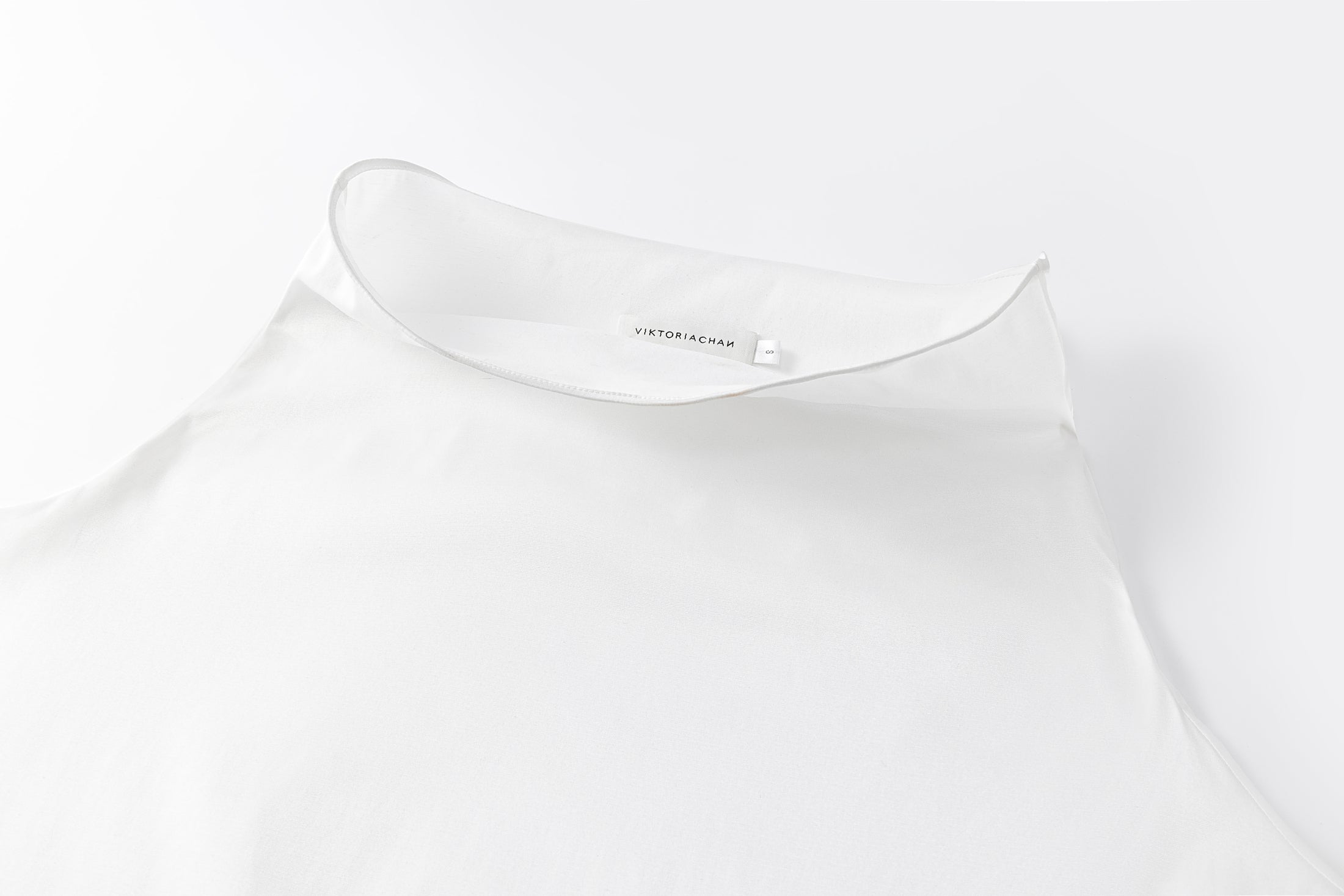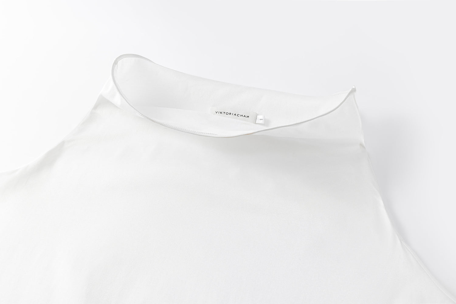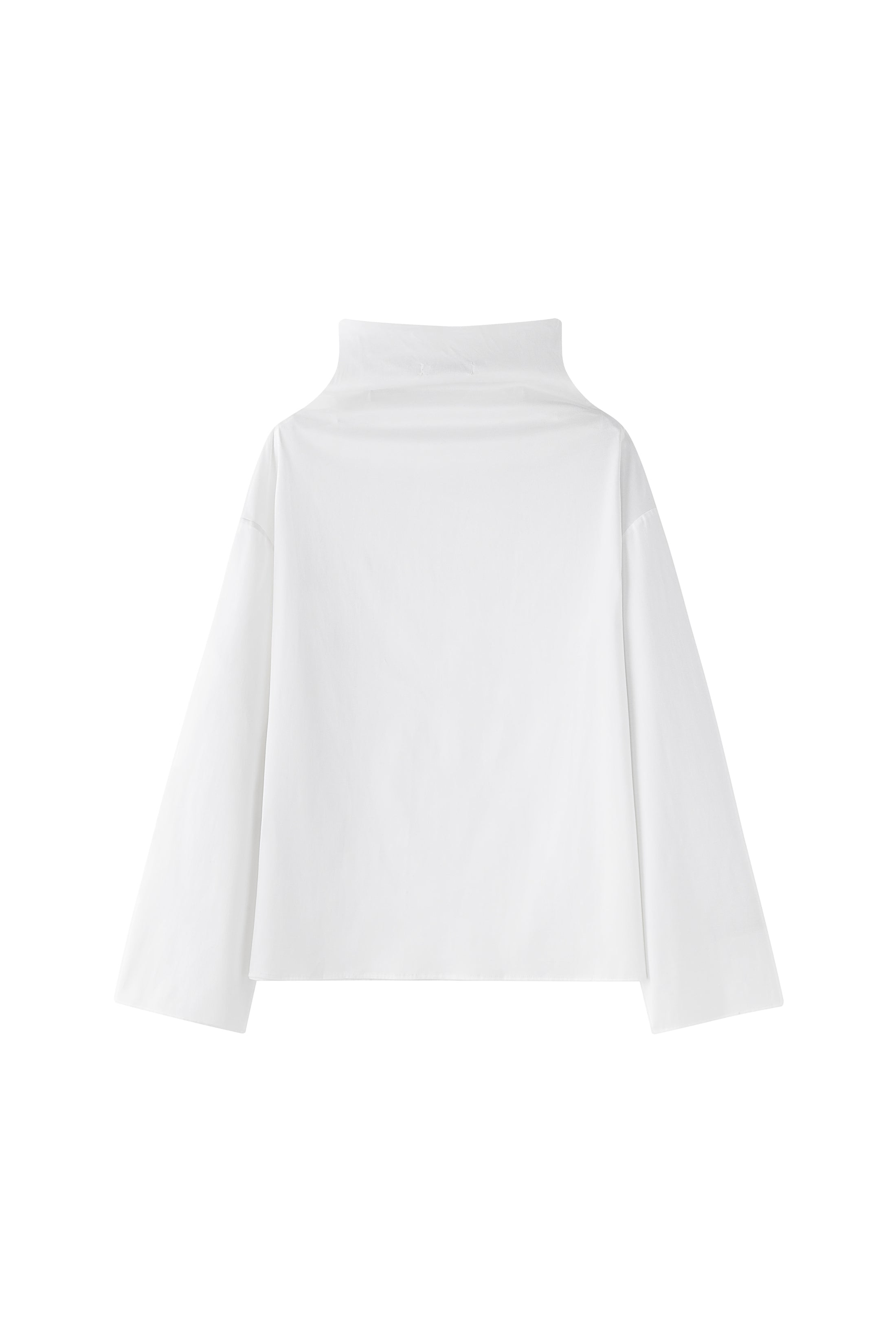 Satin-like texture with a glossy finish. High collar with a wavy trim. Flared long-sleeves
