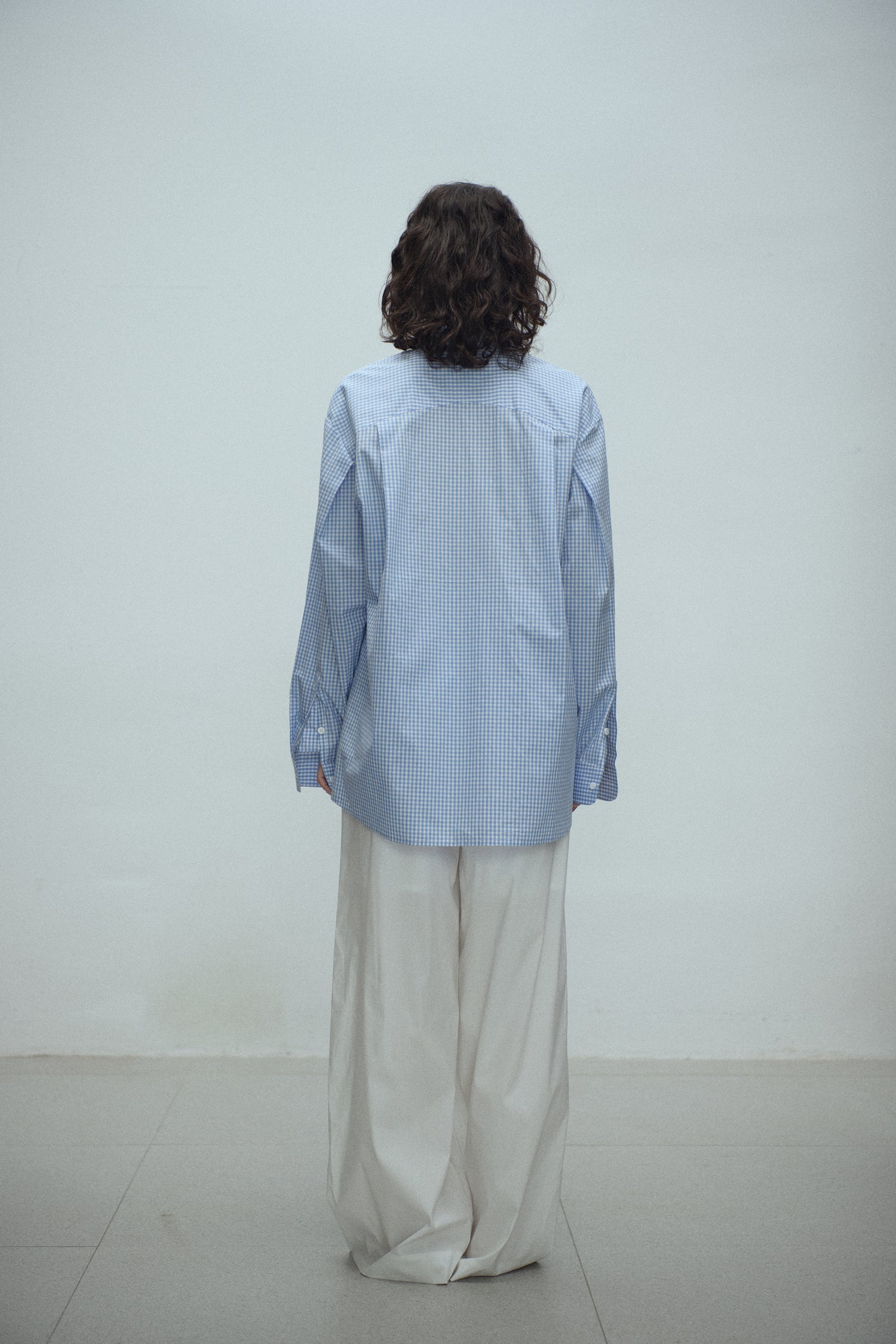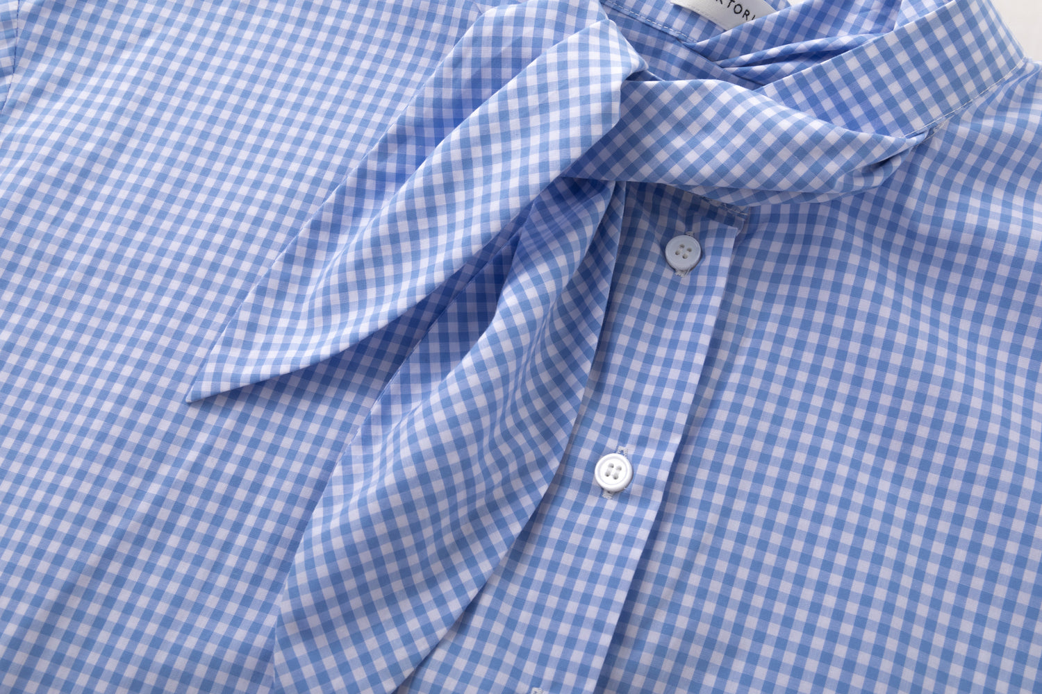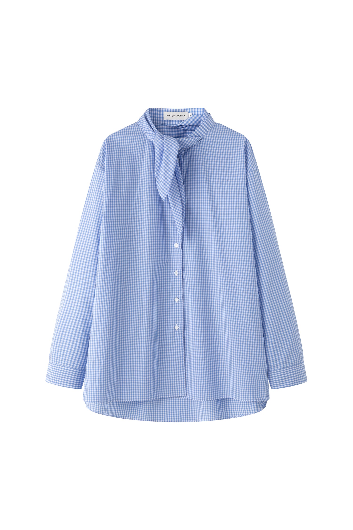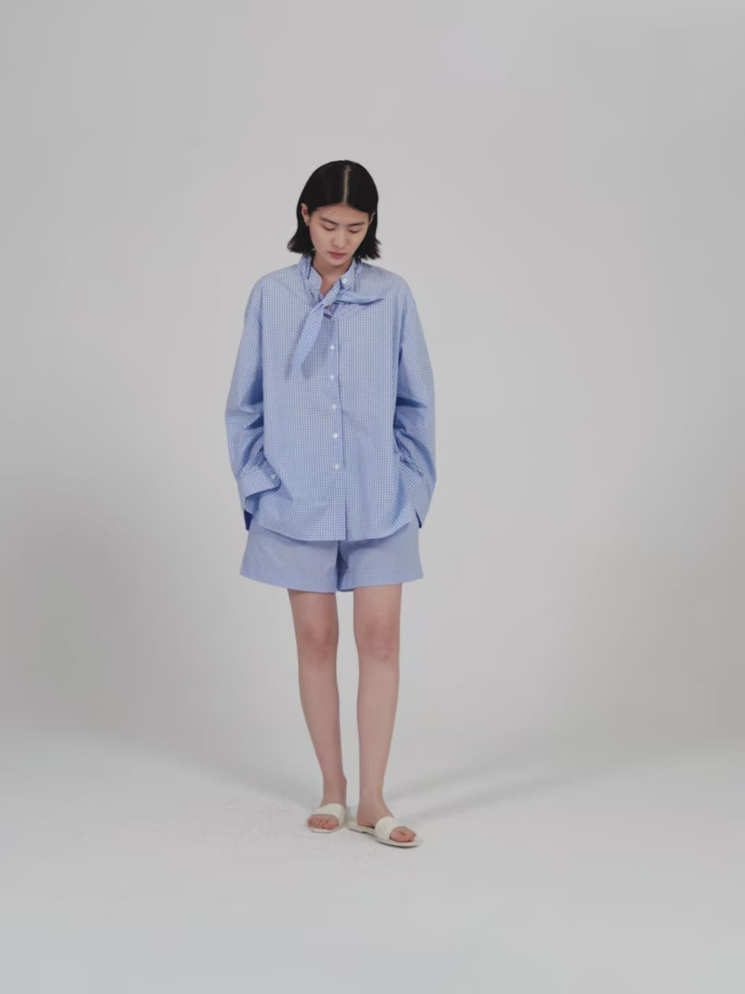 100% cotton light Vichy blue shirt with a Mao collar. Extra fabric at the neckline can be tied into a knot around the neck. The shirt features small white buttons down the front.