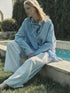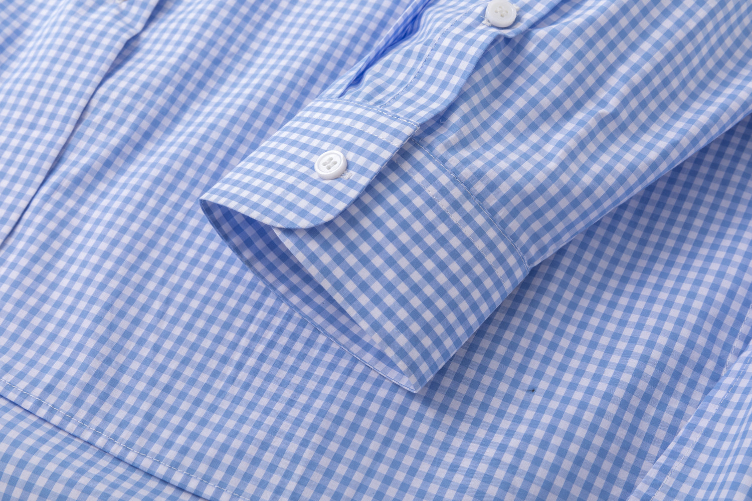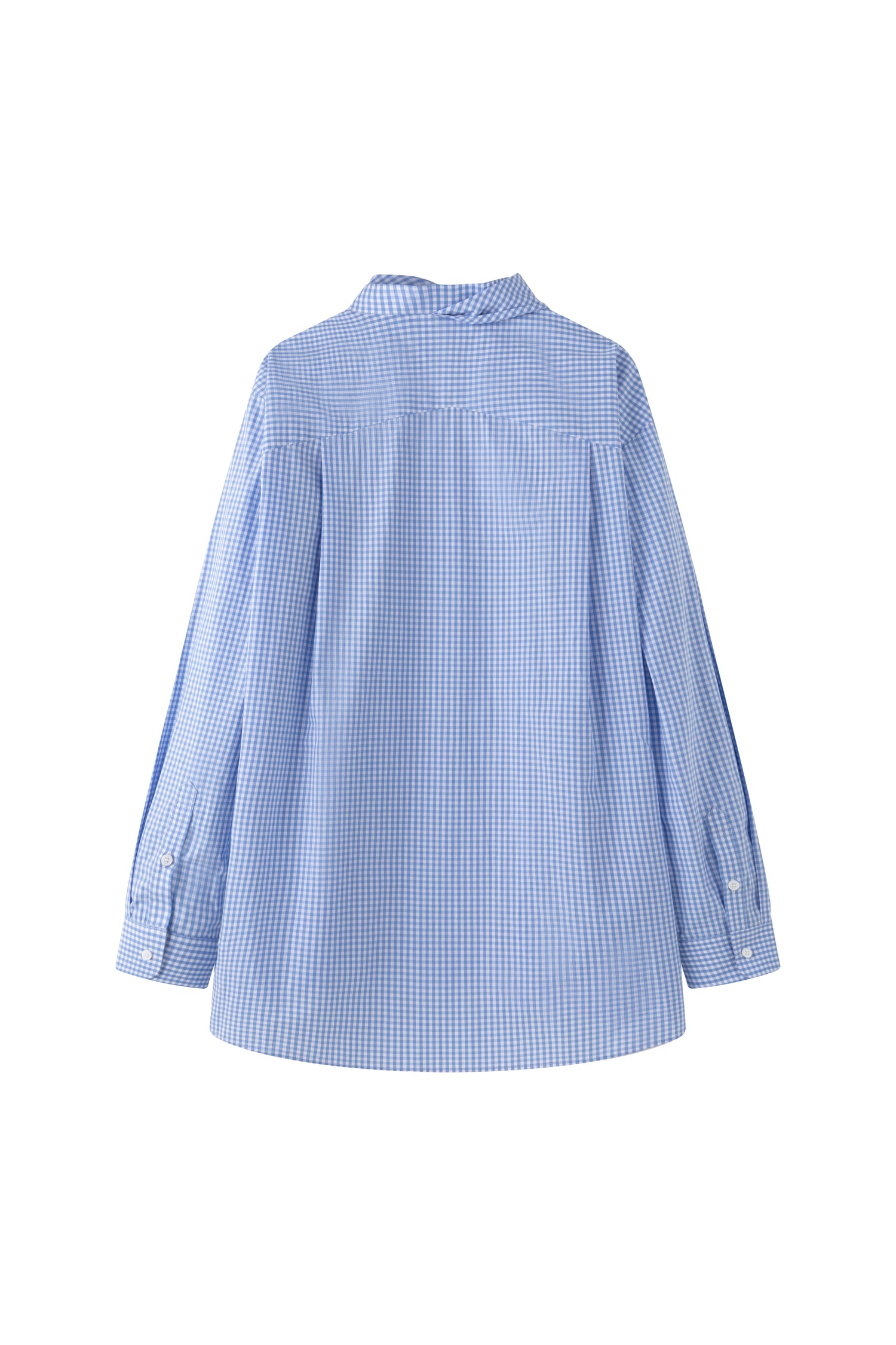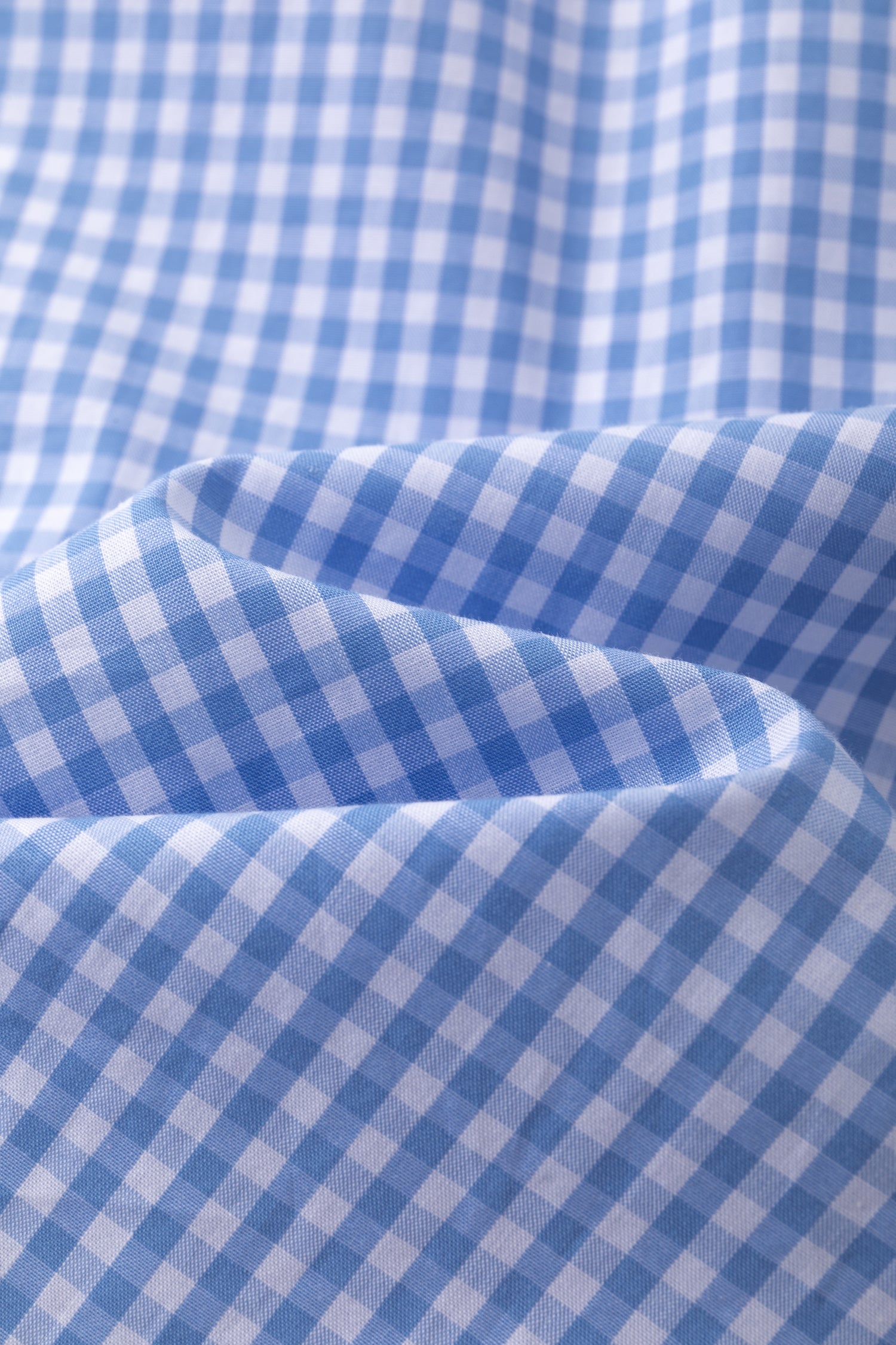 100% cotton light Vichy blue shirt with a Mao collar. Extra fabric at the neckline can be tied into a knot around the neck. The shirt features small white buttons down the front.