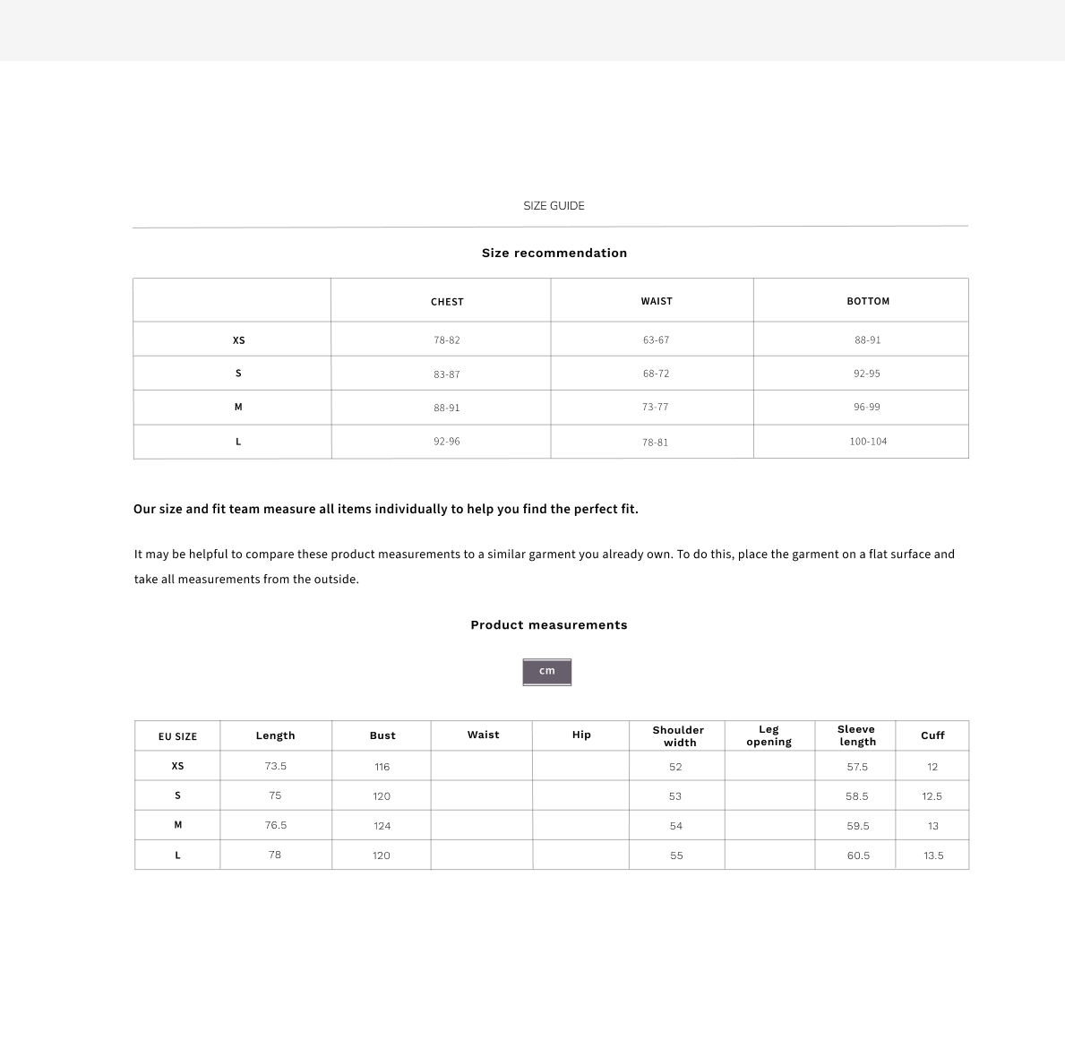 The model is 1.76 m tall and wears a size S. For more detailed sizing information, please consult our size charts.