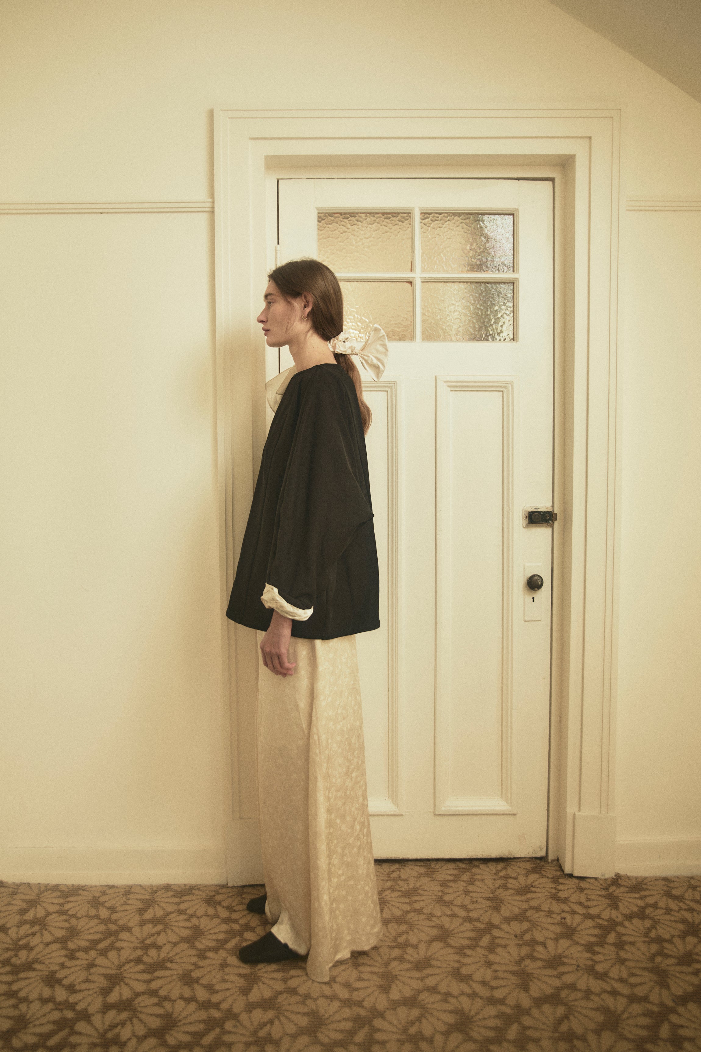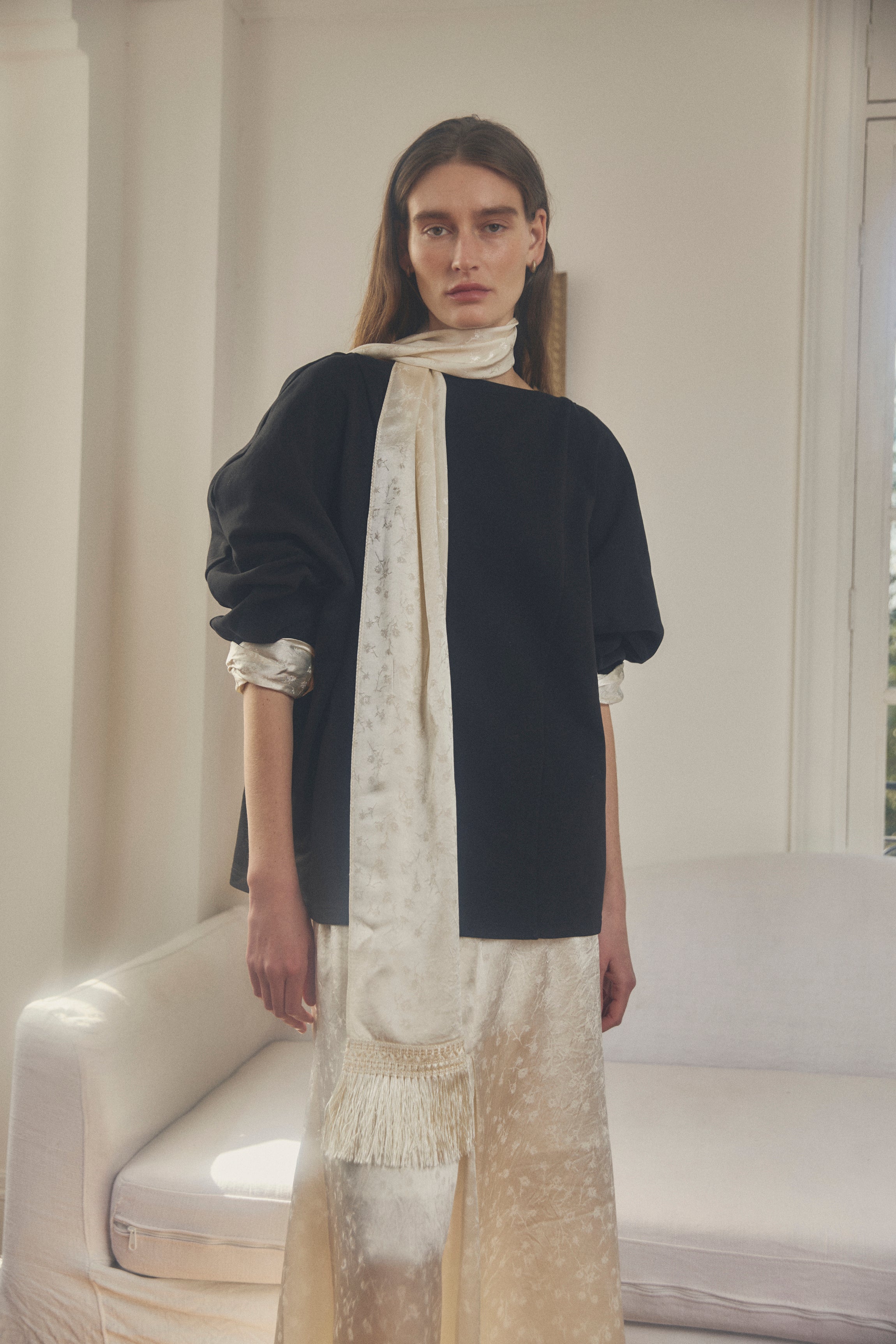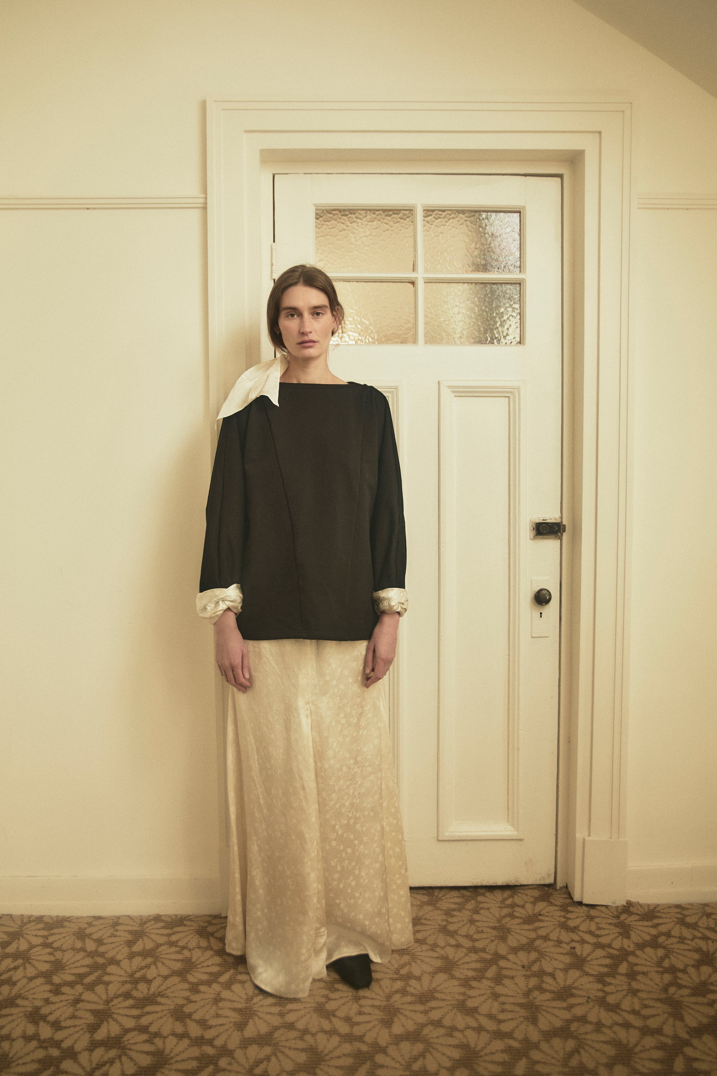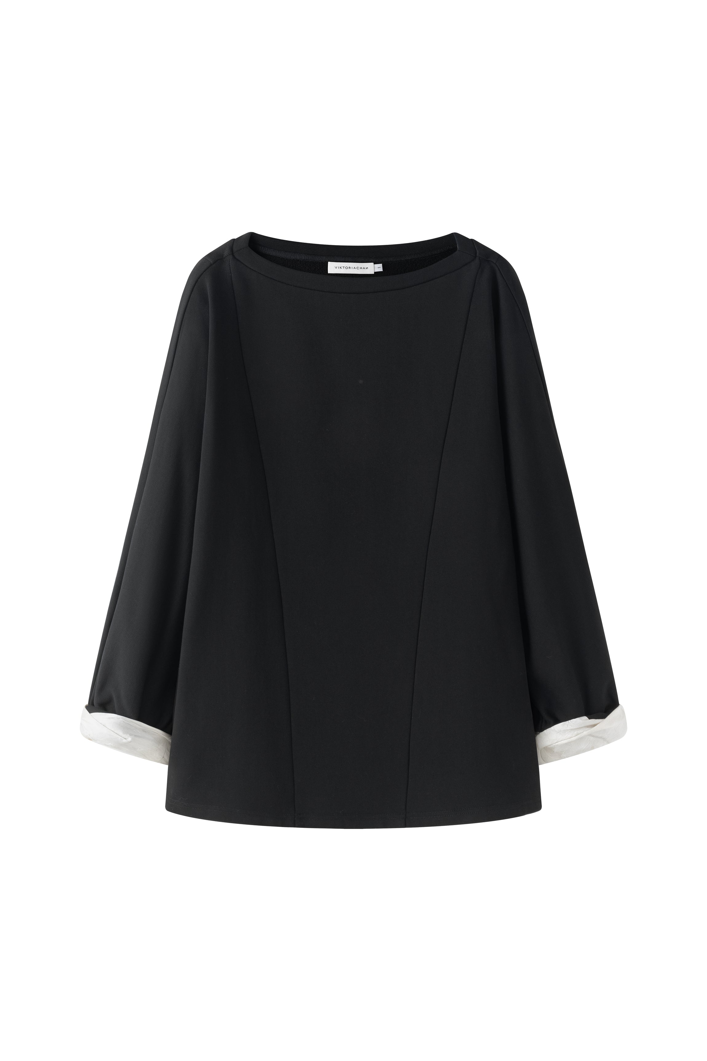 Oversized cotton pullover with slightly draping sleeves and rolled cuffs lined in soft champagne satin-finish. A panel-like seam runs down the center, and the pullover has a straight, hi...