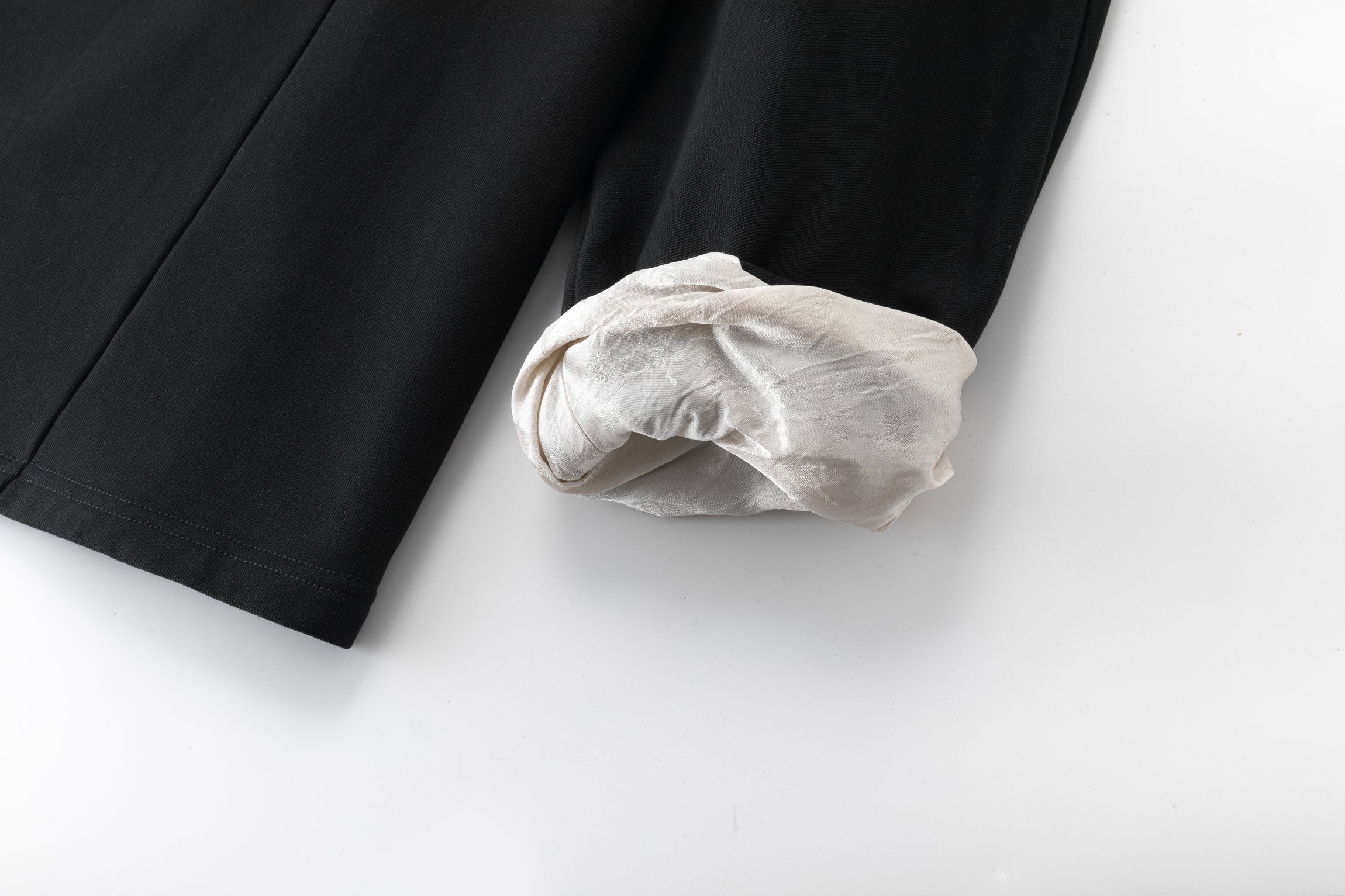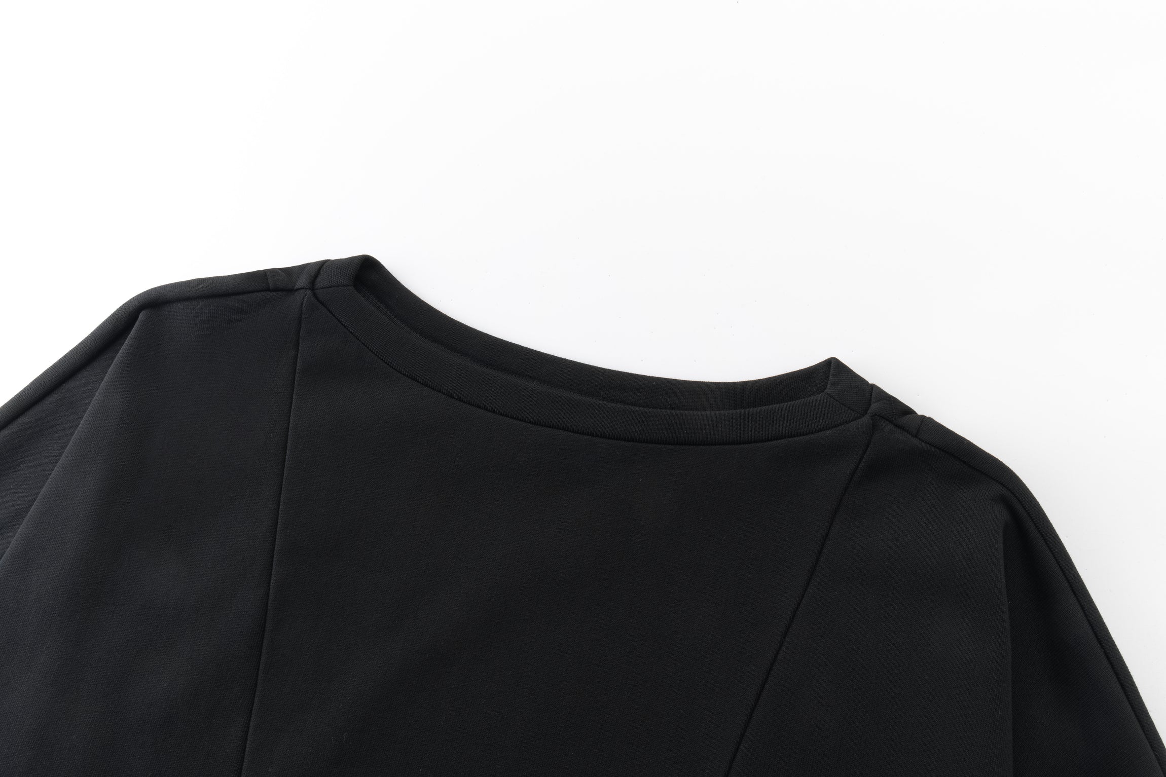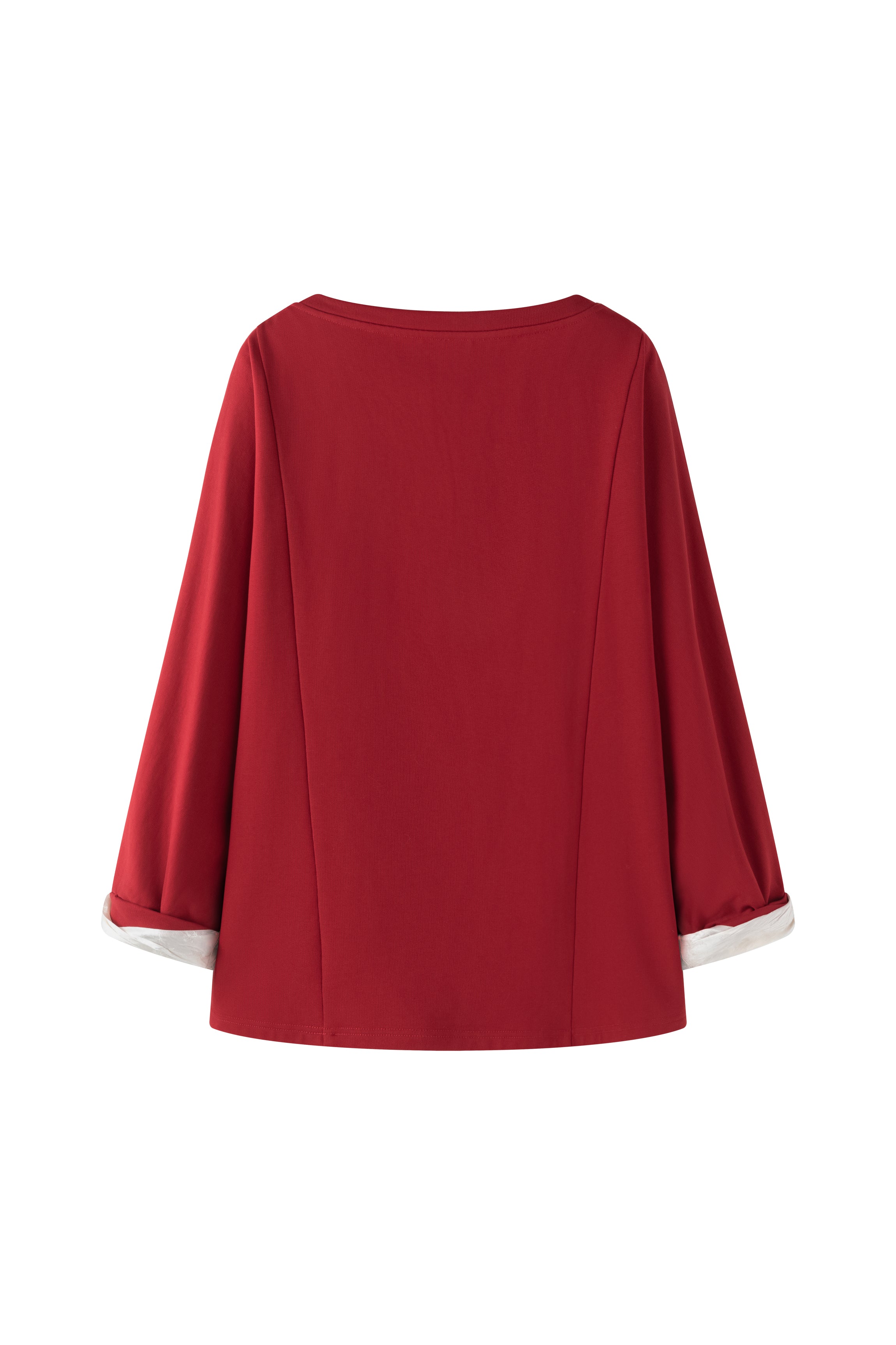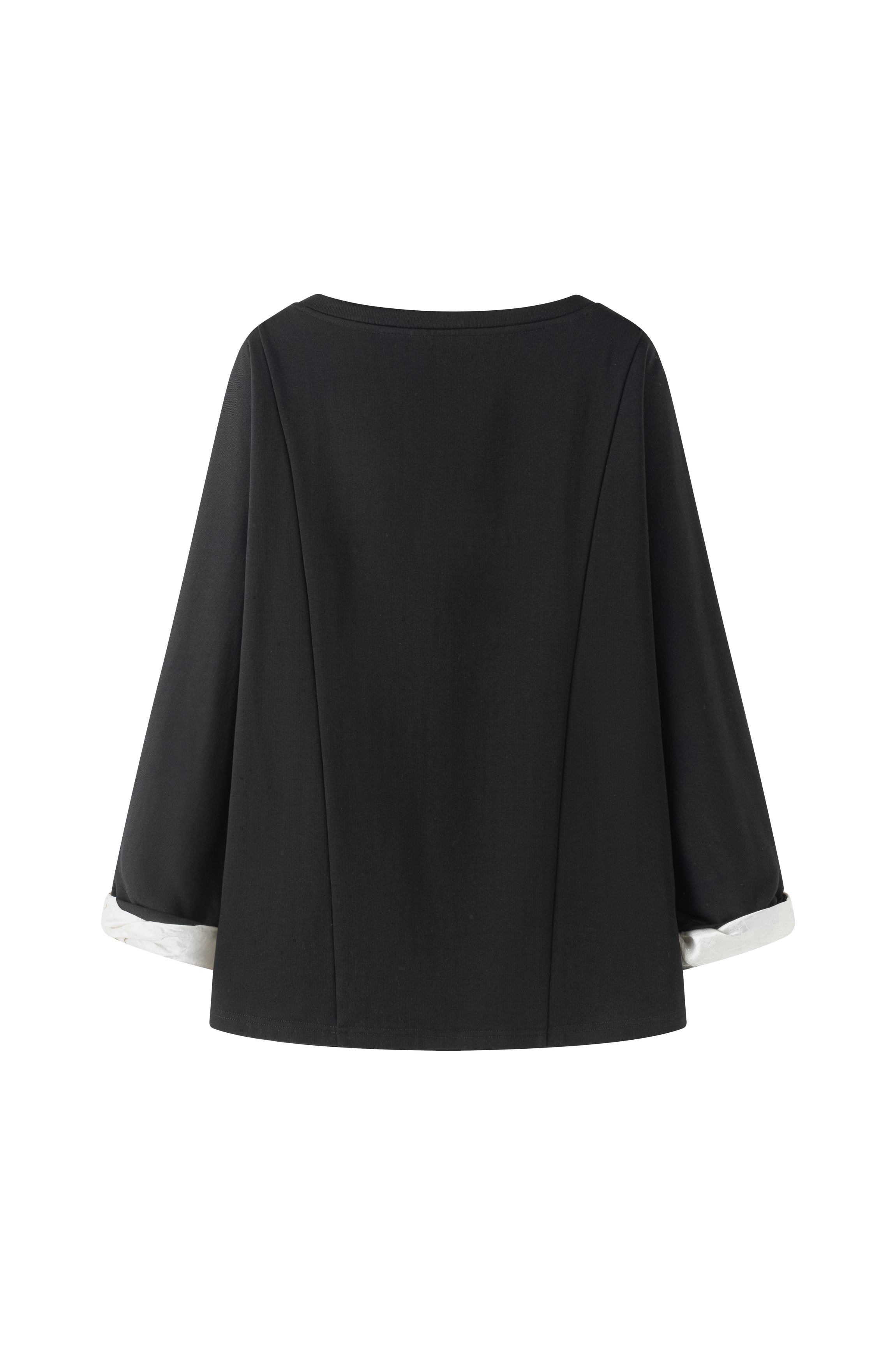 Oversized cotton pullover with slightly draping sleeves and rolled cuffs lined in soft champagne satin-finish. A panel-like seam runs down the center, and the pullover has a straight, hi...