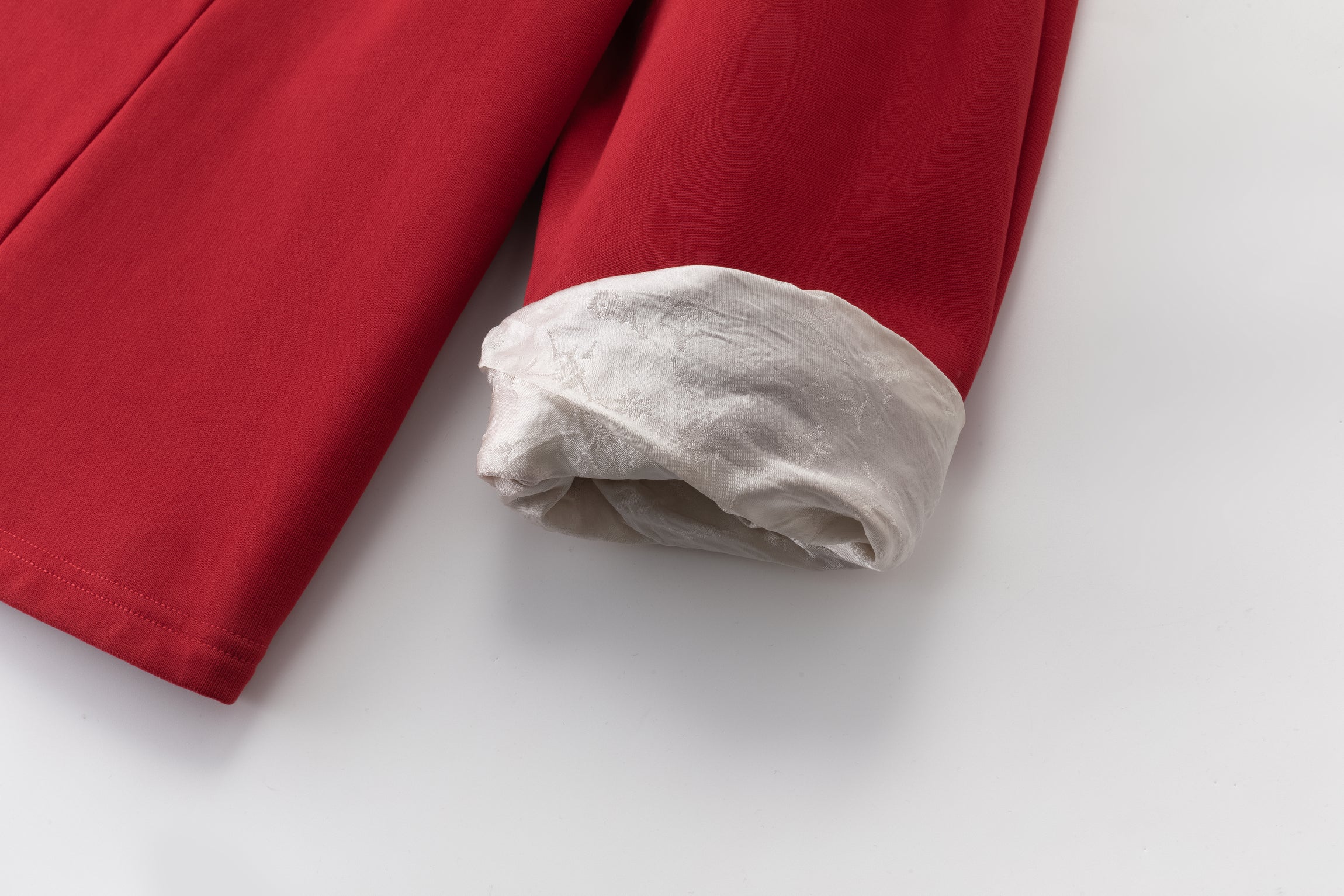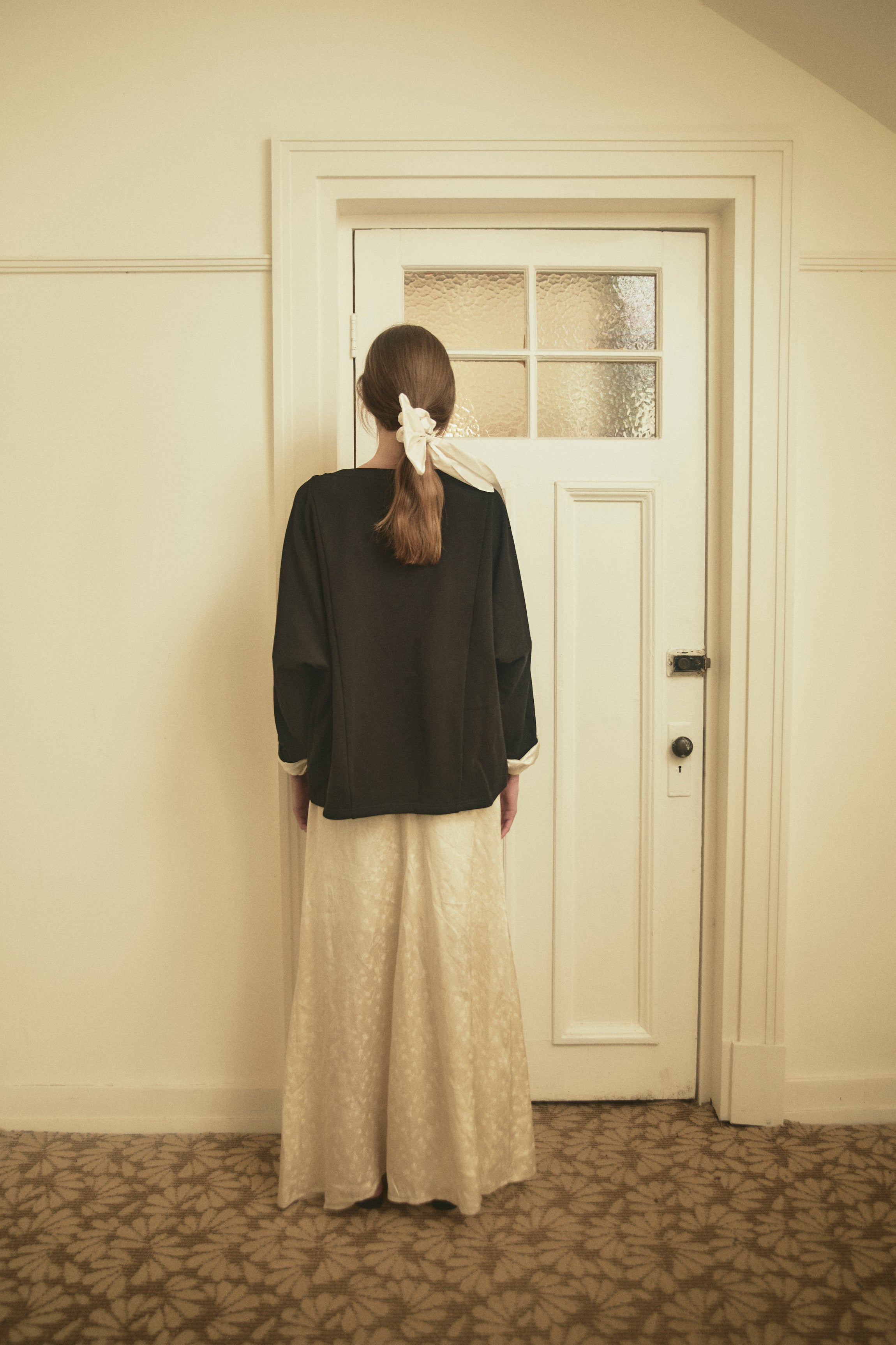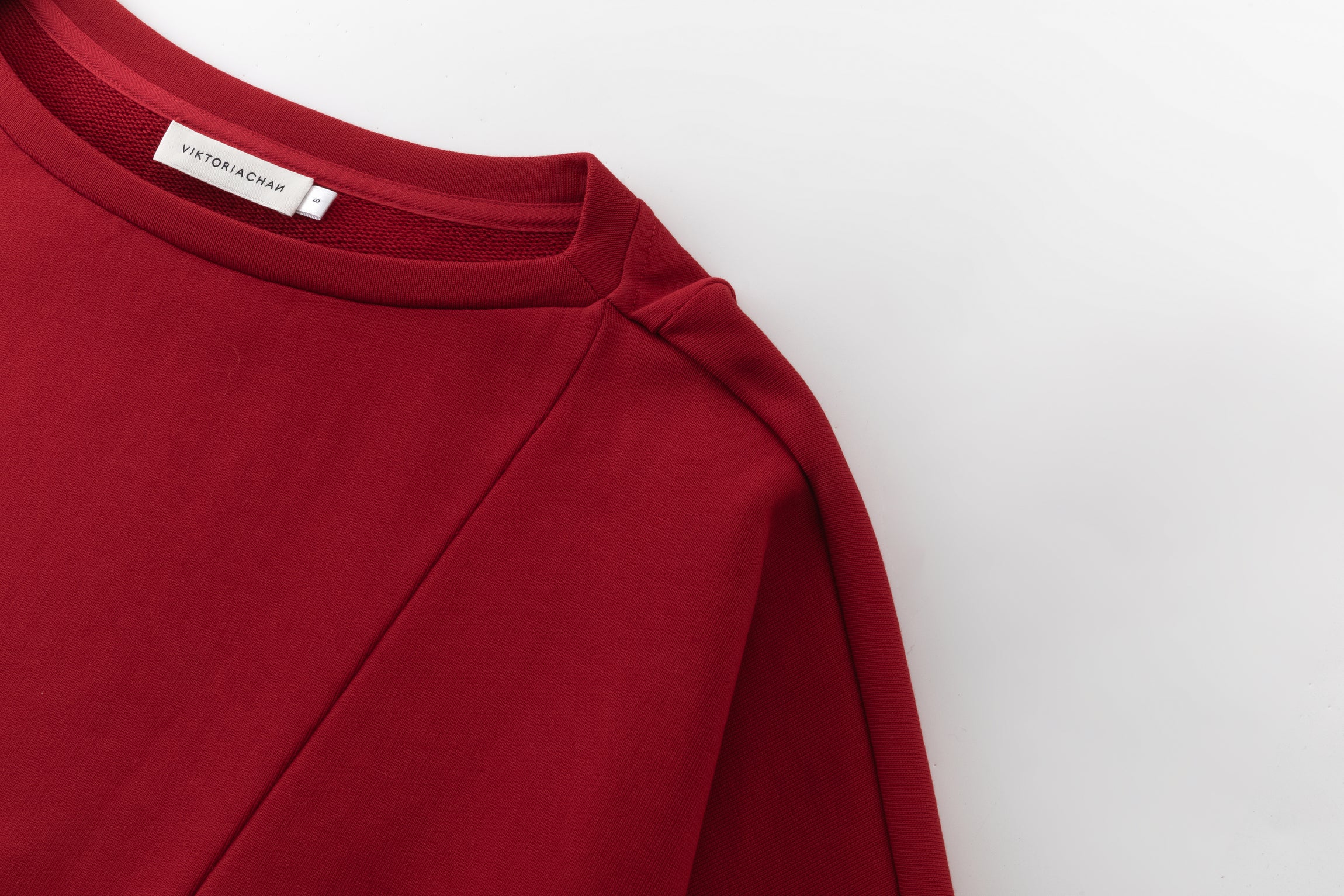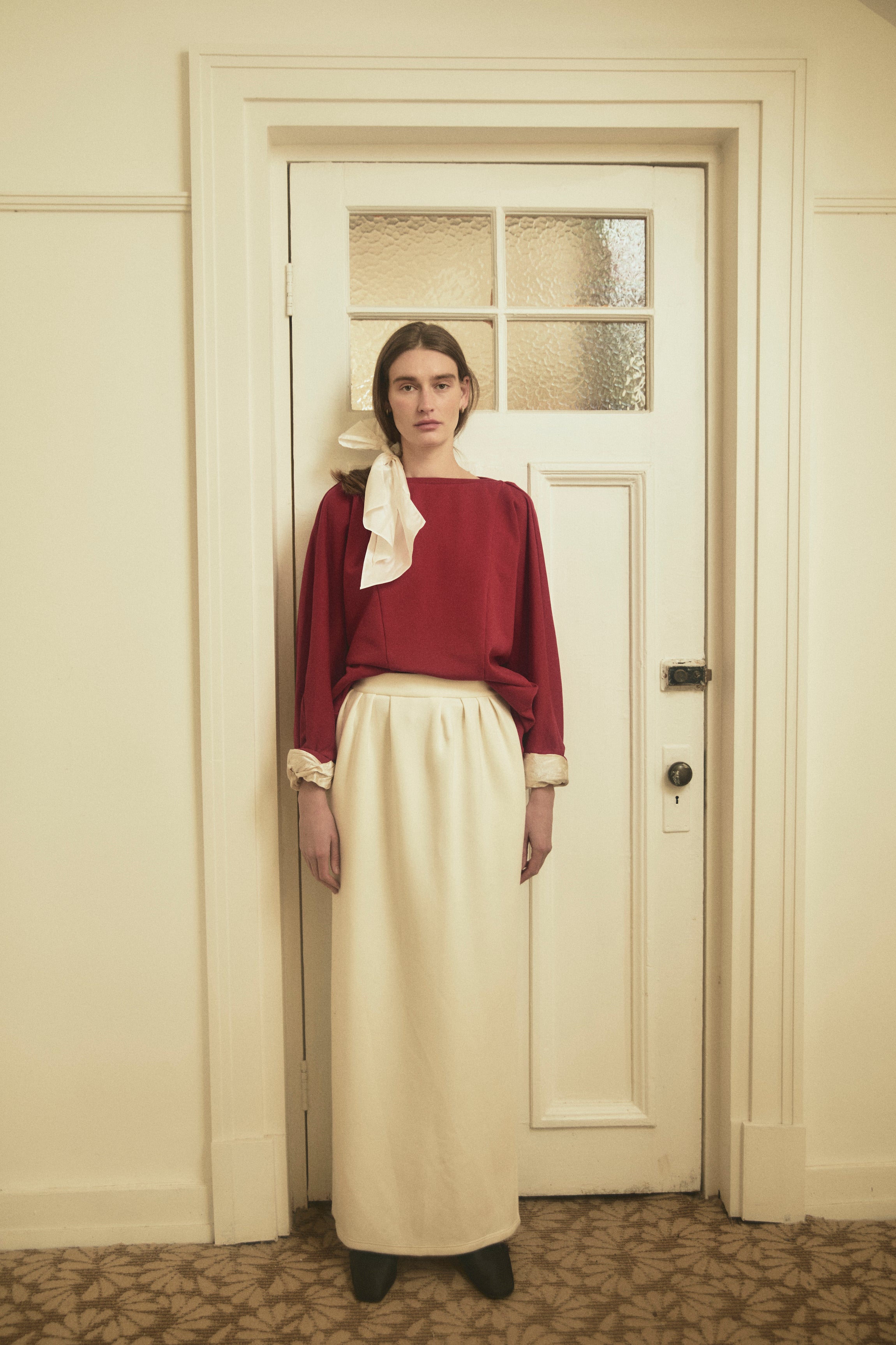 Oversized cotton pullover with slightly draping sleeves and rolled cuffs lined in soft champagne satin-finish. A panel-like seam runs down the center, and the pullover has a straight, hi...