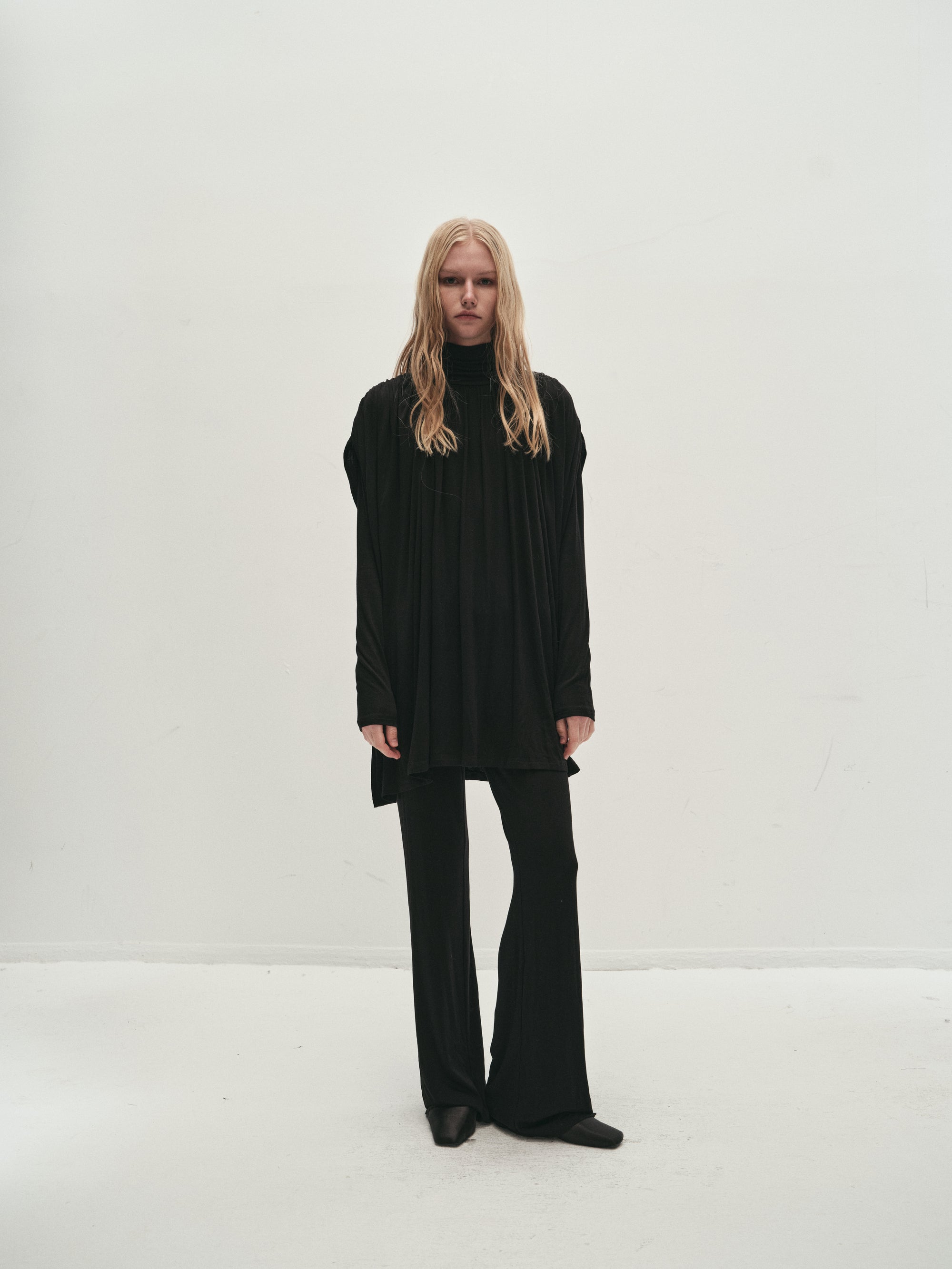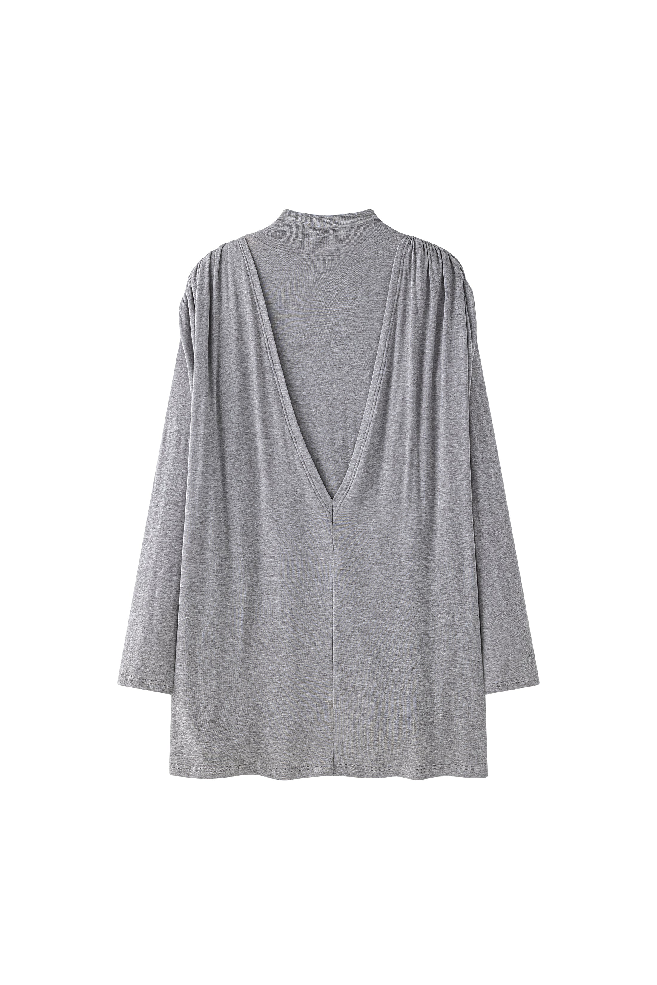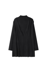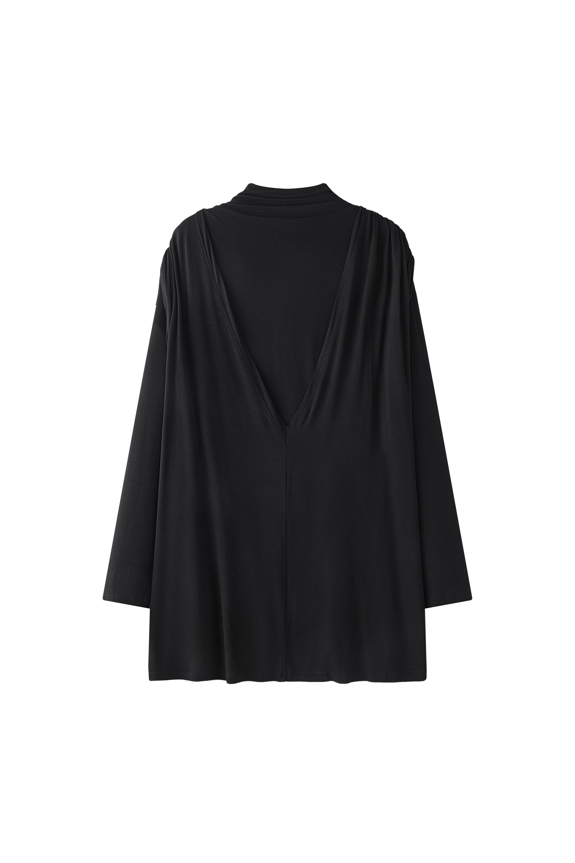 Double layer blouse with a turtleneck and fitted long sleeves. The flowy fabric is gathered at the waist with a string belt. Flowing, draped look, with a very deep V-neck opening at the ...