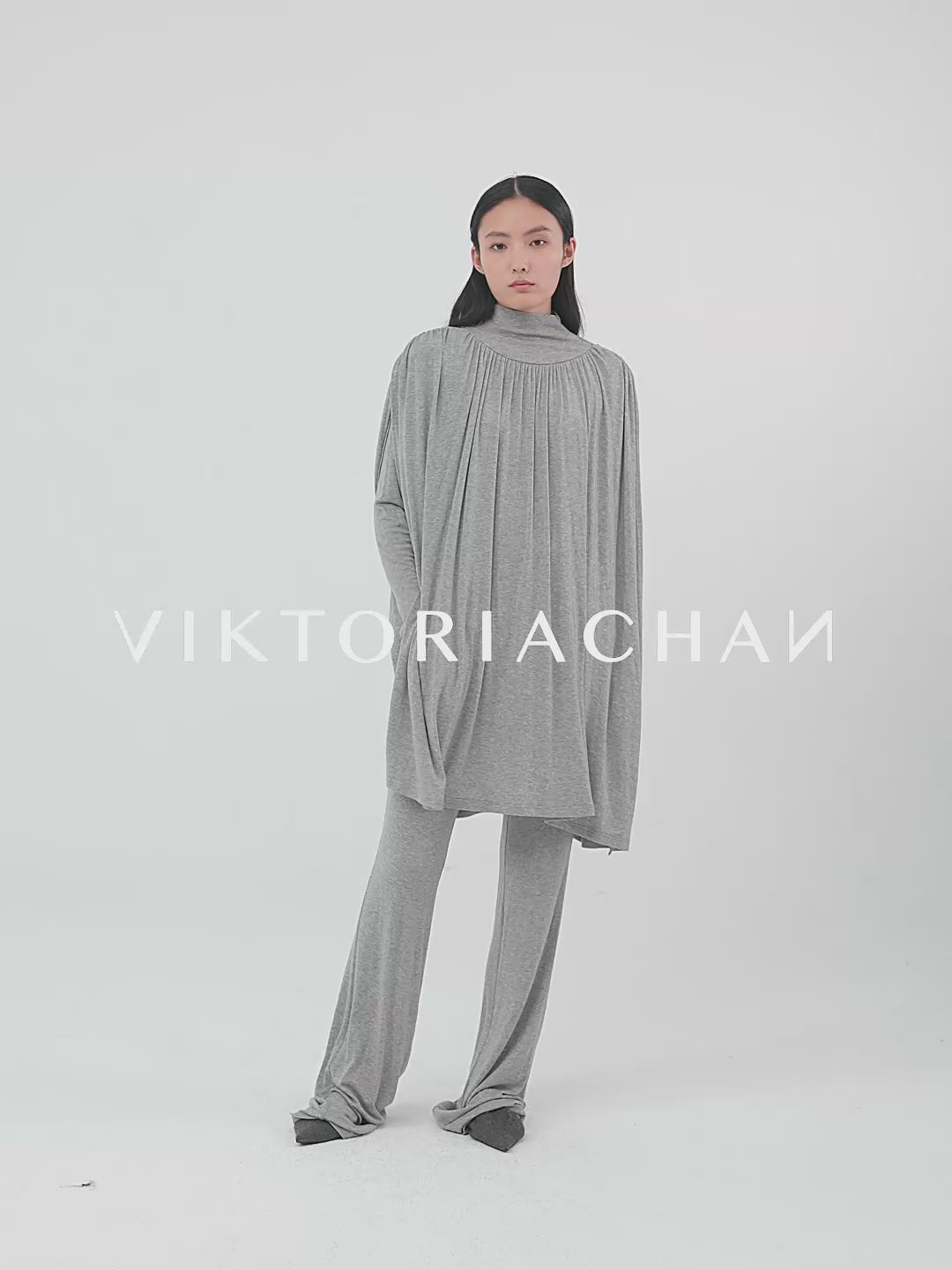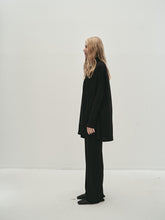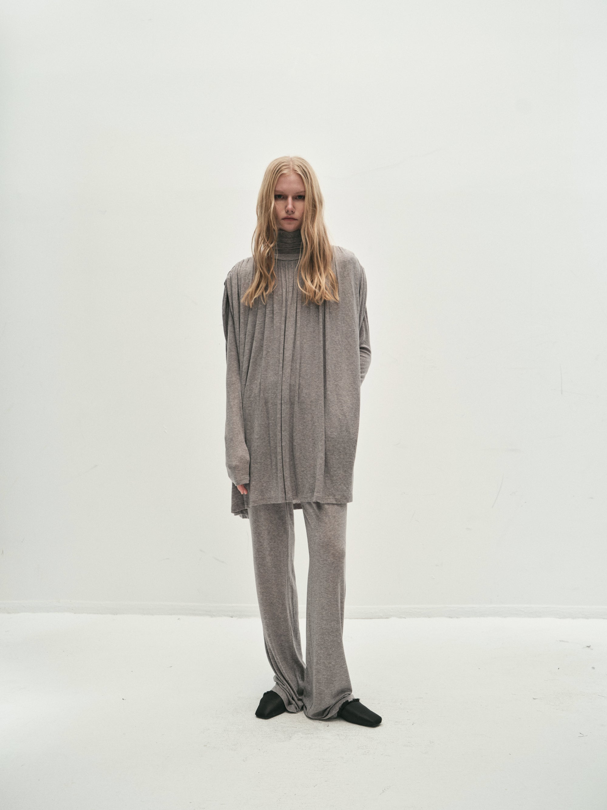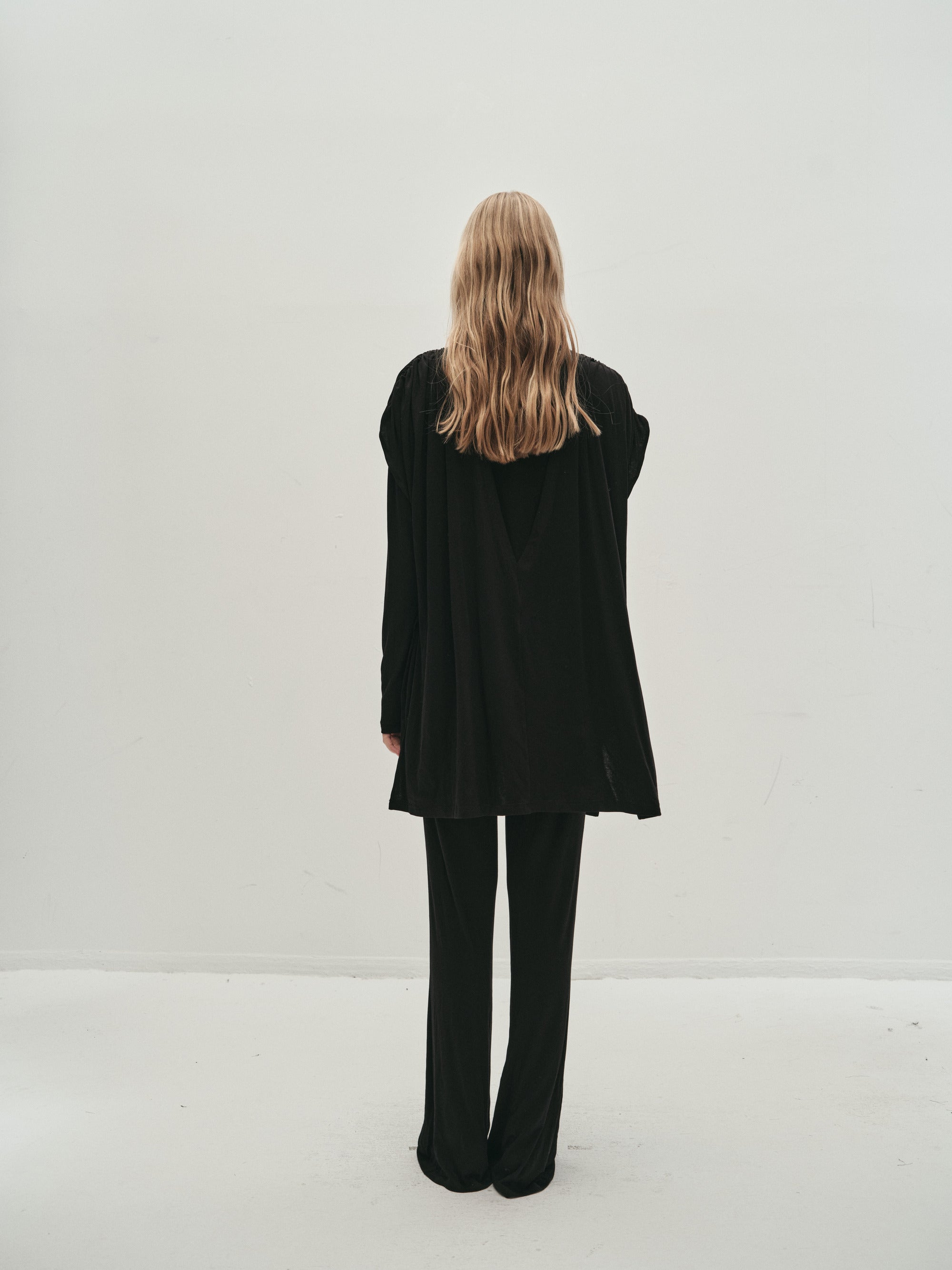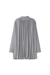 Double layer blouse with a turtleneck and fitted long sleeves. The flowy fabric is gathered at the waist with a string belt. Flowing, draped look, with a very deep V-neck opening at the ...